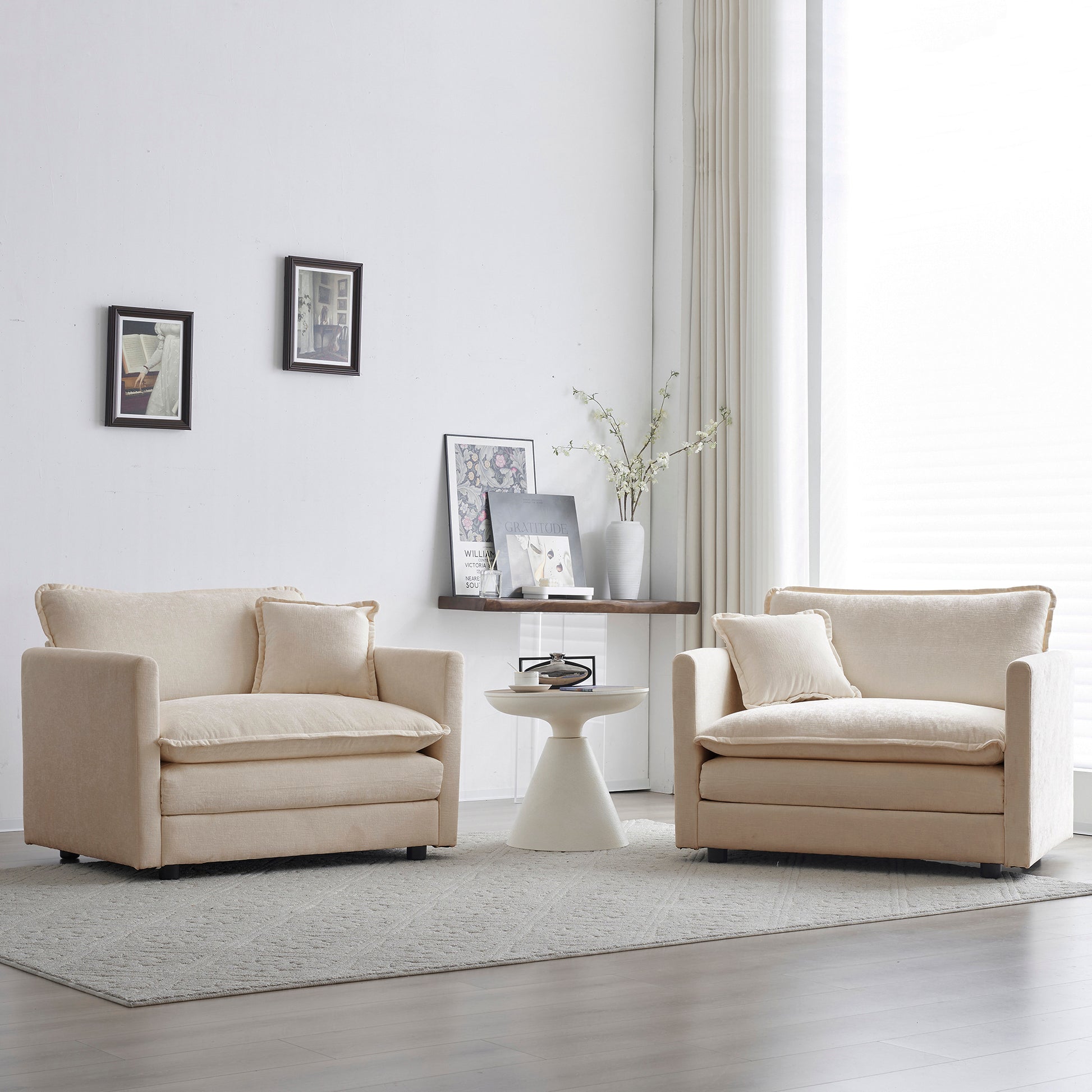 The Fremont 2 Piece Chenille Armchair Accent Chair Set features deep, wide seats, soft beige chenille upholstery, and matching toss pillows. With a modern modular design and plush comfort, these chairs are perfect for living rooms, bedrooms, or home offices.