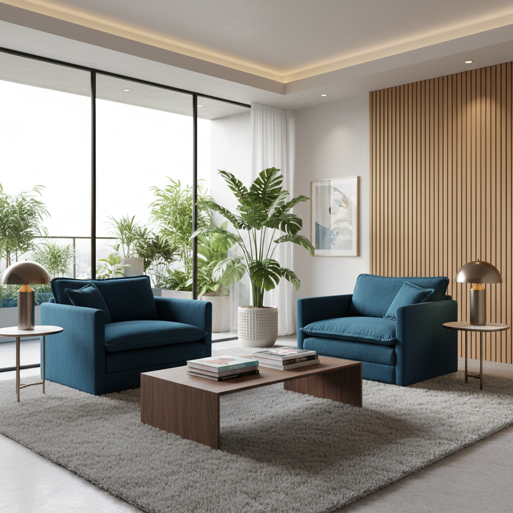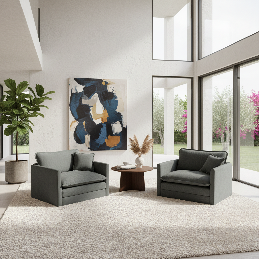 The Fremont 2 Piece Chenille Armchair Accent Chair Set features deep, wide seats, soft chenille upholstery, and matching toss pillows. With a modern modular design and plush comfort, these chairs are perfect for living rooms, bedrooms, or home offices.