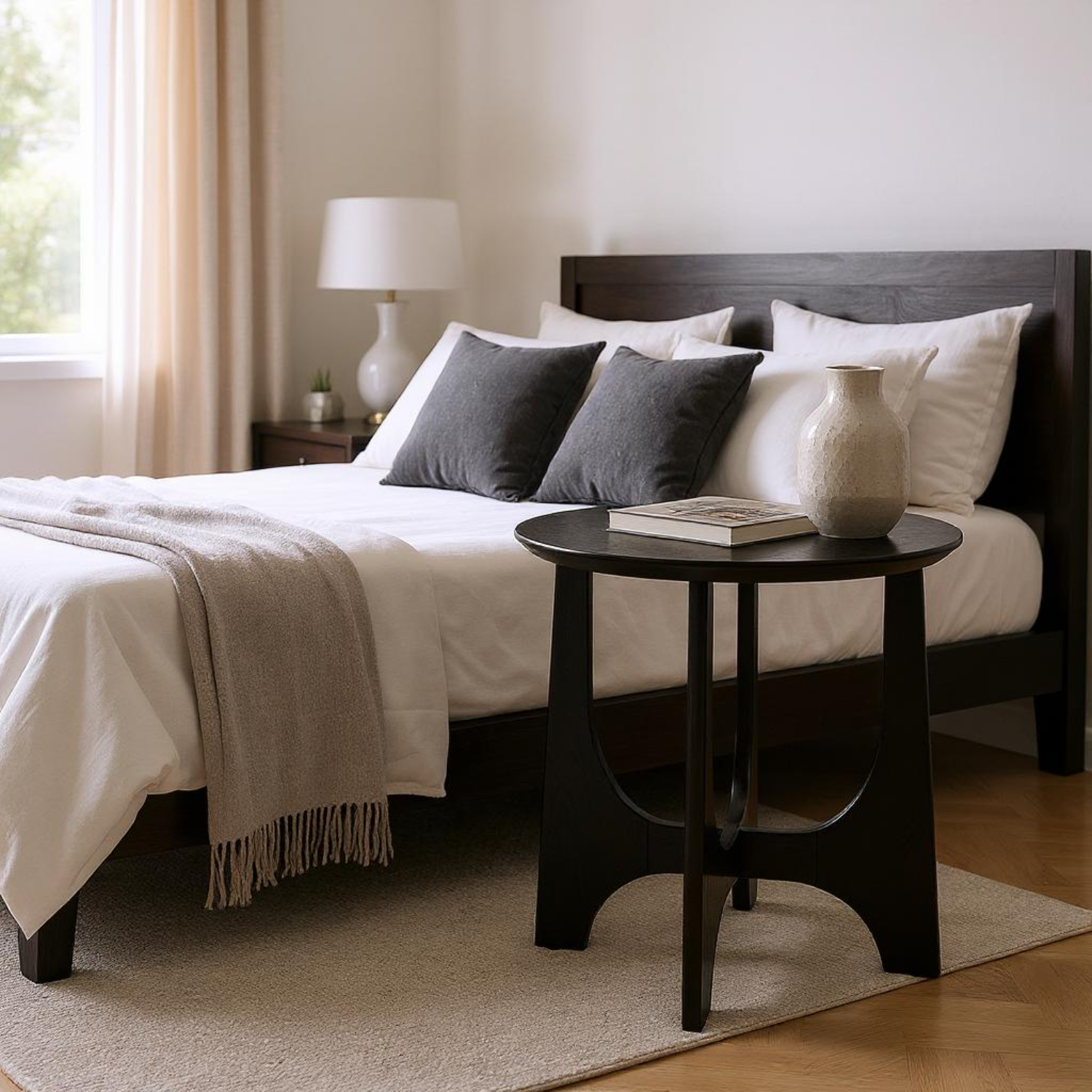 25" round black wood end table with modern cross legs and visible wood grain, blends seamlessly into any room style with a sleek yet sturdy design.