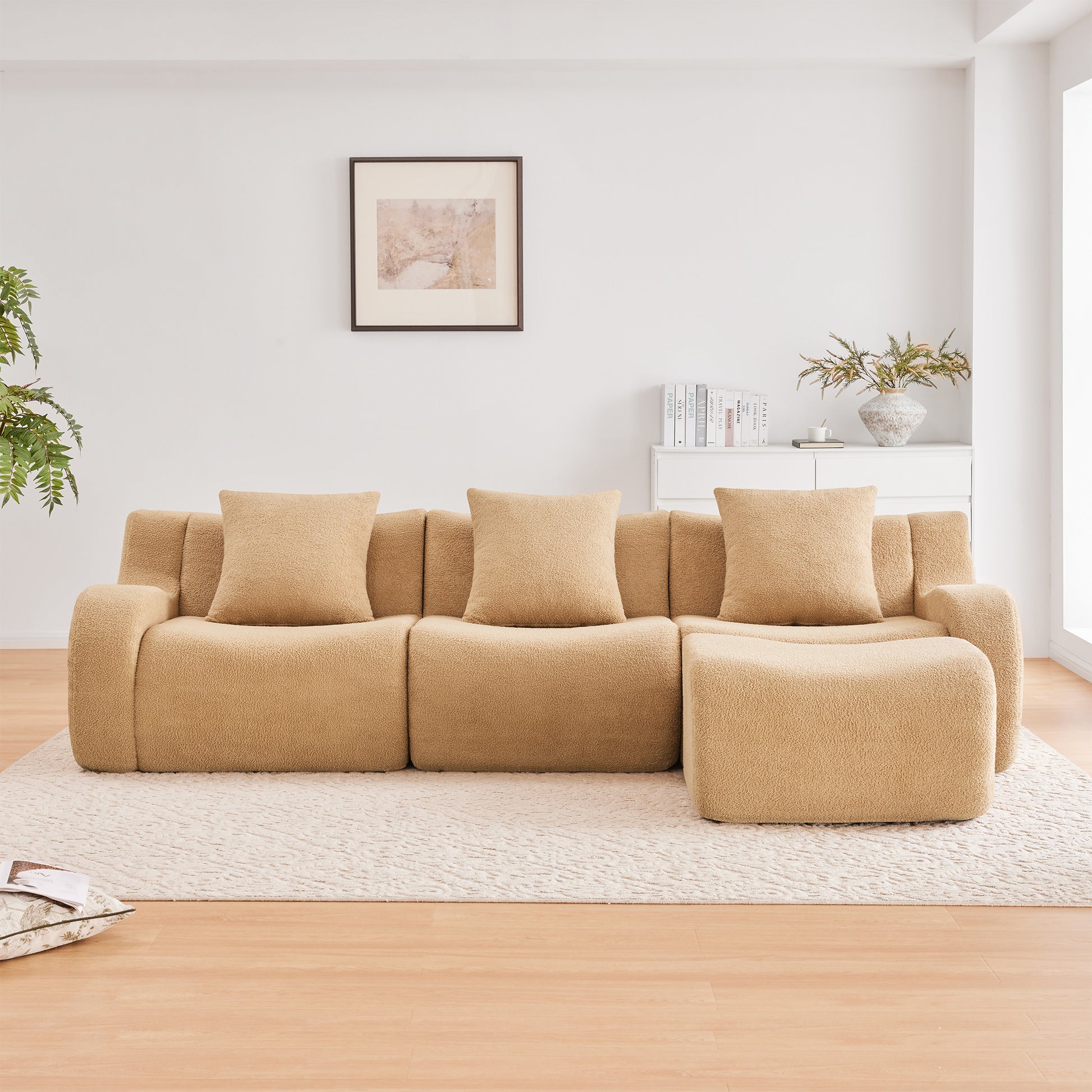 Chico 115" Modular Teddy Fabric L-Shaped Sofa with Curved Armrests and Movable Ottoman