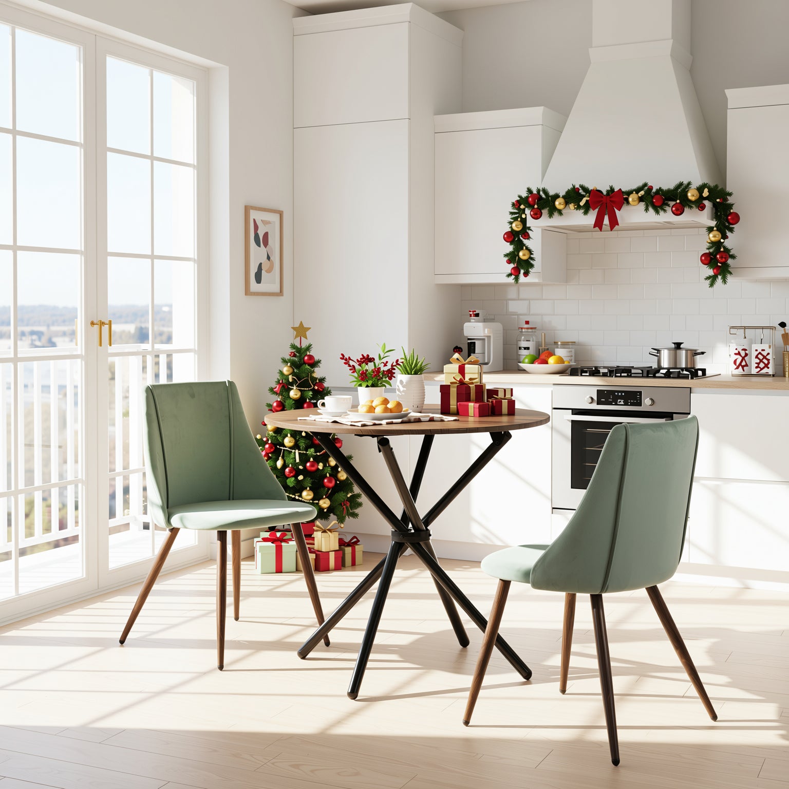 This compact three piece dining set is designed for modern everyday dining in the living room, dining area, apartment, dorm, home, or small space. The round tabletop creates a cozy setting for two, while the sculptural metal pedestal base provides strong and stable support. Two Smeg velvet upholstered chairs offer soft cushioning and supportive backs for comfortable meals, coffee, or casual conversations. Finished in a cactus green tone with a warm wood tabletop, this set brings a fresh Nordic inspired look that fits beautifully in kitchens, breakfast nooks, or café style interiors.