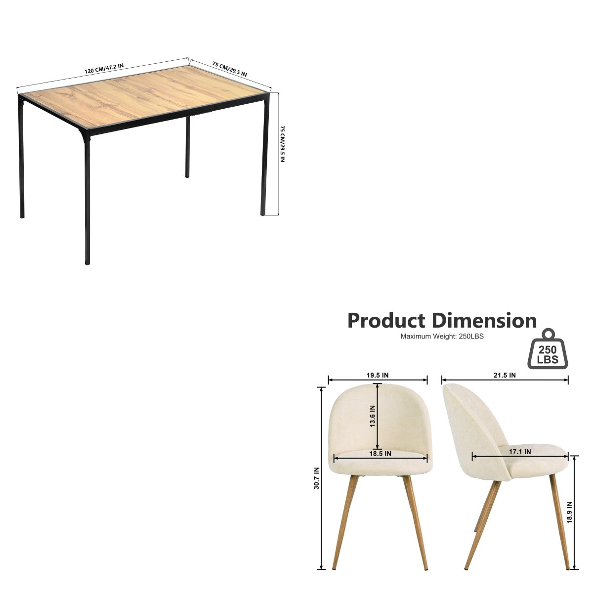 Dimensions: Table 47.24" W x 29.53" D x 29.53" H, Chair 19.49" W x 21.46" D x 30.71" H