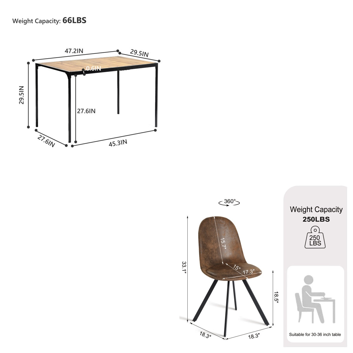 Homy Casa Milliken 5 Piece Dining Table Set 47.2” Table with 4 Sunflower Swivel Brown Upholstered Chairs