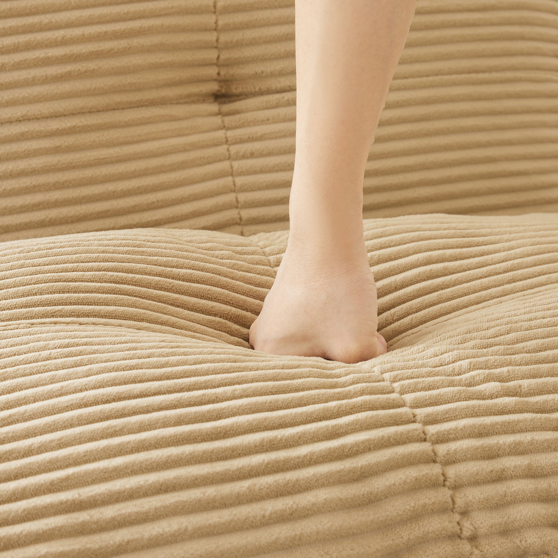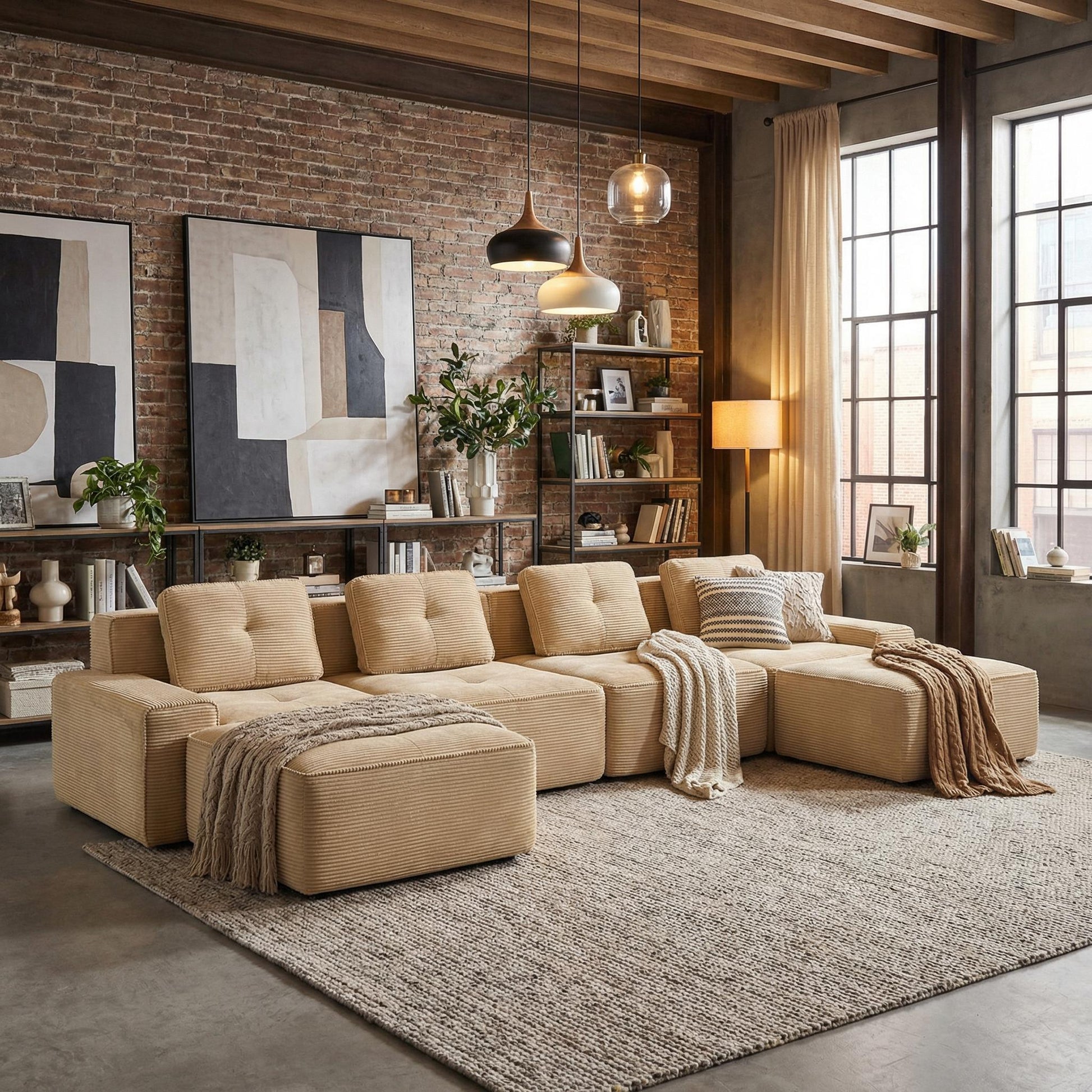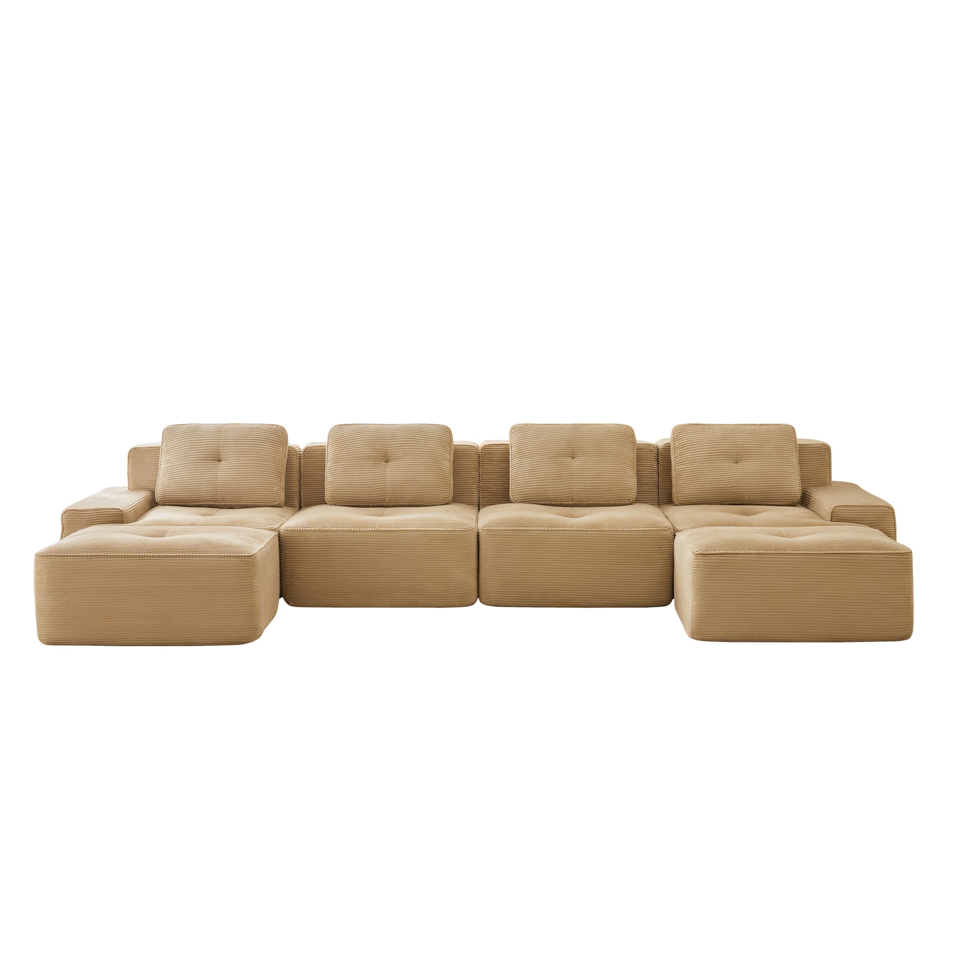 This modern U-shaped sectional sofa in soft corduroy offers deep seating for four, two movable ottomans, and a tufted design. Enjoy plush comfort, flexible modularity, and a no-assembly setup—perfect for contemporary living rooms.