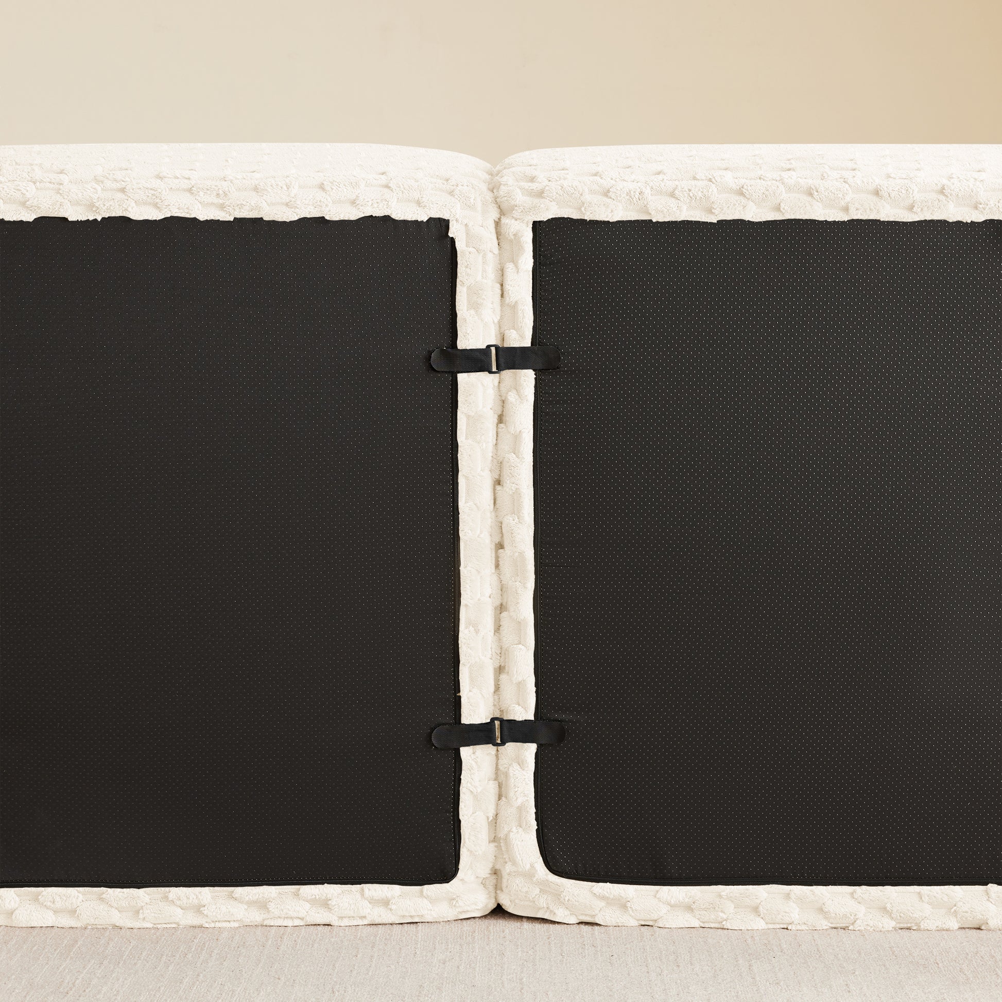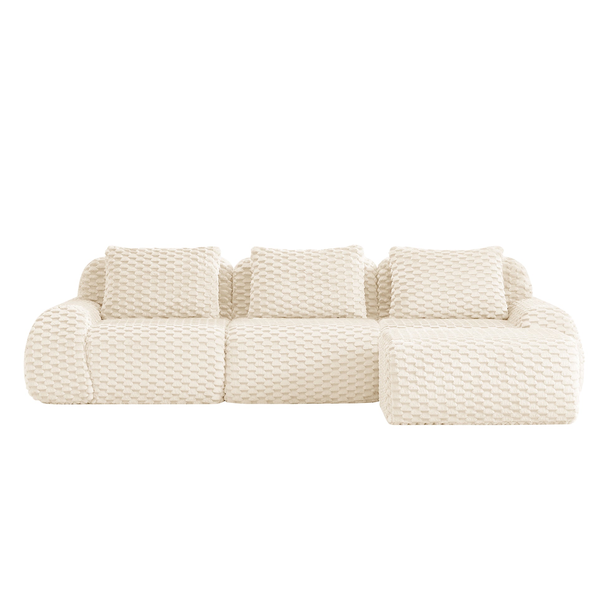 This modern L-shaped modular sectional sofa in cream flannelette fabric offers deep seating, plush comfort, and flexible arrangement options. Oversized and ergonomic, it brings minimalist elegance and relaxation to any living room.