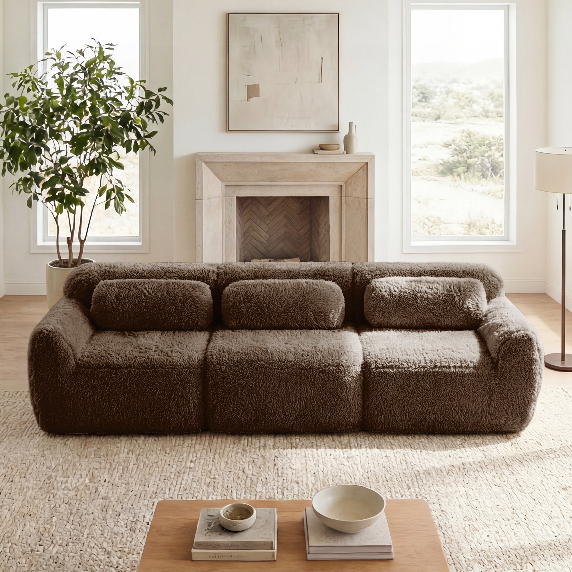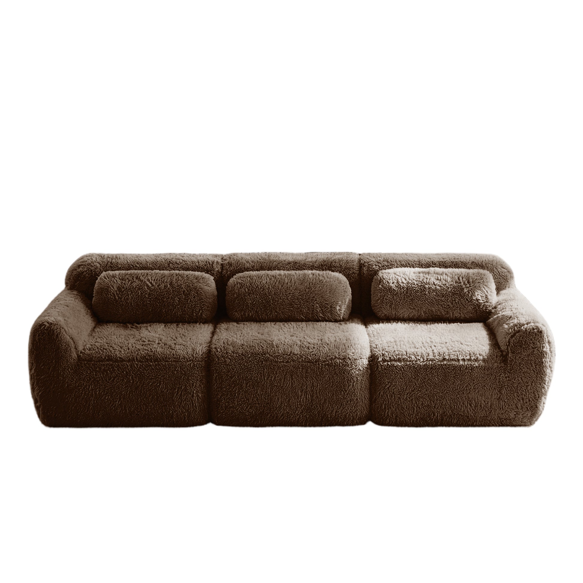Experience ultimate comfort with this 114-inch modular sectional sofa in plush chocolate fabric. Ergonomically designed with an ottoman and throw pillows, it's perfect for home theaters, living rooms, or studies.