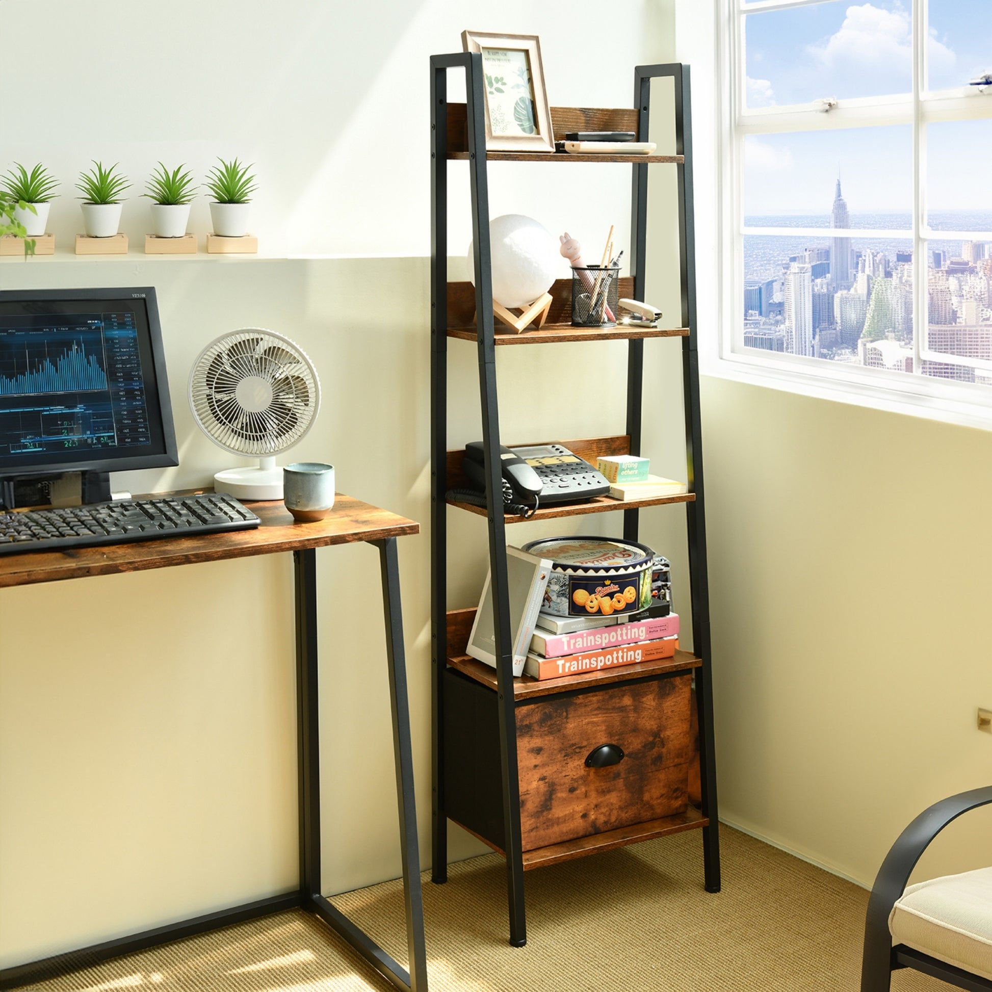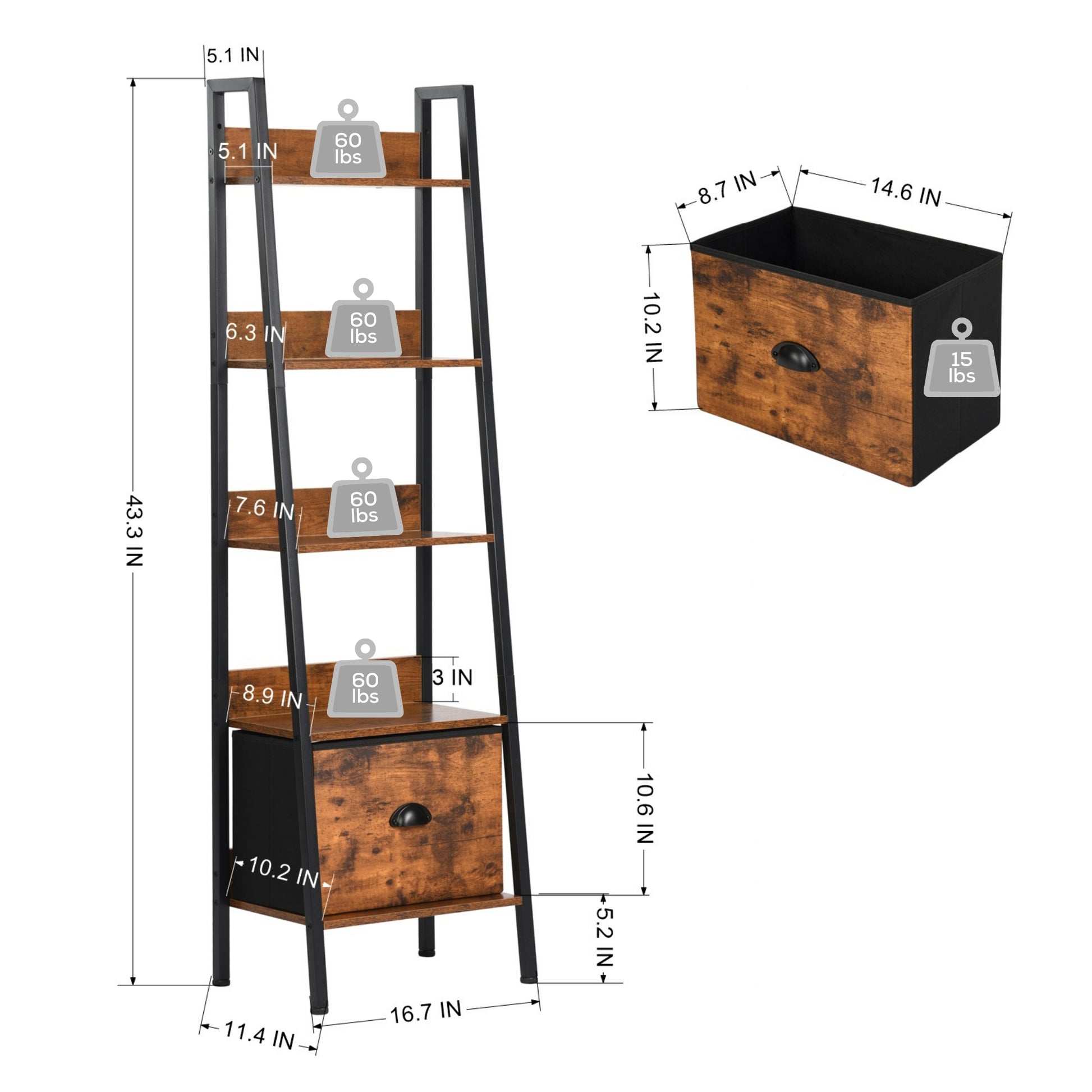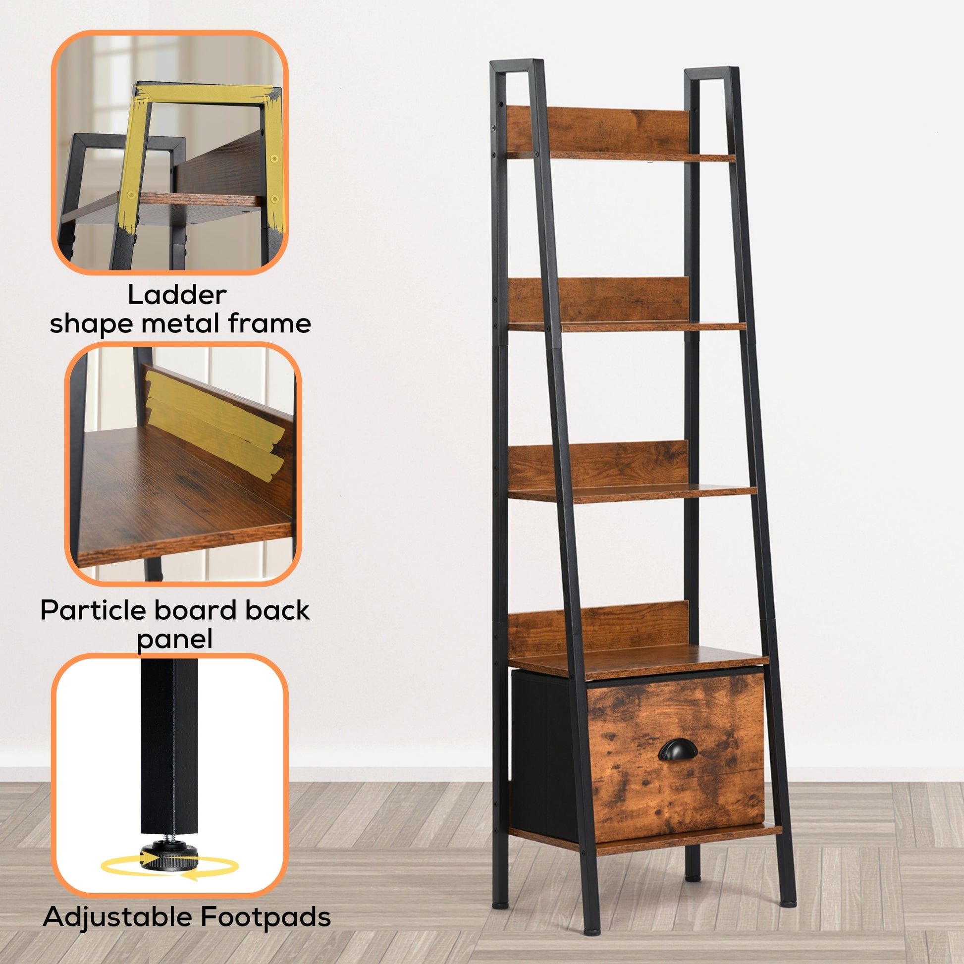 Ladder shelf bookcase storage organizer for living room bedroom home office studio apartment dorm workspace made of wood and metal with a crimson finish and non-woven fabric drawer. Sturdy 5-tier design provides ample storage and display space. Durable particle board shelves with fire grain finish add a modern touch. Adjustable feet and wall lock ensure stability and safety. Dimensions: 16.5 in x 11.4 in x 55.5 in Spacious five-tier shelving offers versatile storage for books, decor, and essentials. Modern crimson finish and fire grain pattern complement any contemporary space. Includes a convenient non-woven fabric drawer with handle for hidden storage. Dimensions: 16.5 in x 11.4 in x 55.5 in Local PickUp SKU: 7827