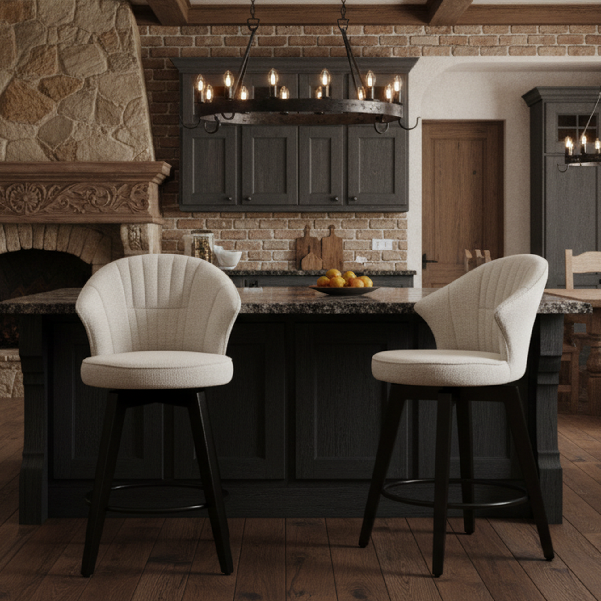 Set of 2 modern counter height bar stools with plush chenille upholstery, ergonomic wingback design, and whisper-quiet 360° swivel. Perfect for kitchen islands, breakfast bars, or stylish entertaining spaces.
