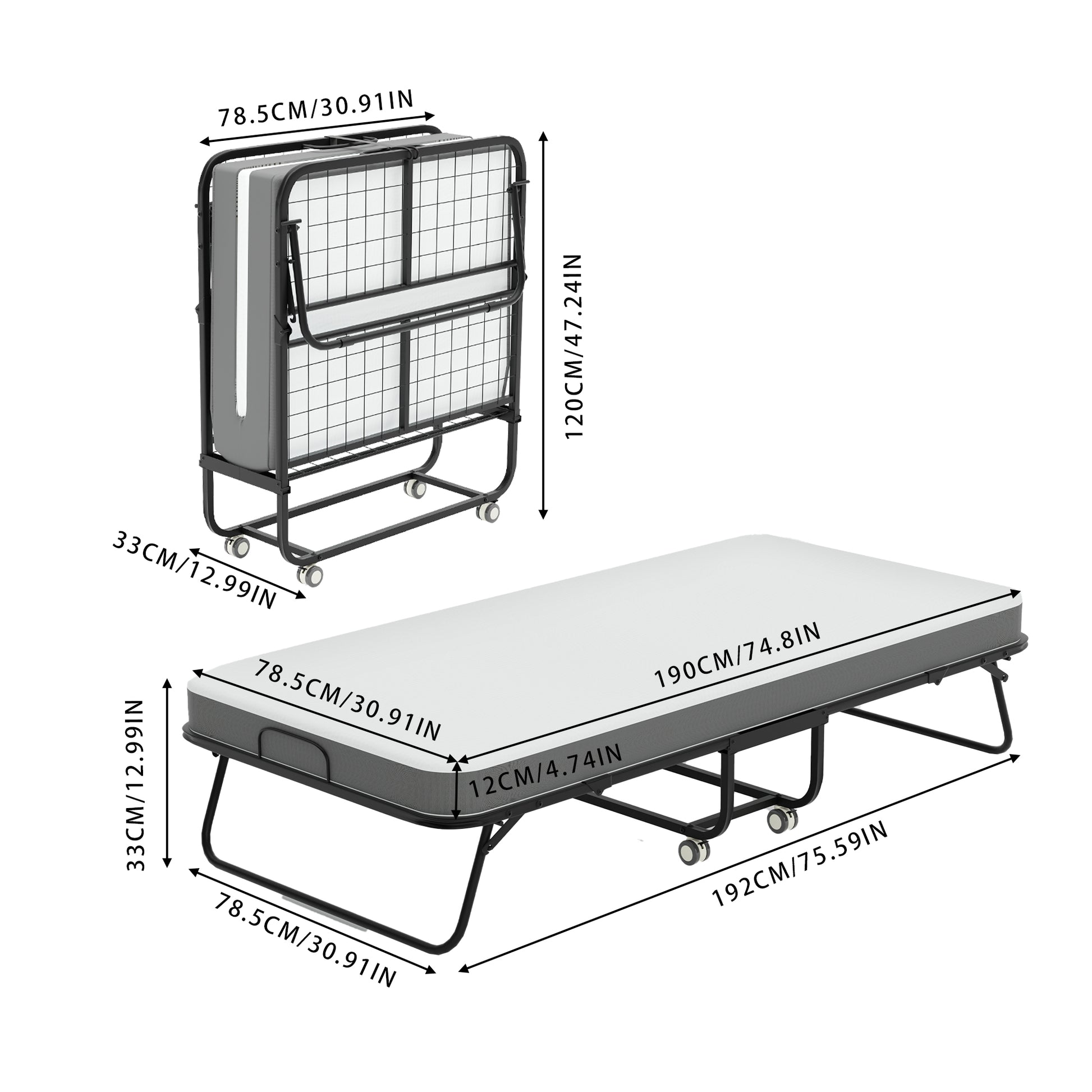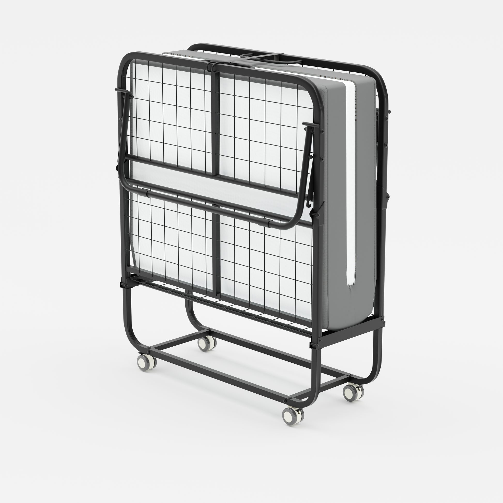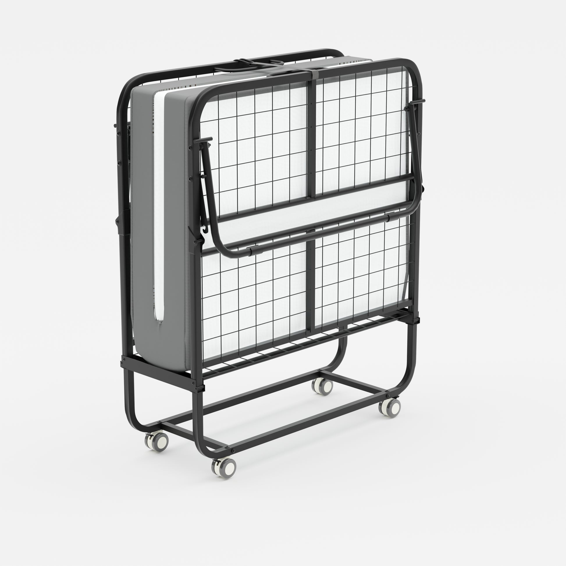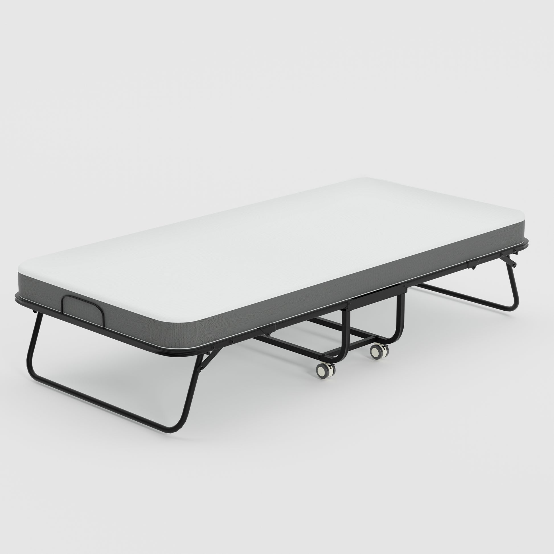 Portable rollaway folding bed with 12 cm foam mattress for overnight guests. Smooth wheels move room to room. Folds to 12.99 in deep for easy closet storage.