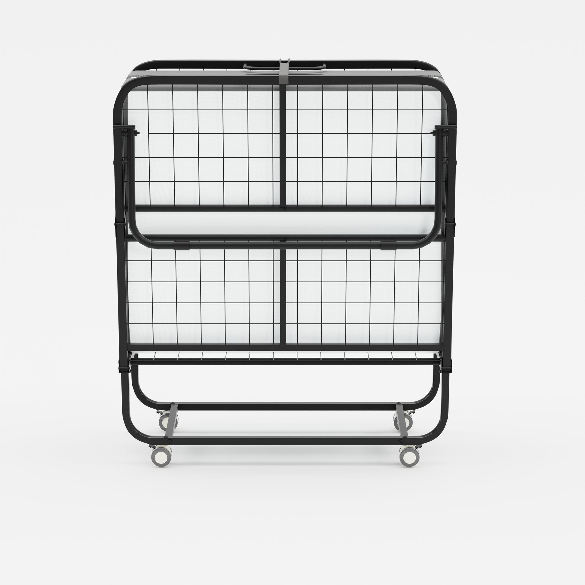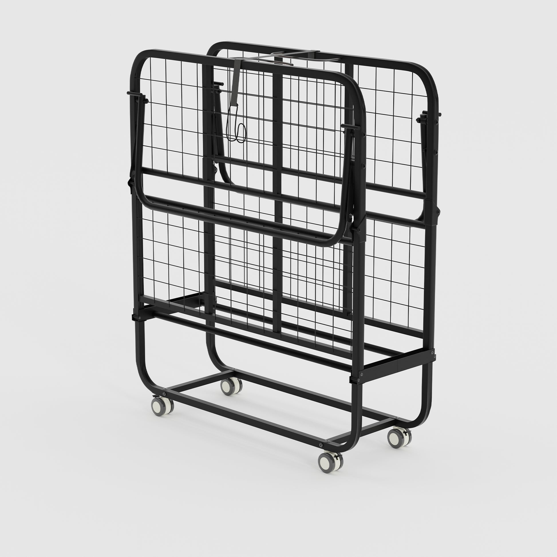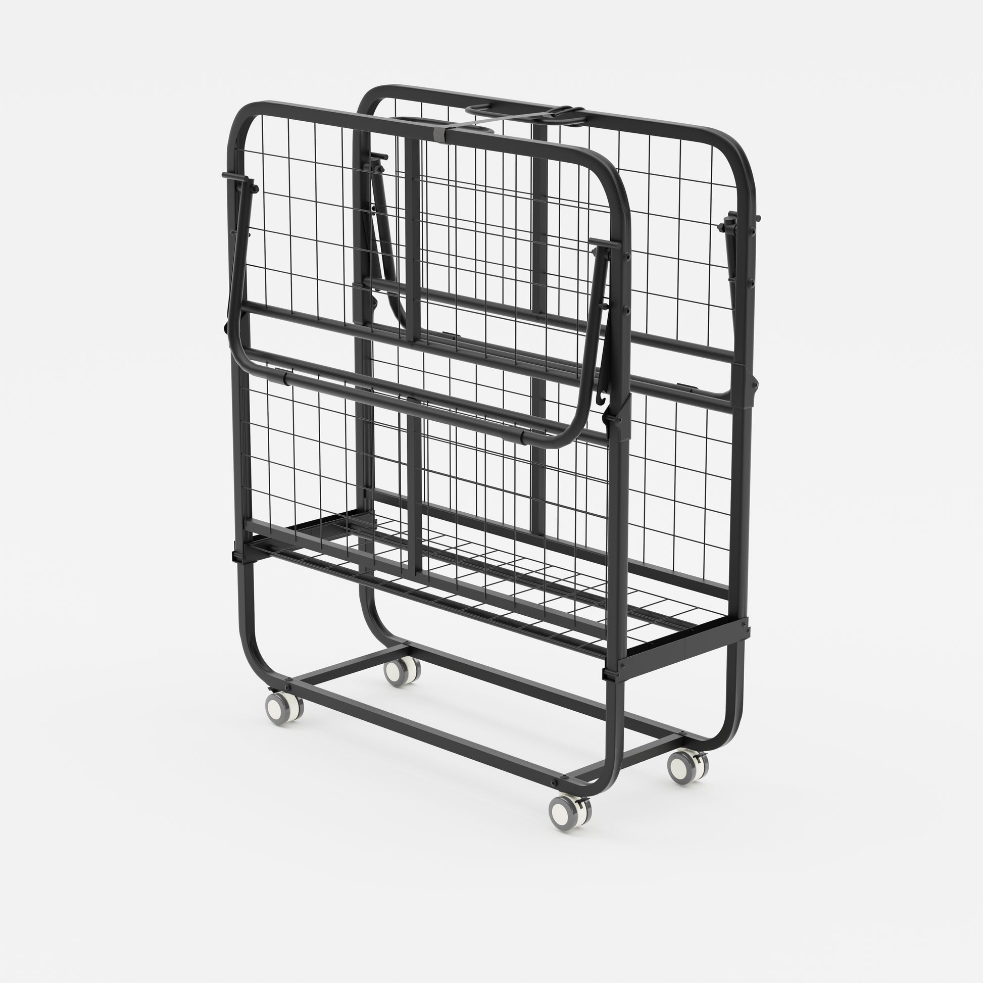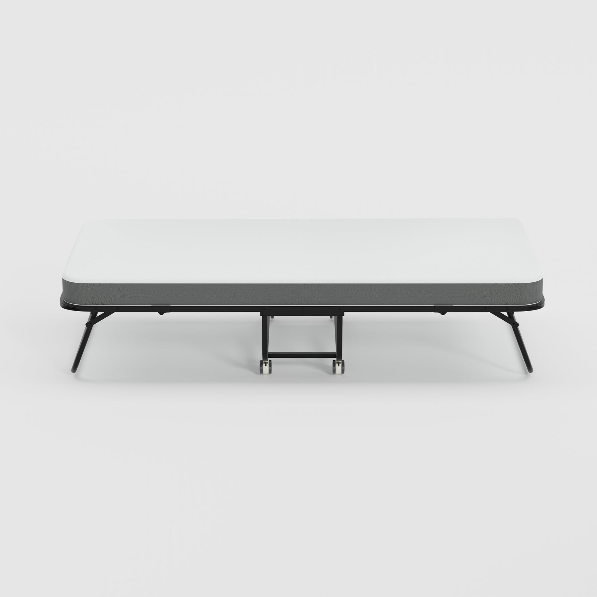Portable rollaway folding bed with 12 cm foam mattress for overnight guests. Smooth wheels move room to room. Folds to 12.99 in deep for easy closet storage.