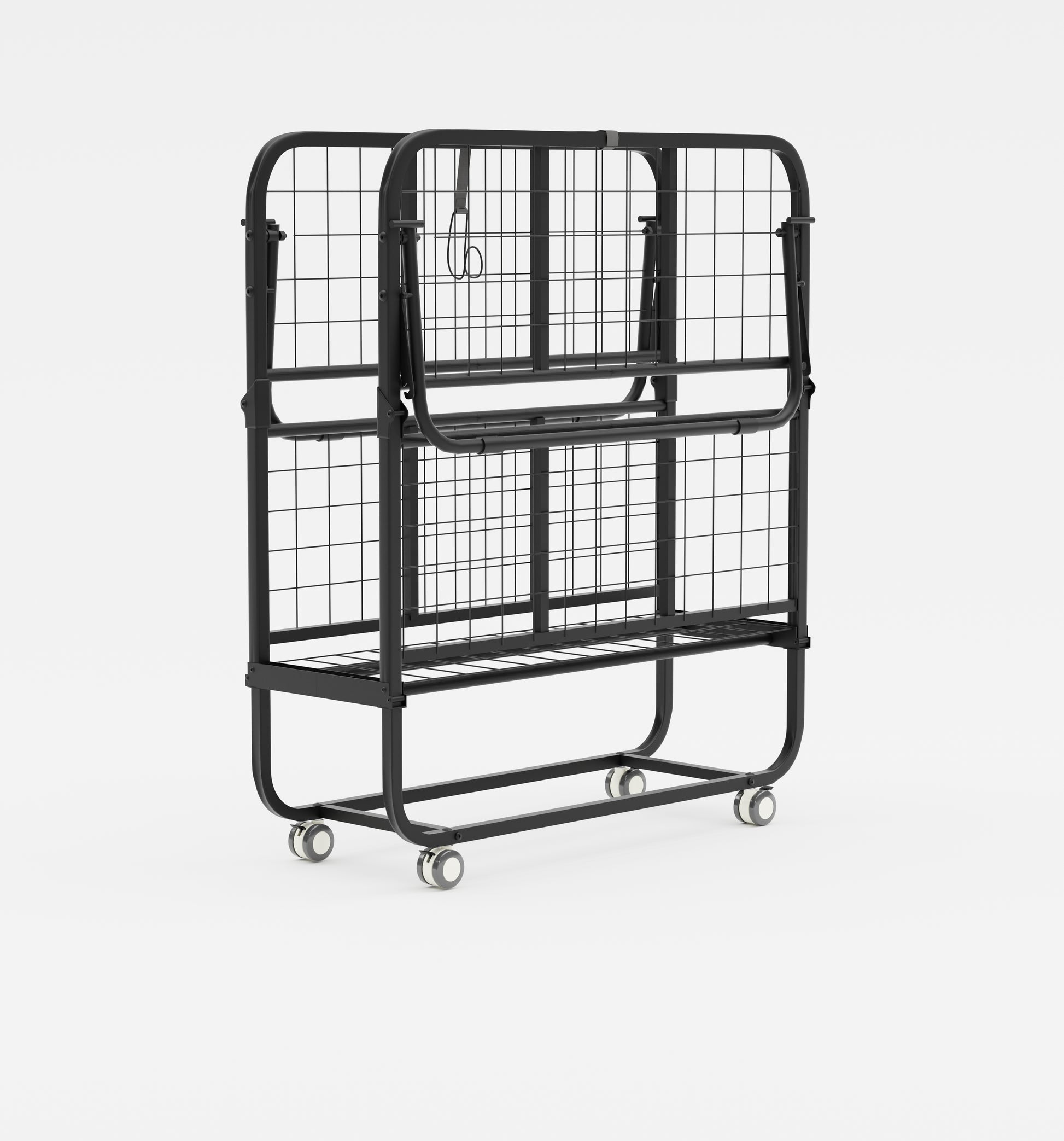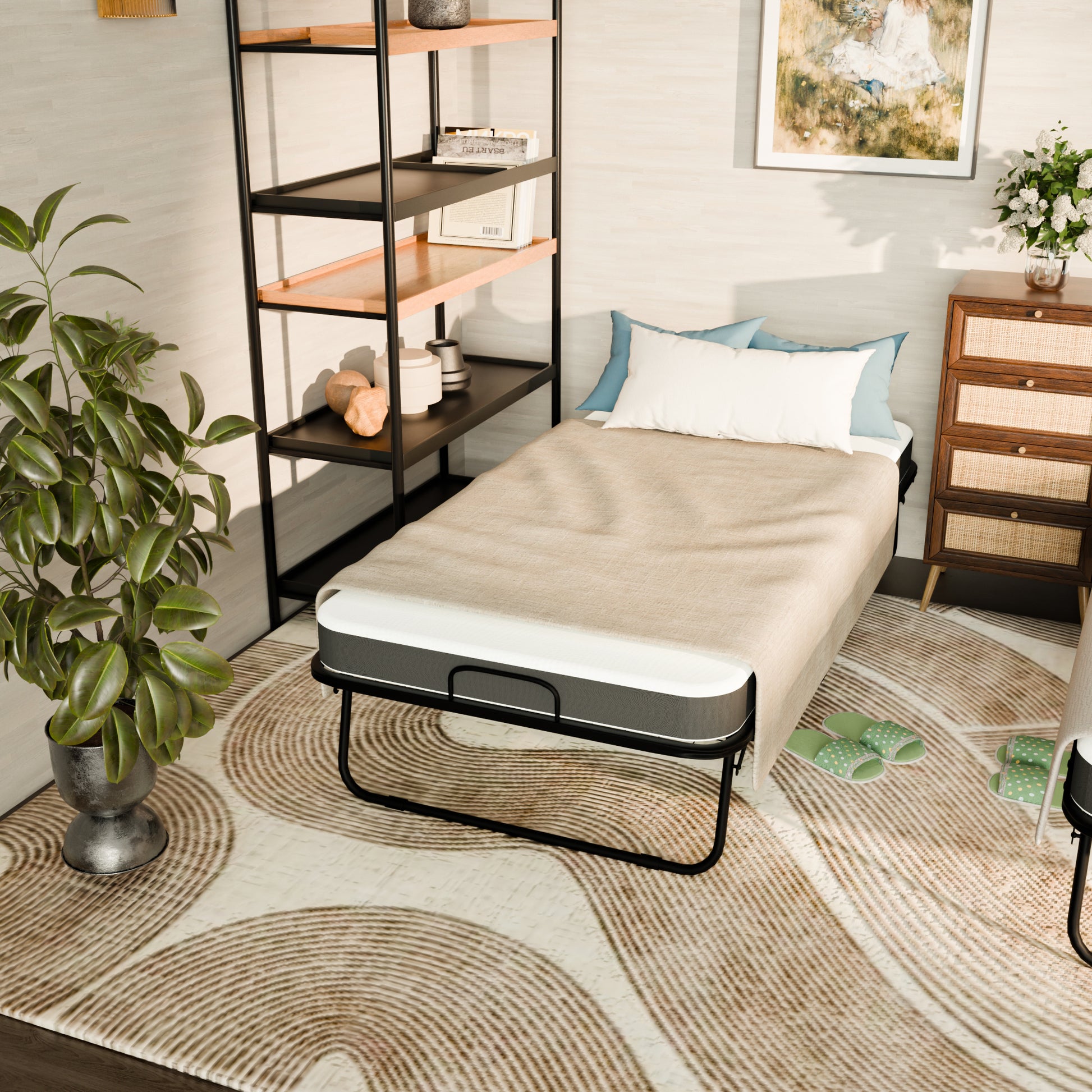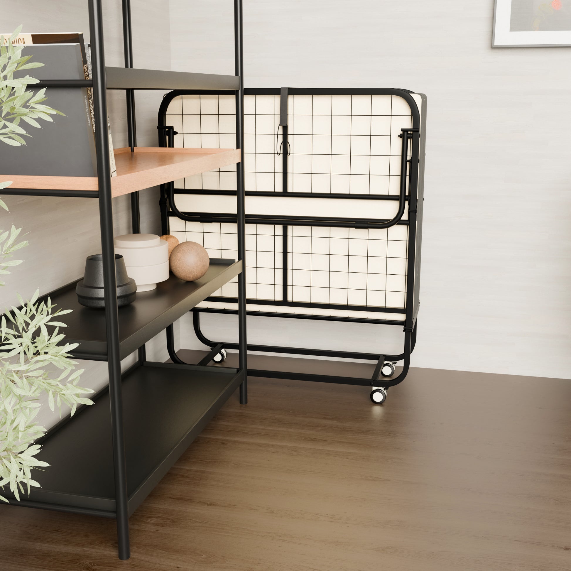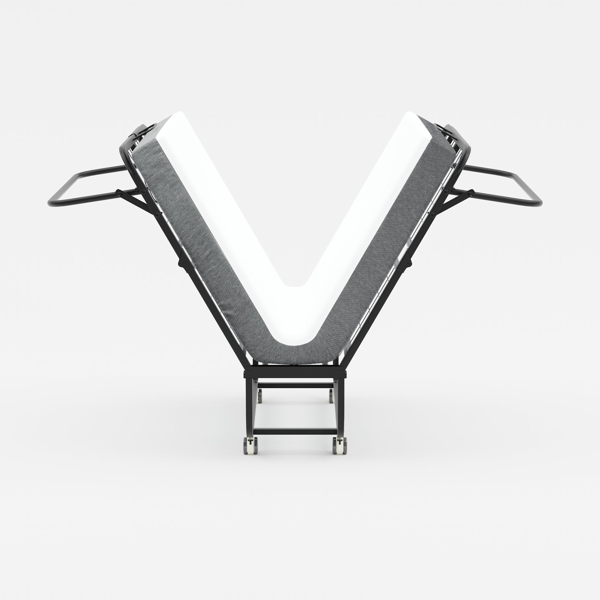 Portable rollaway folding bed with 12 cm foam mattress for overnight guests. Smooth wheels move room to room. Folds to 12.99 in deep for easy closet storage.