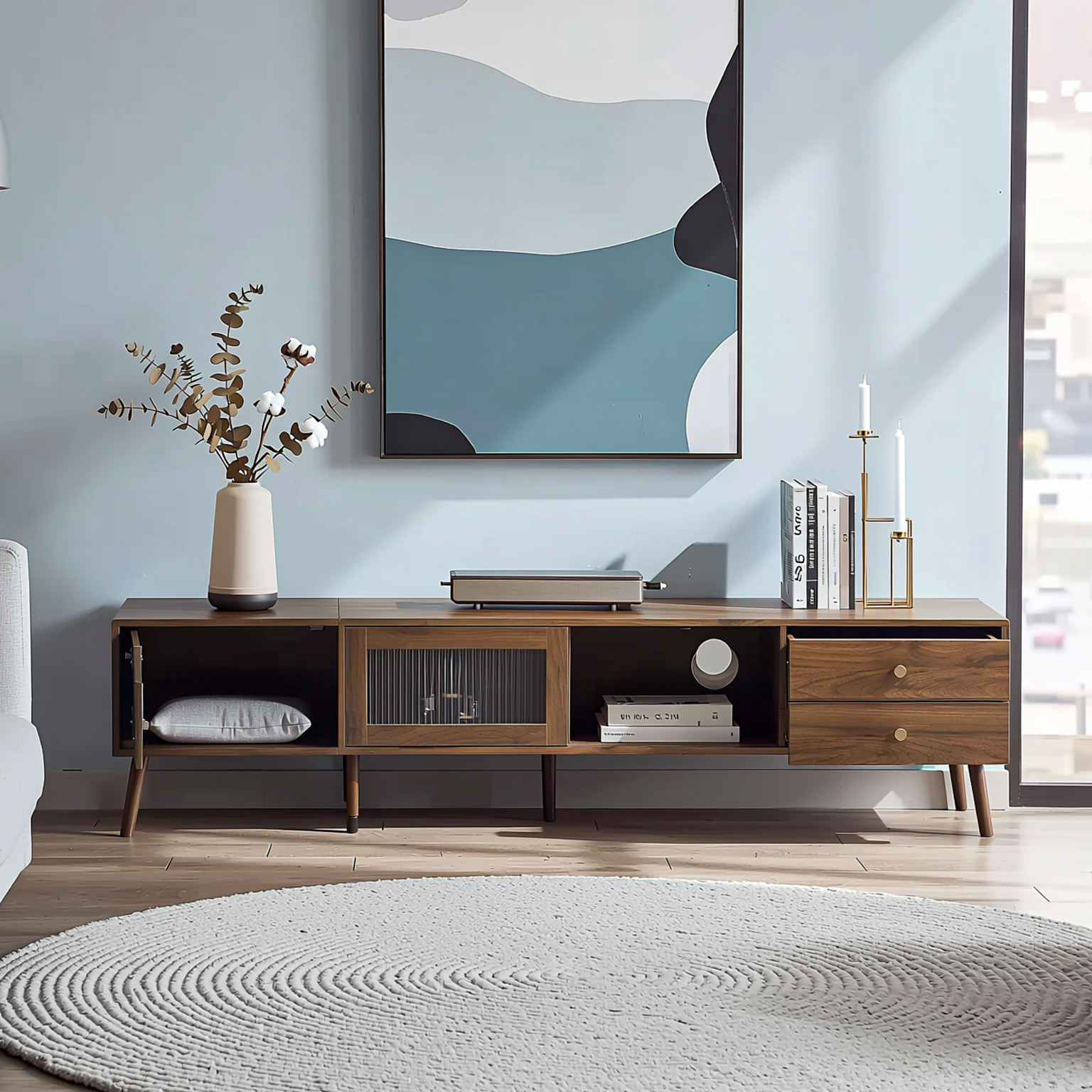 76.7 in mid century TV stand for TVs up to 85 in. Walnut look finish with glass doors, cabinet and drawers. Rear cable ports keep consoles organized so movie nights start fast.