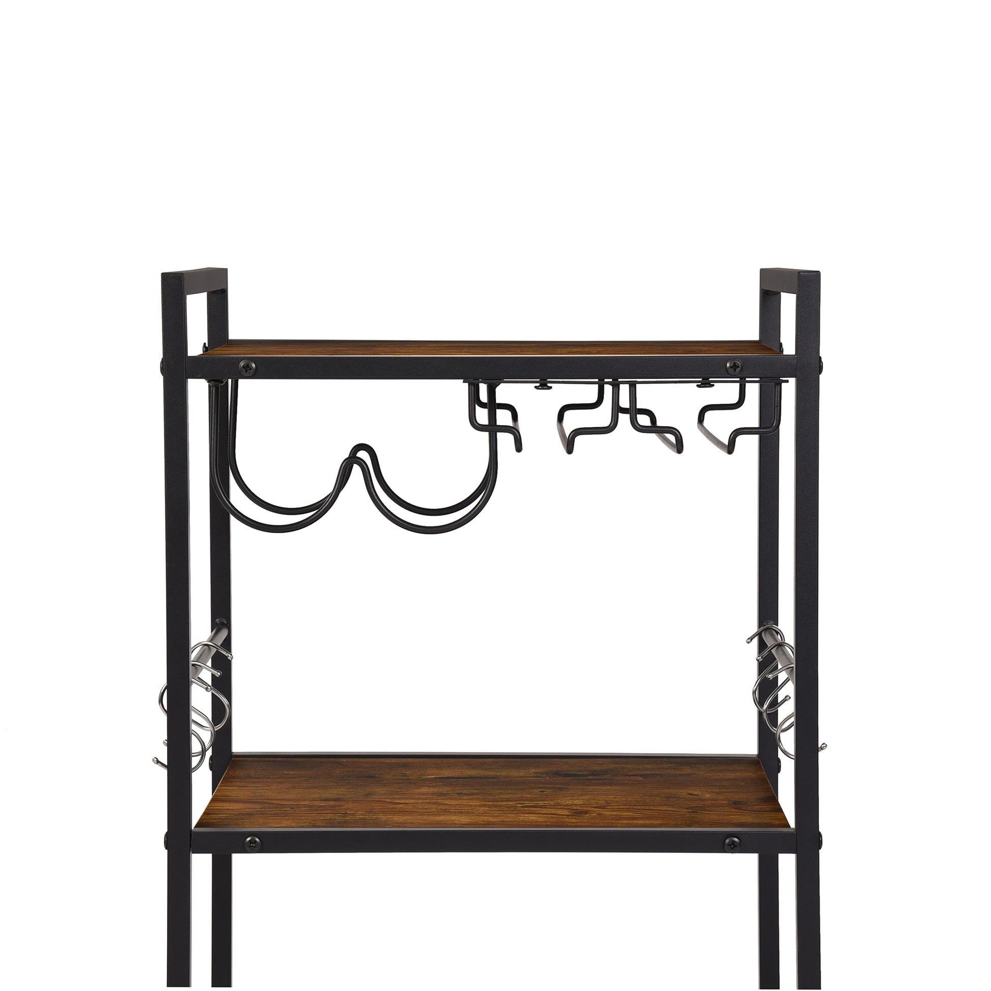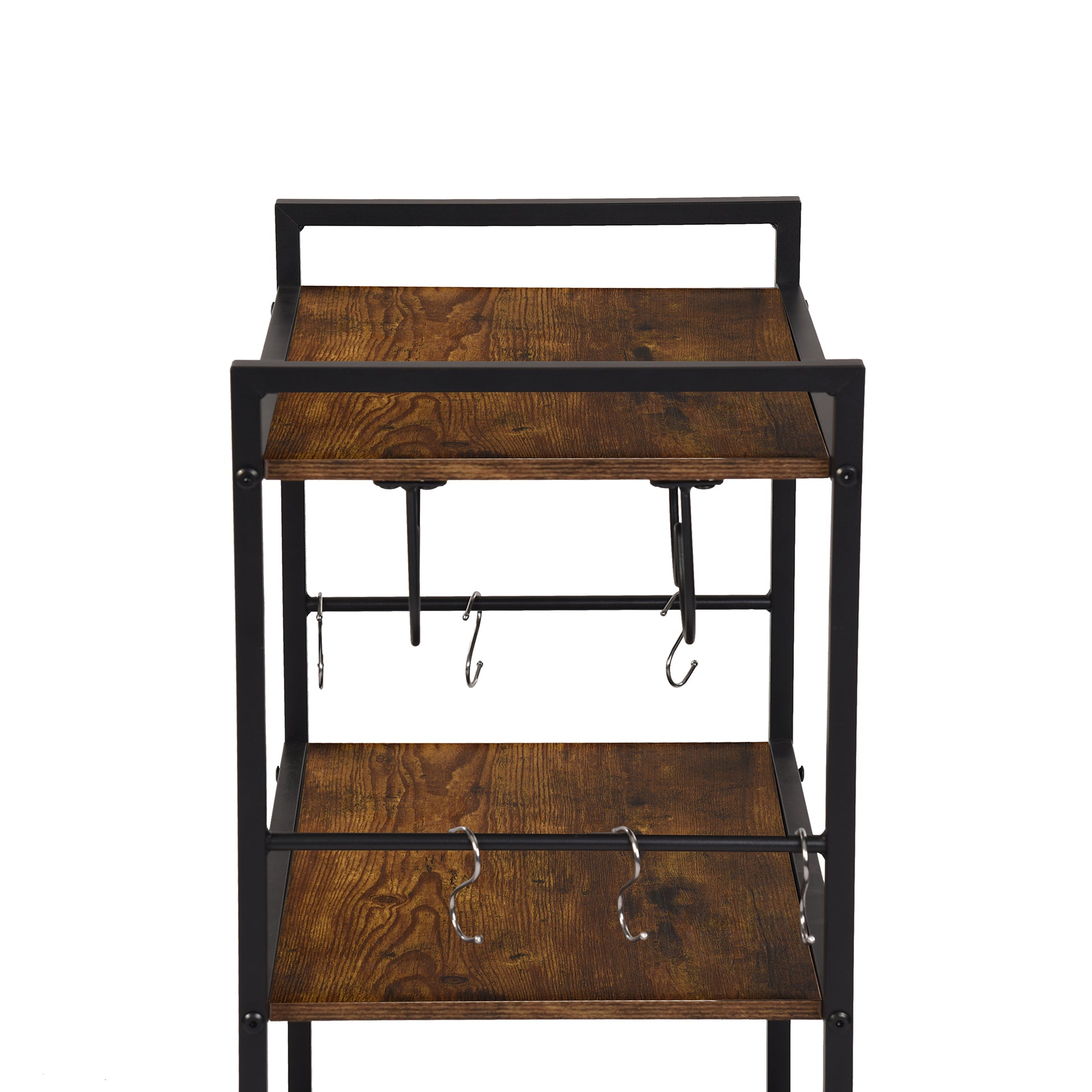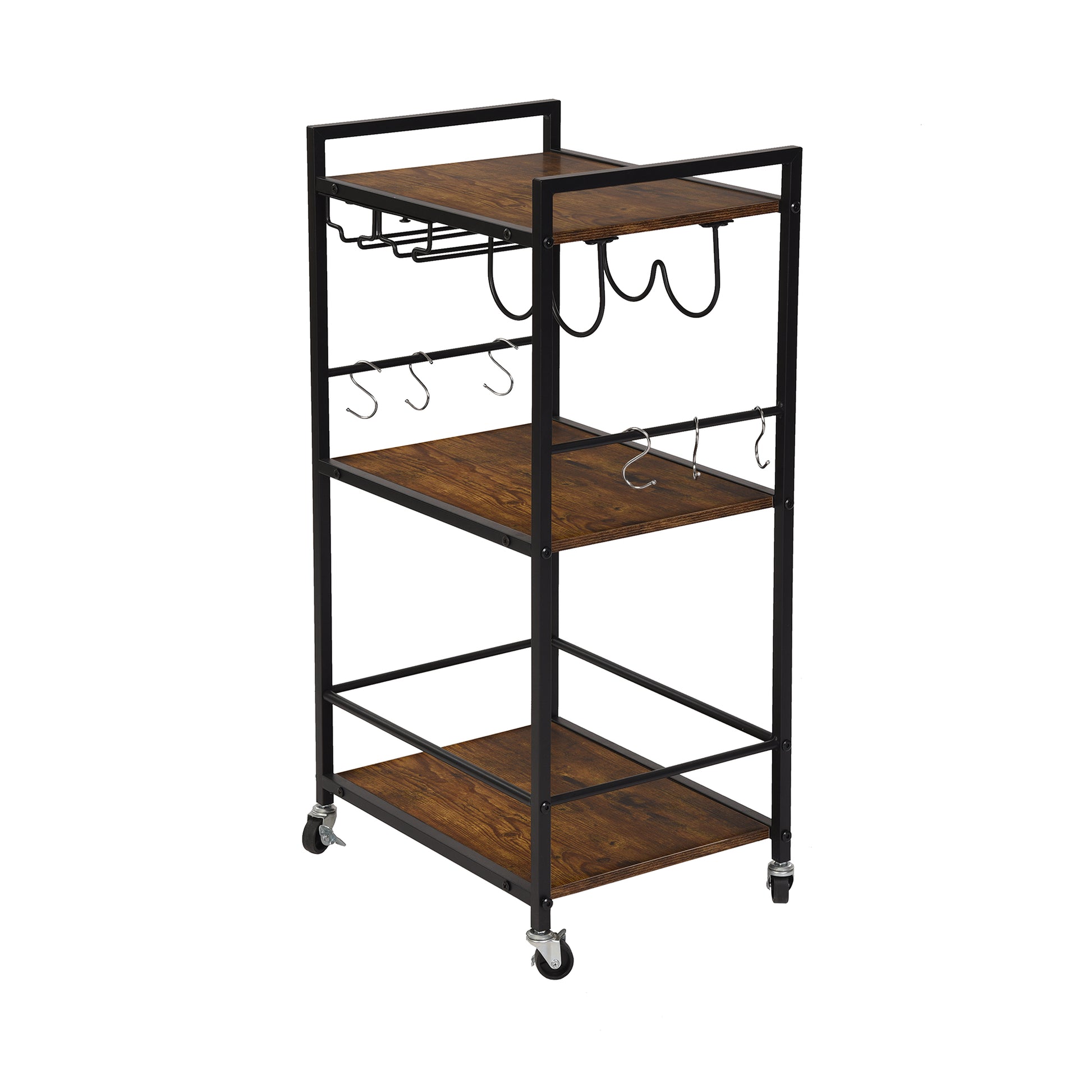 The Loki rolling kitchen cart blends vintage wood tones and black metal for a stylish yet functional storage solution. With 3-tier shelves, side hooks, and smooth wheels, it's perfect for kitchens, offices, and beyond.