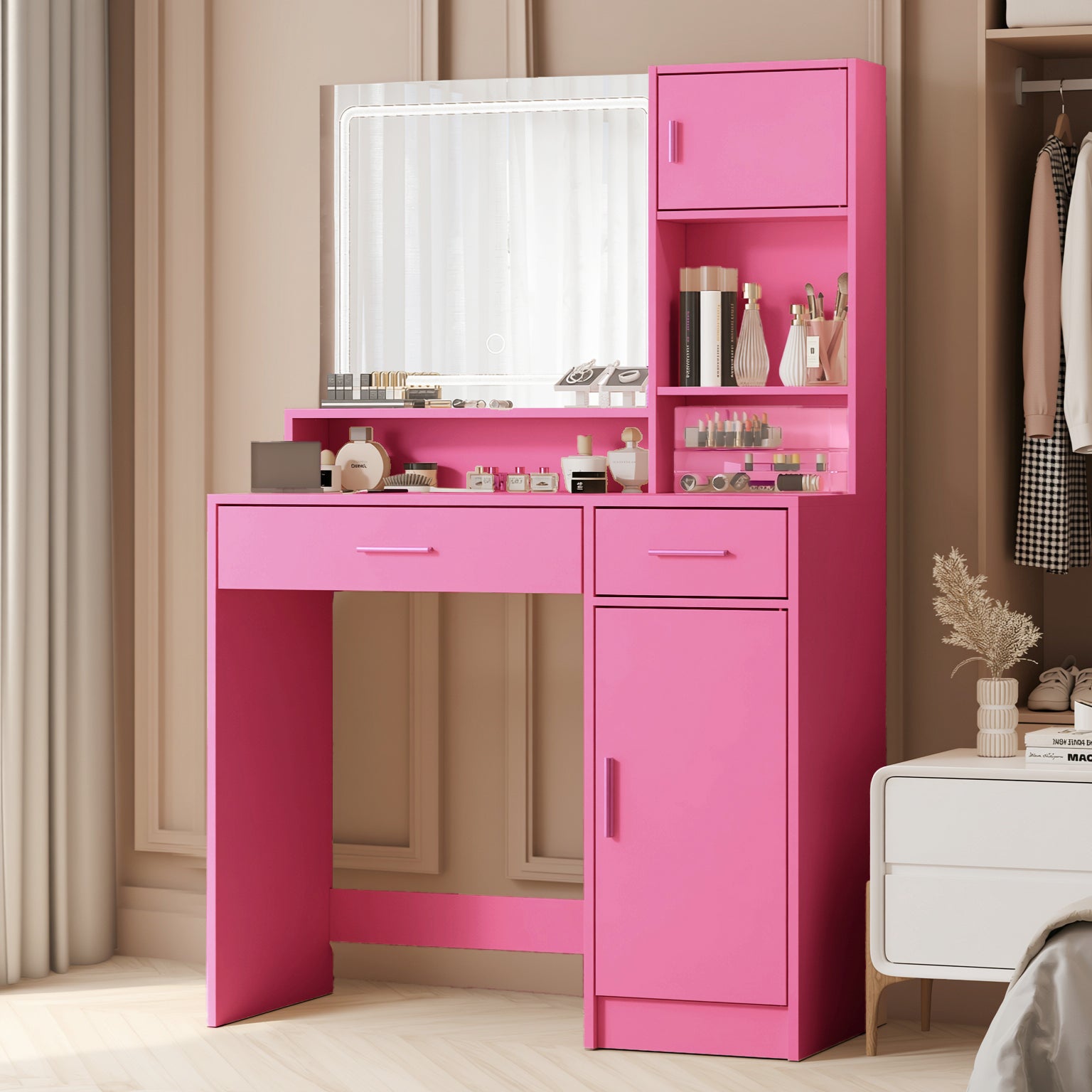 Drawers, shelves, and a side cabinet create organized zones for cosmetics, skincare, and accessories.