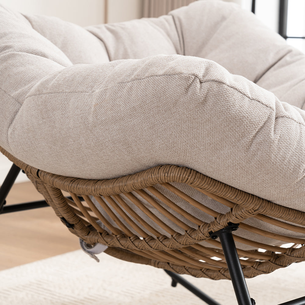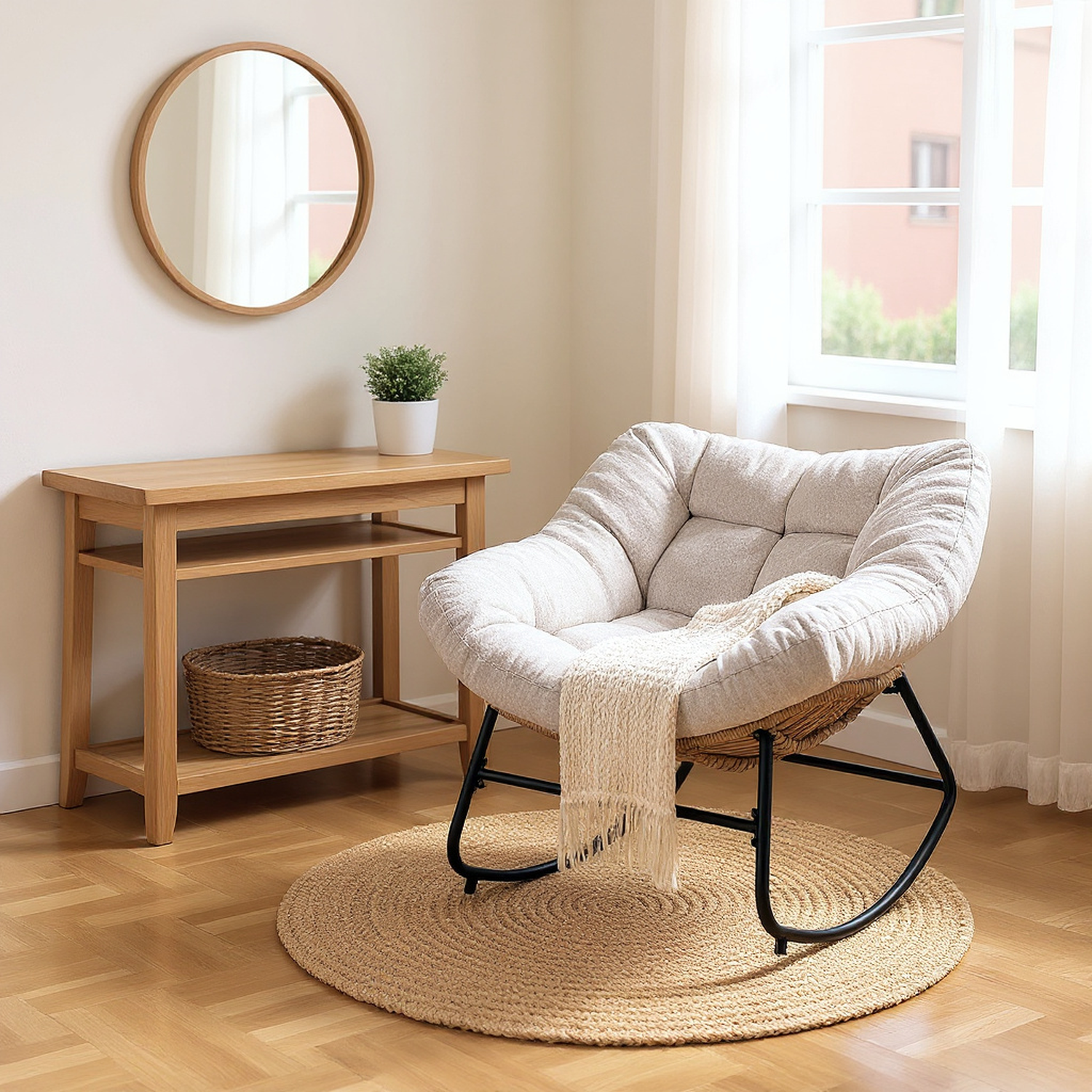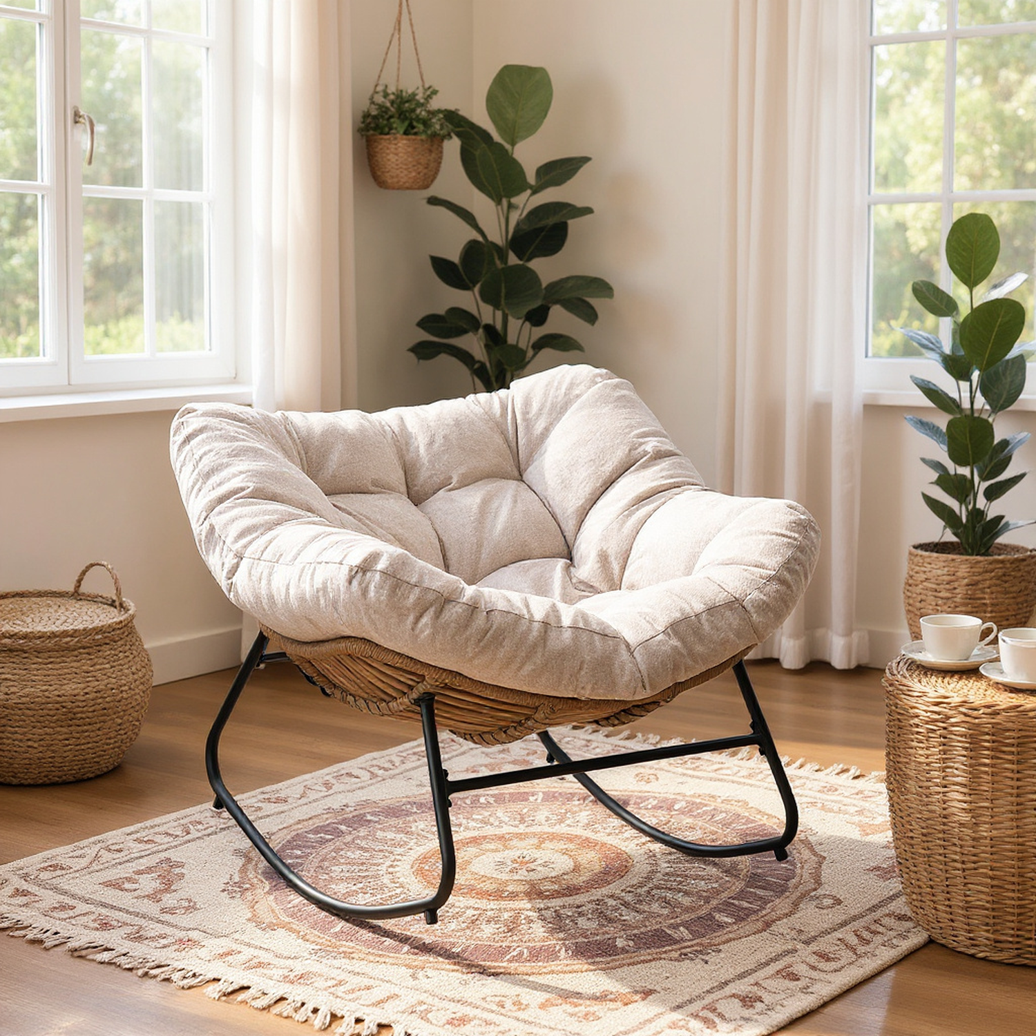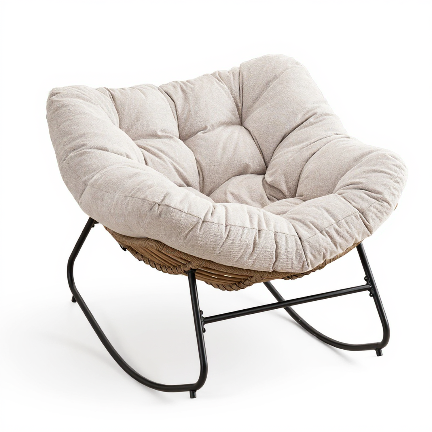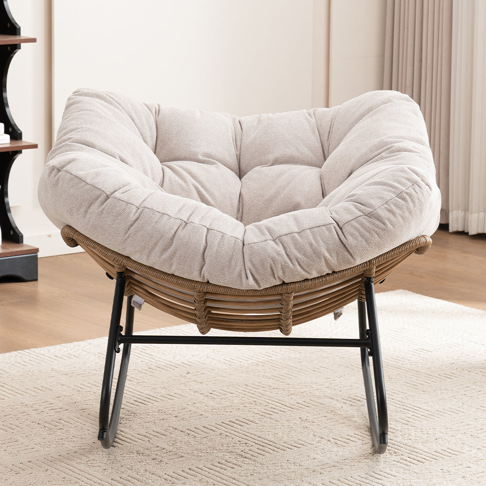 Modern beige chenille rocking chair with ergonomic design, sturdy metal frame, and plush cushion. Perfect for living rooms, bedrooms, nurseries, or balconies.