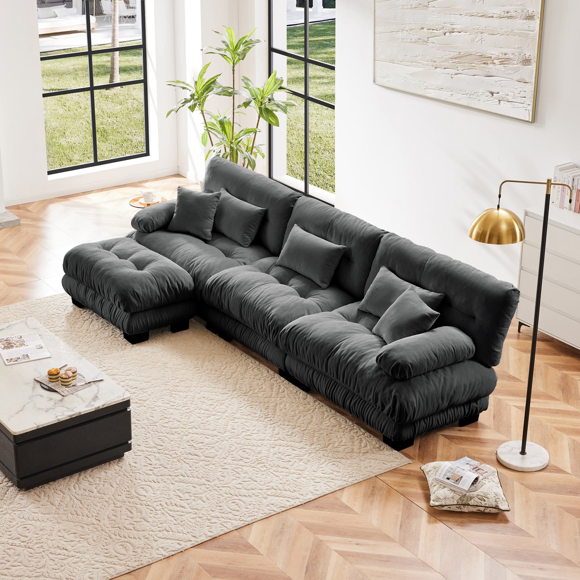 This 134 inch modular cloud sectional sofa features soft chenille upholstery deep seating and a convertible ottoman design offering plush comfort flexible layouts and relaxed modern living for spacious homes.