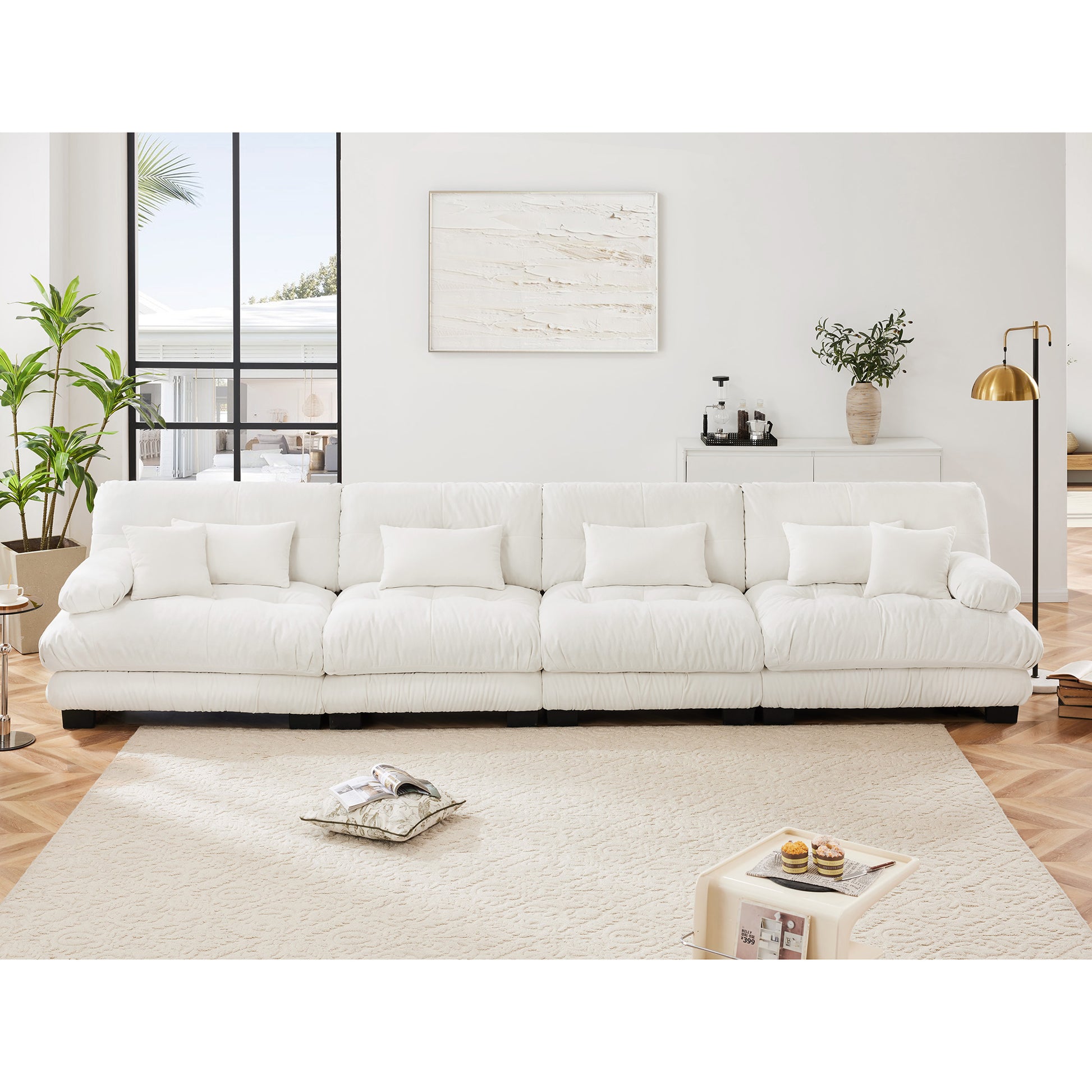Monterey 173 inch extra large modular chenille cloud sectional sofa features ultra deep seating soft shredded sponge cushions and sculpted bolster armrests delivering relaxed support and flexible layout for modern living rooms.