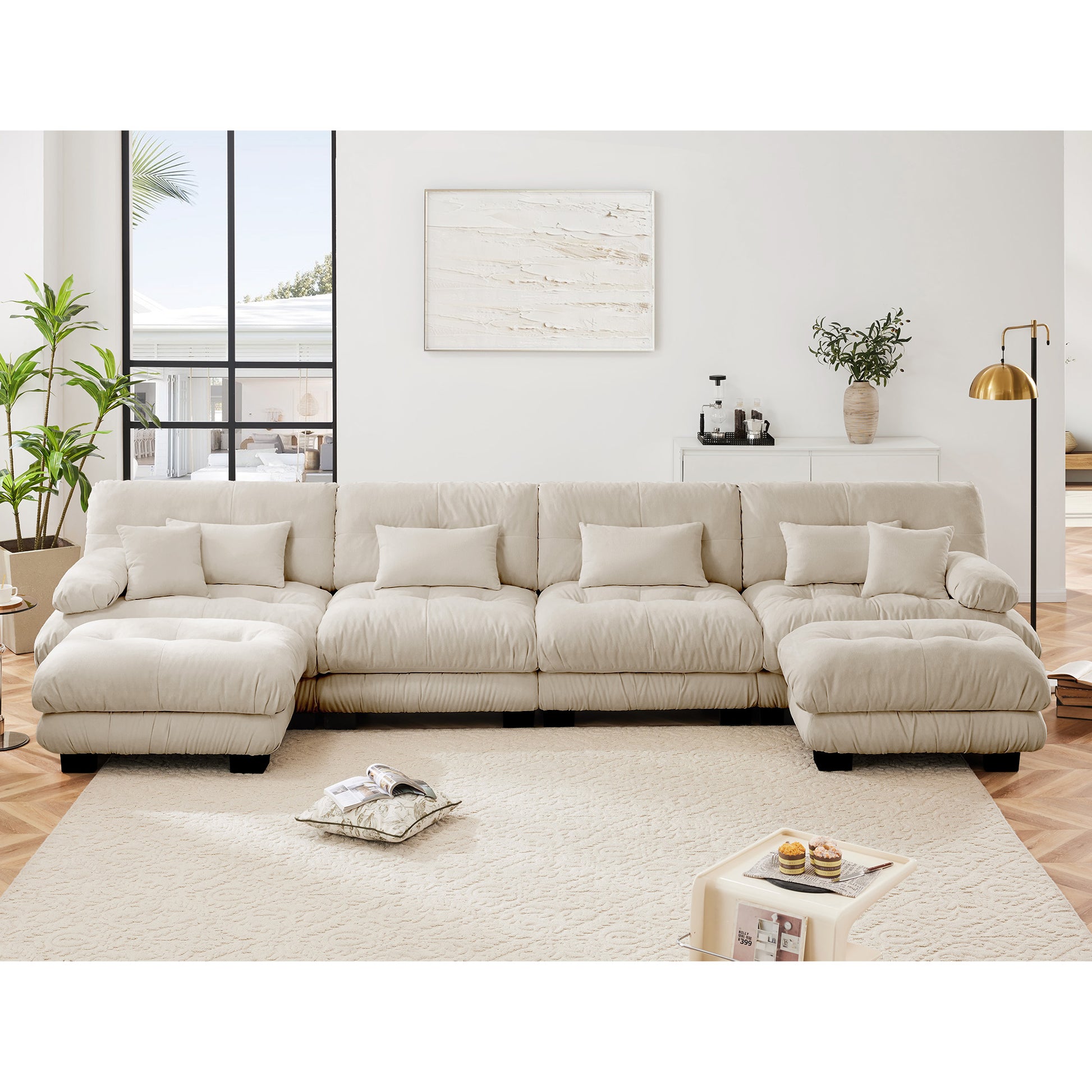 This oversized modular U-shaped cloud sectional sofa features soft chenille upholstery, deep seating, plush cushions, and flexible ottoman configuration, creating a relaxed and inviting living room centerpiece.