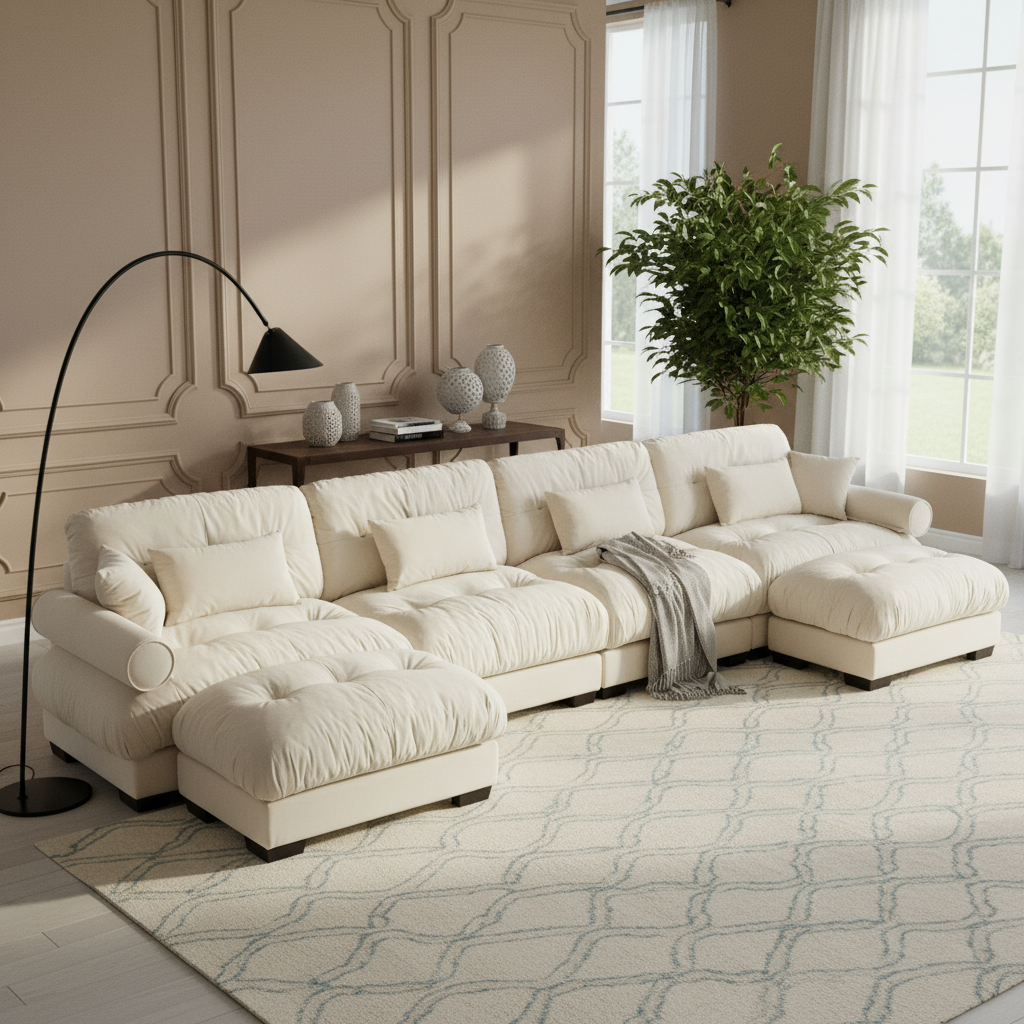 Napa 166 inch U-shaped modular velvet sectional sofa features deep cloud-like cushions bolstered armrests and movable ottomans creating a flexible luxury seating solution for modern living rooms.
