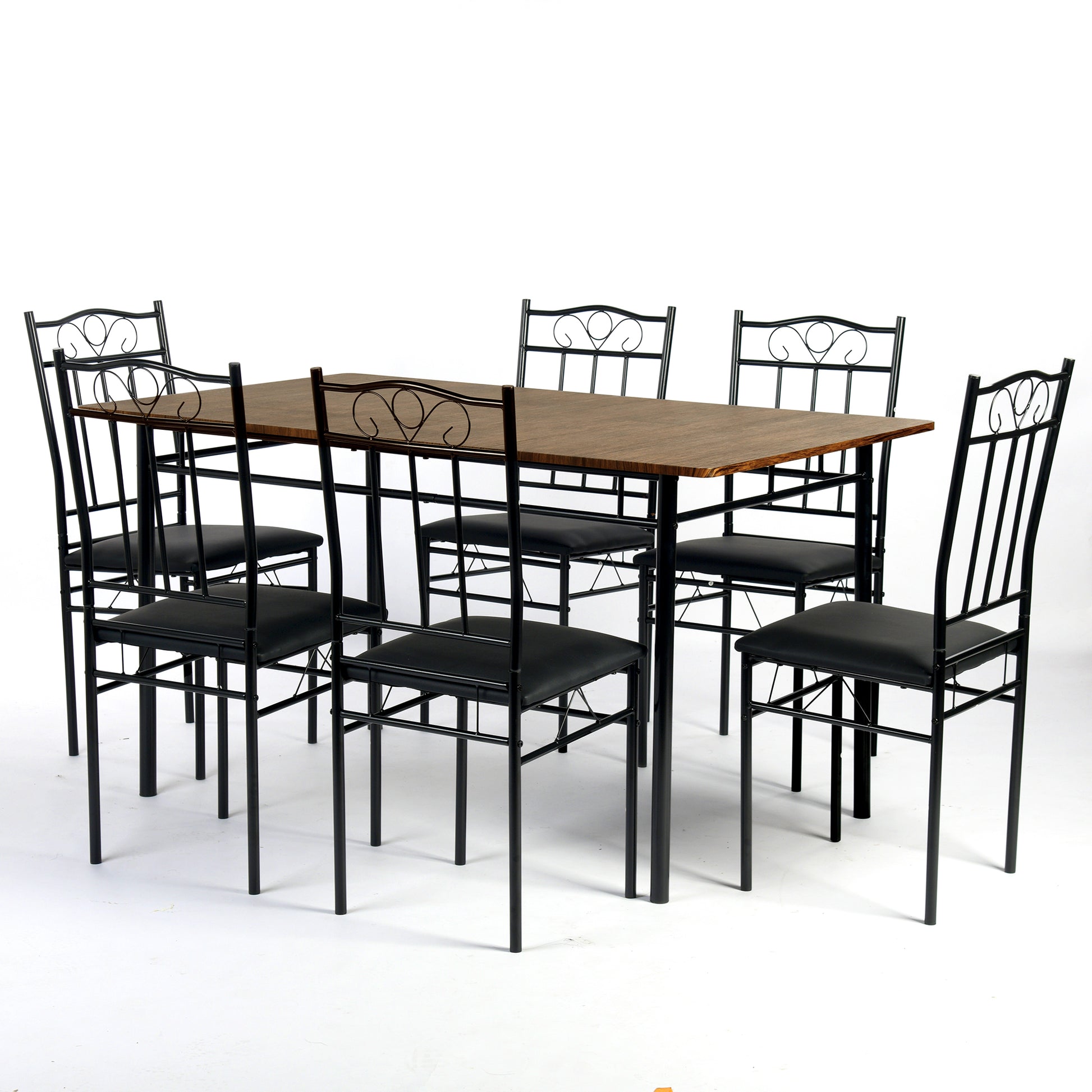 This 7-piece dining set features a rustic wood-look table and six black metal chairs with upholstered seats, perfect for family meals and casual gatherings.