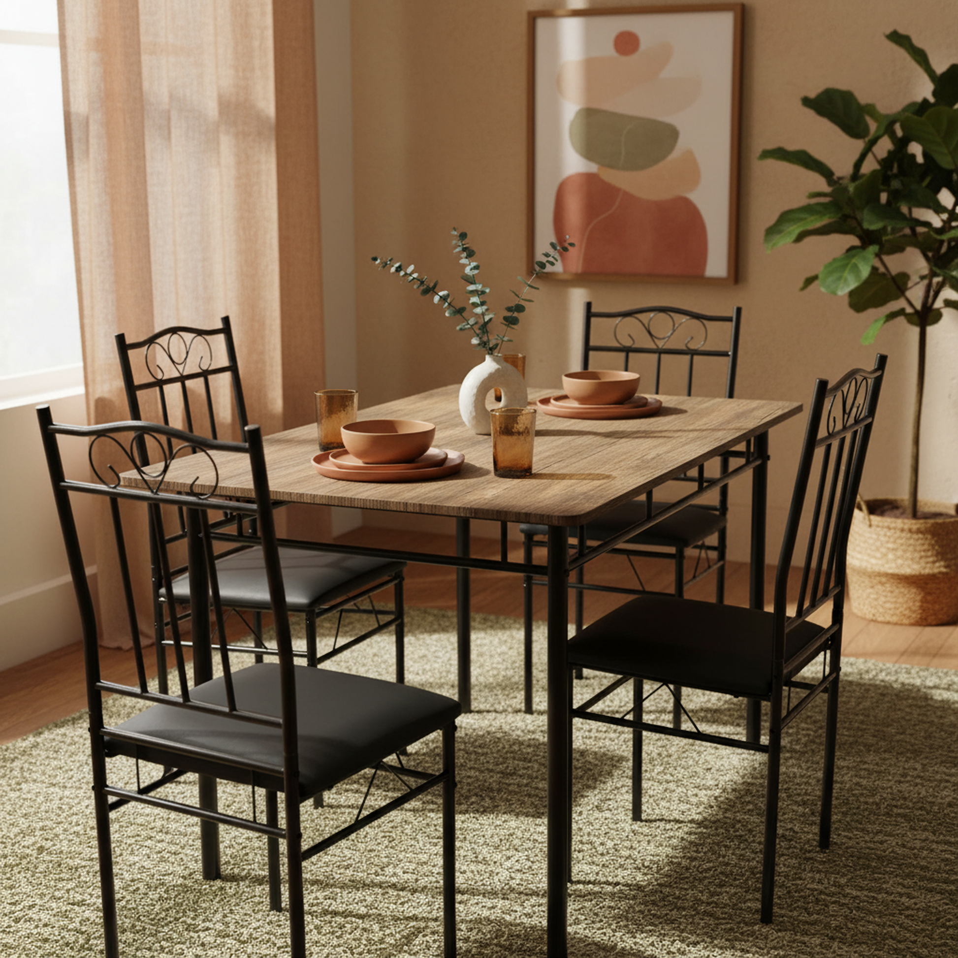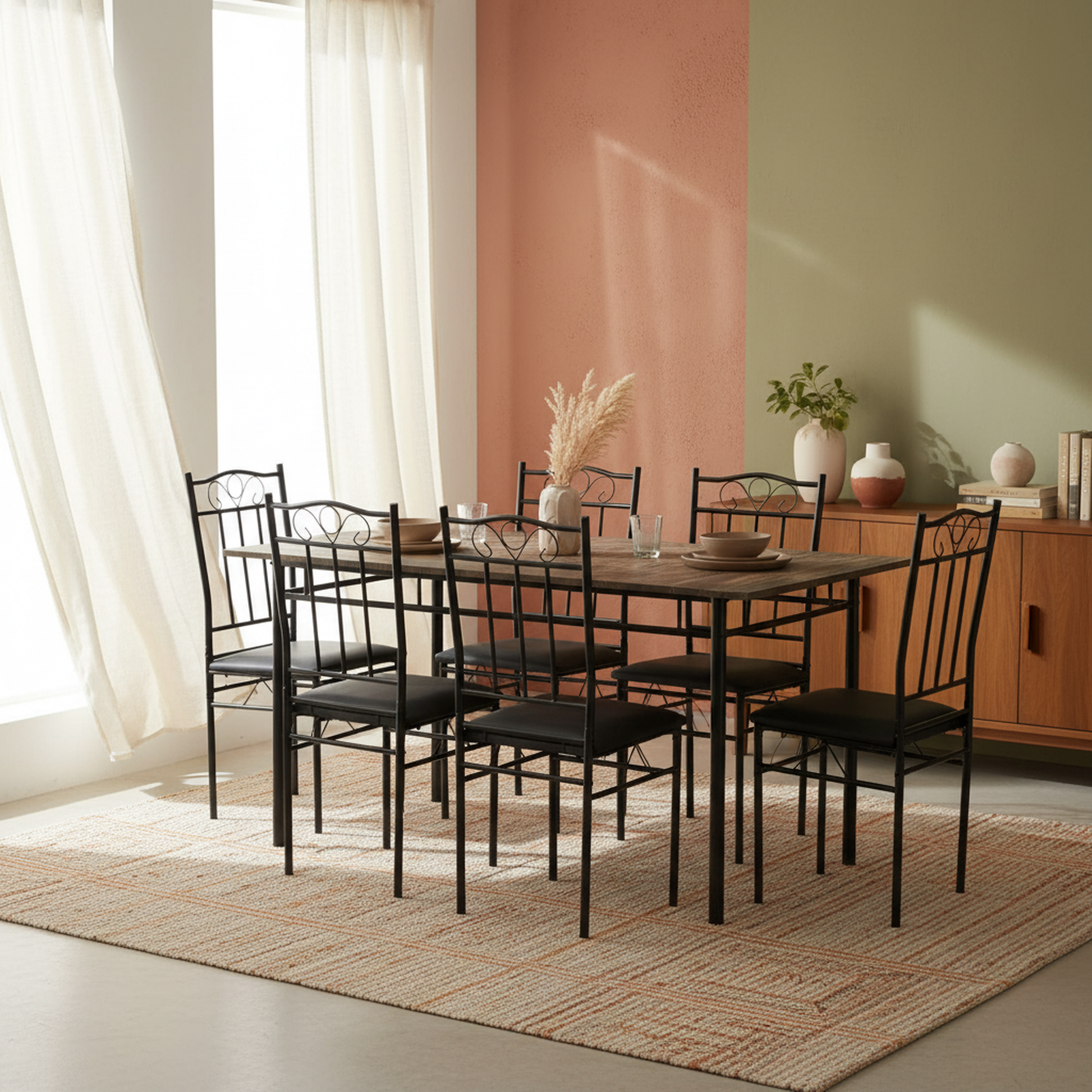 This 7-piece dining set features a rustic wood-look table and six black metal chairs with upholstered seats, perfect for family meals and casual gatherings.