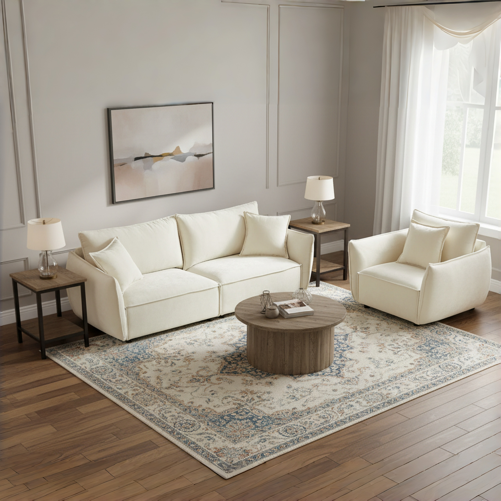 The Phoenix 2 Piece Sofa Set includes a spacious loveseat and a wide recliner chair, upholstered in high-quality linen fabric with plush foam filling. This set blends comfort and style for both modern and country-inspired living spaces.
