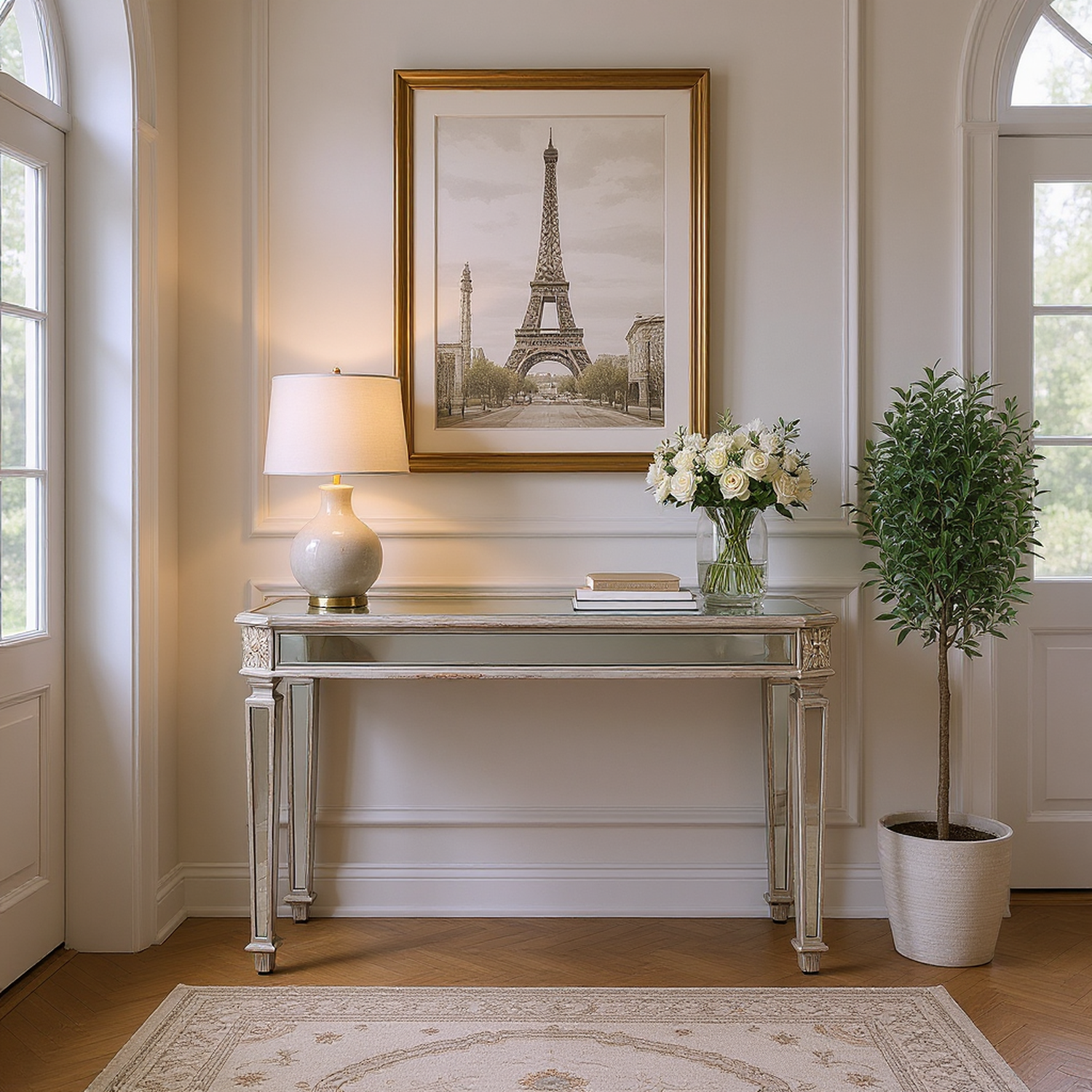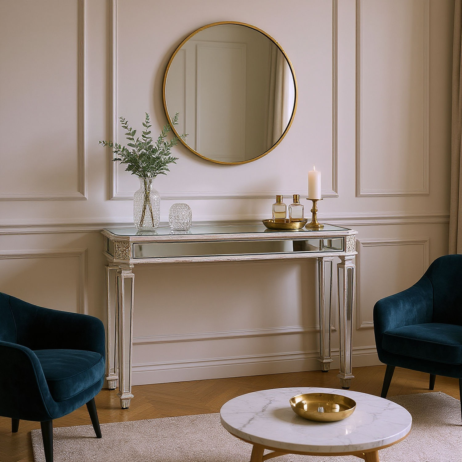 The Porte Mirror Console Table features a mirrored finish, vintage wood carving, and a solid frame, blending Art Deco elegance with modern style for a luminous, sophisticated focal point in any space.