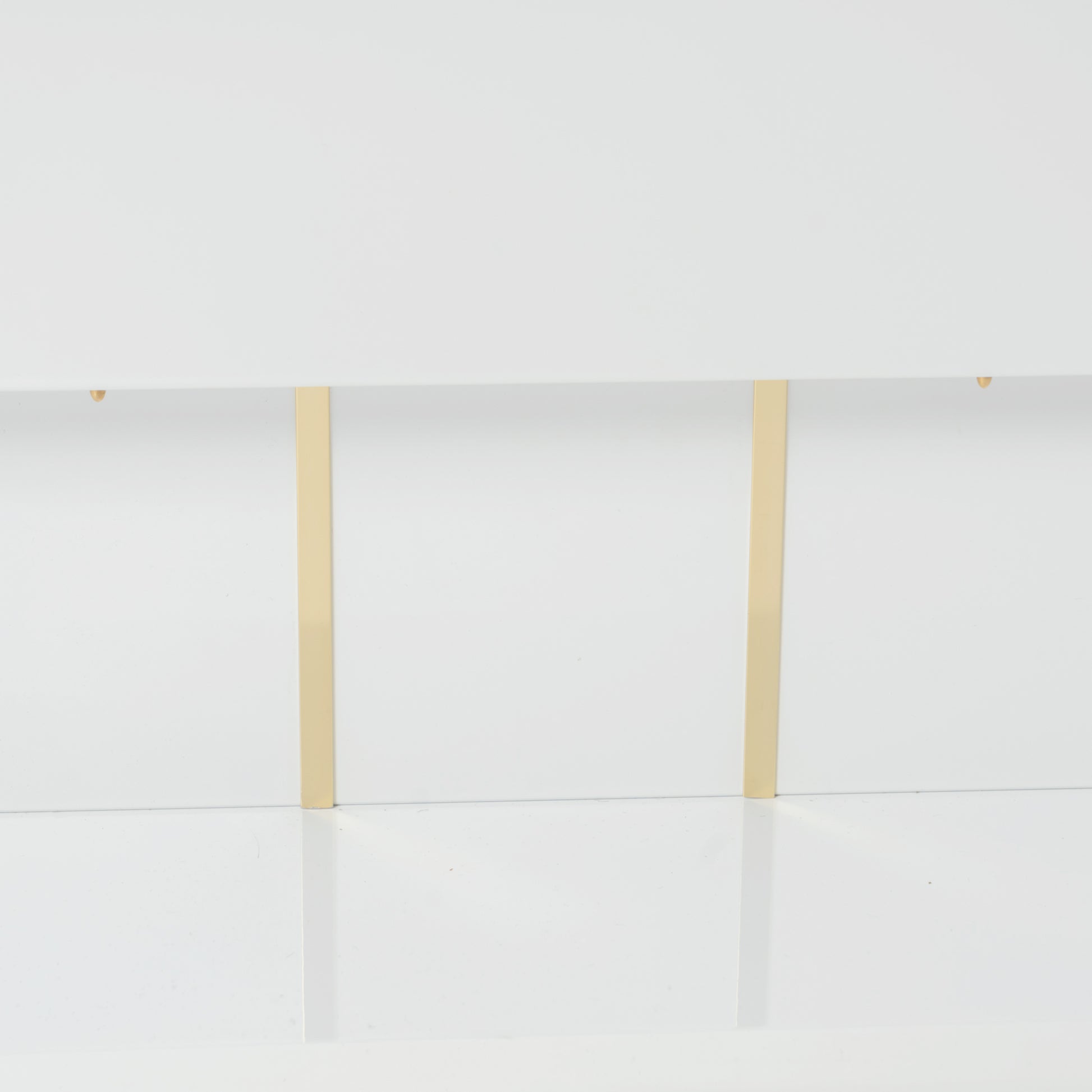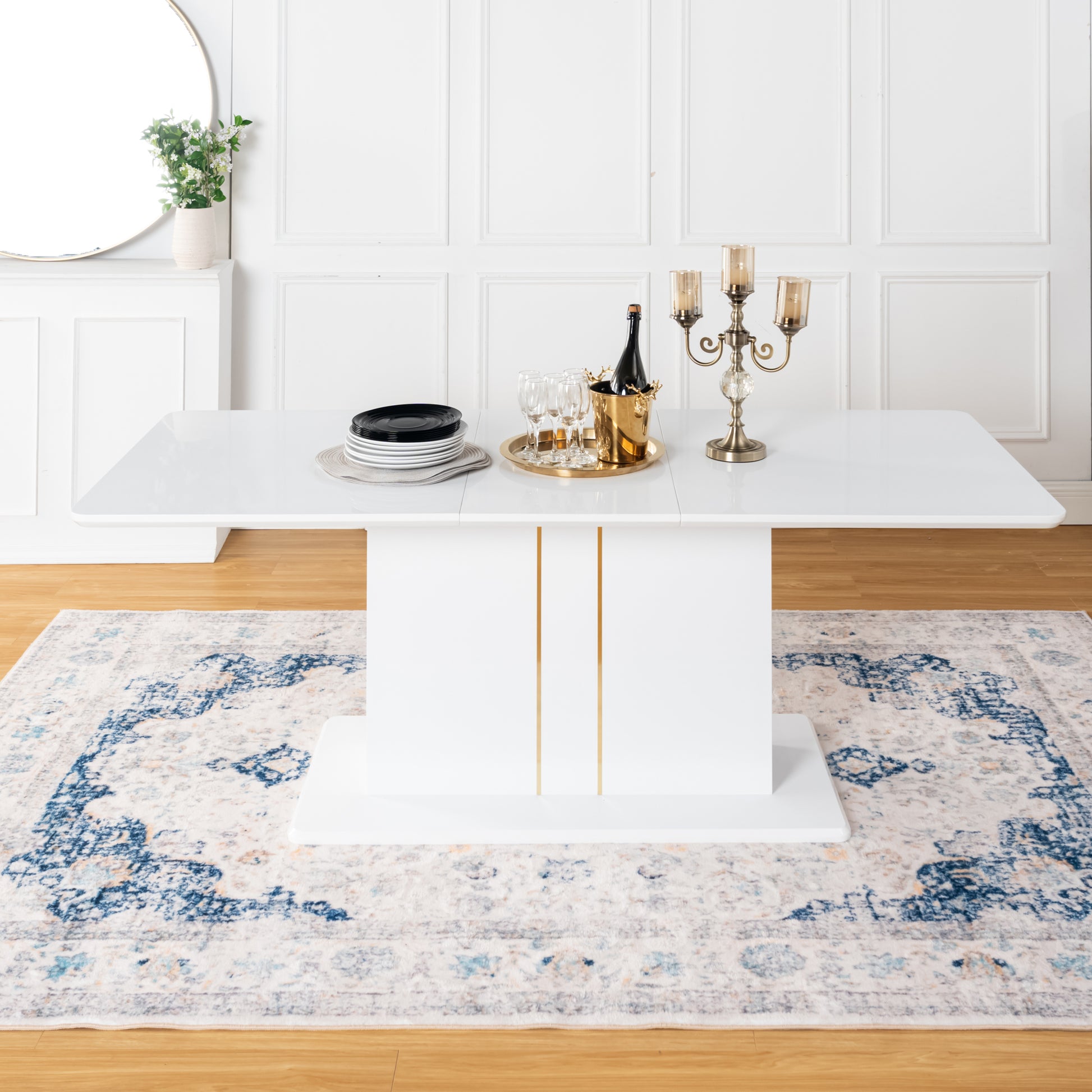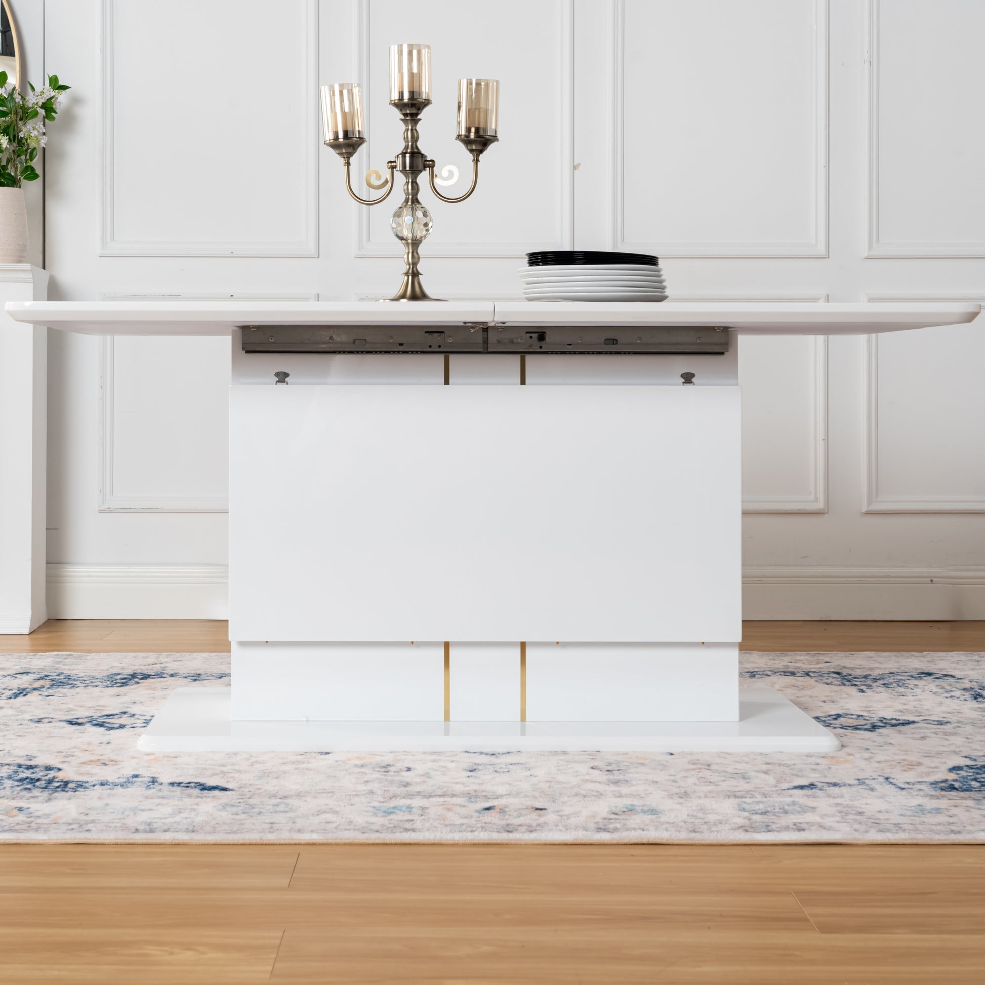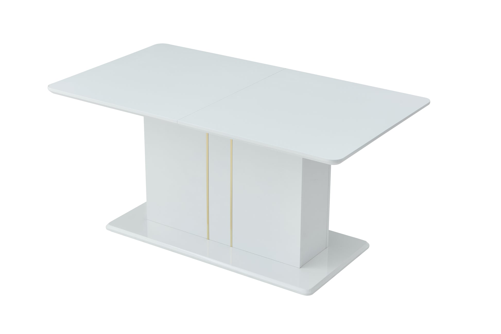 High gloss white dining table with a clean pedestal base and hidden center extension. Rounded corners and gold accents bring a bright modern look to busy homes.