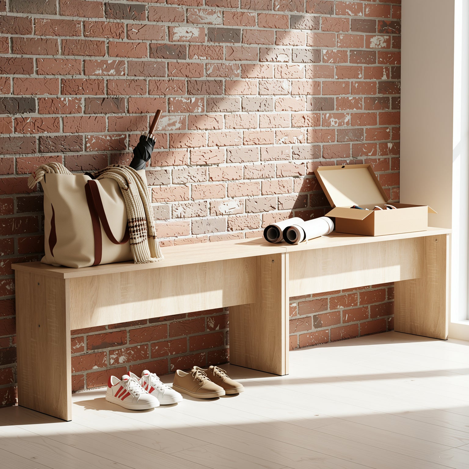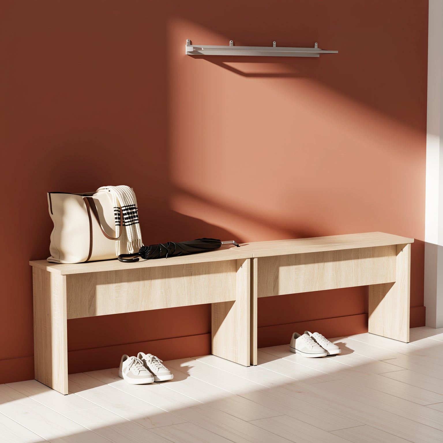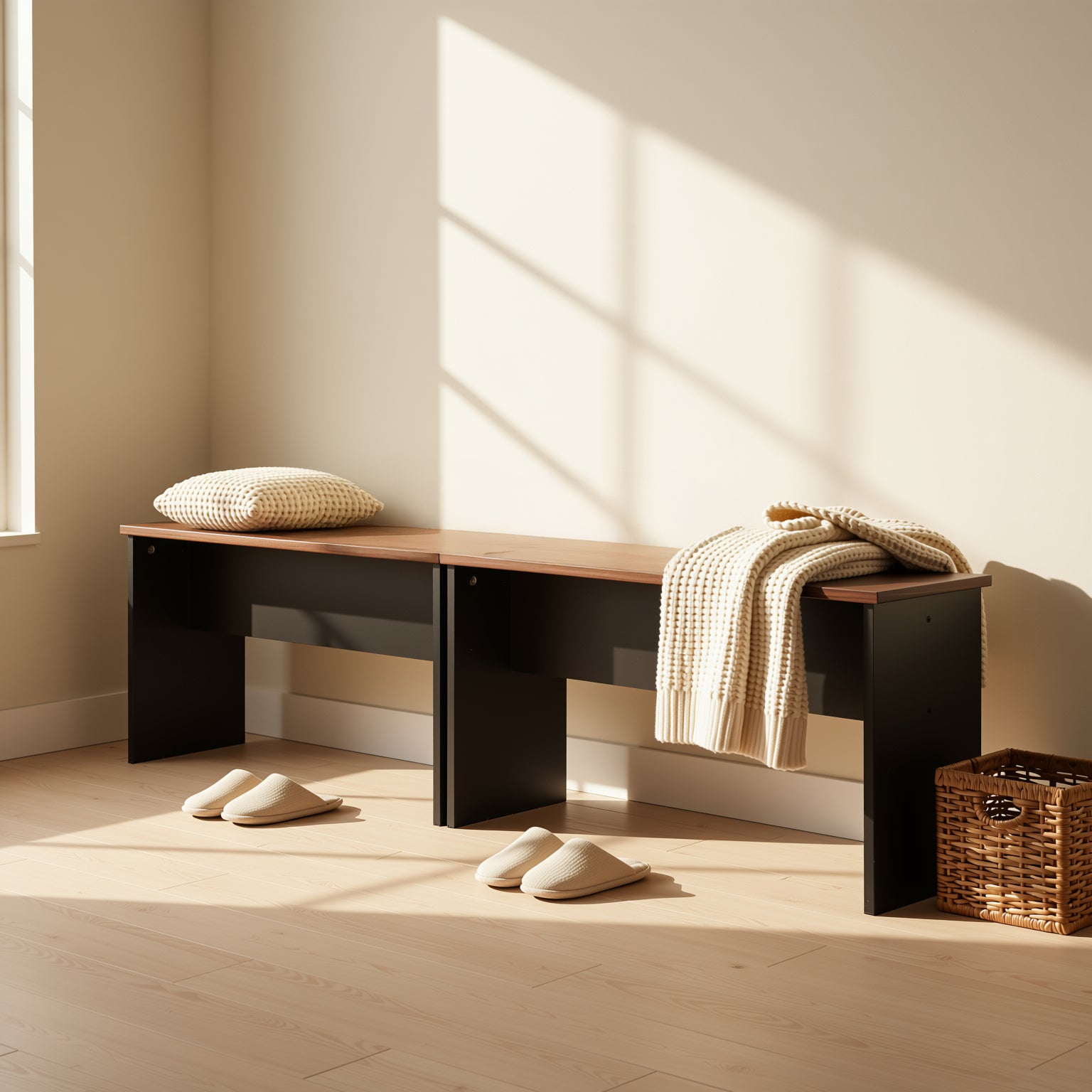 Compact wood dining benches with black base and oak or walnut finish. Minimalist design, perfect for dining, hallway, or bedroom use.
