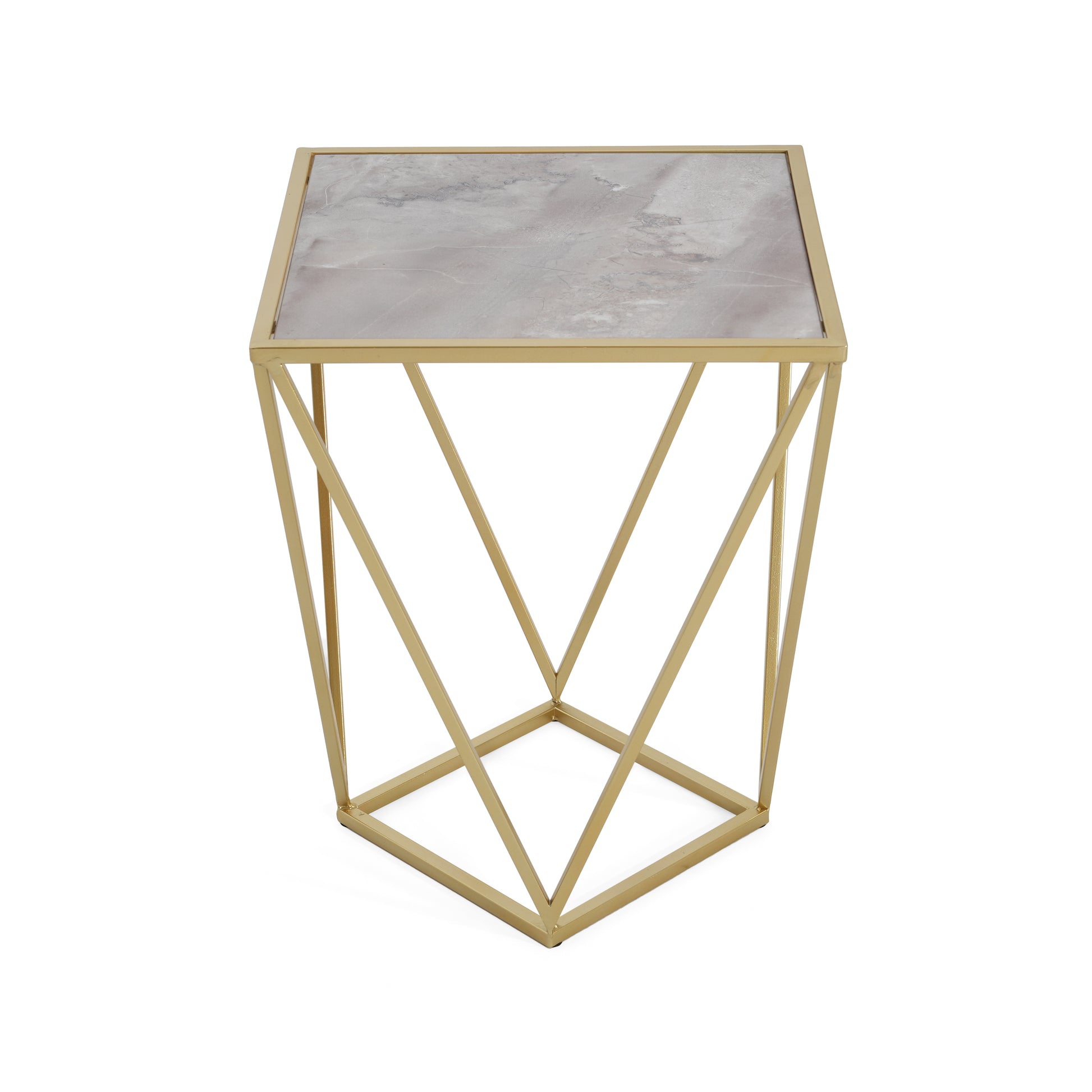 Add a touch of modern elegance to your space with this creative glass side table, featuring a sleek white tempered glass top and geometric gold iron frame for a striking, contemporary accent.