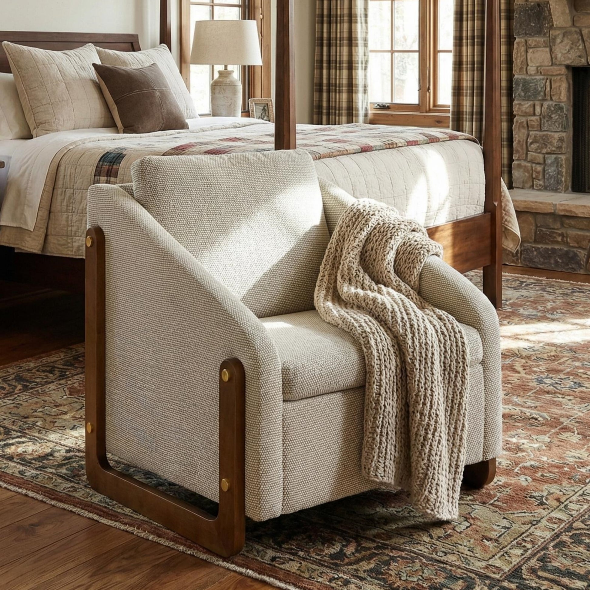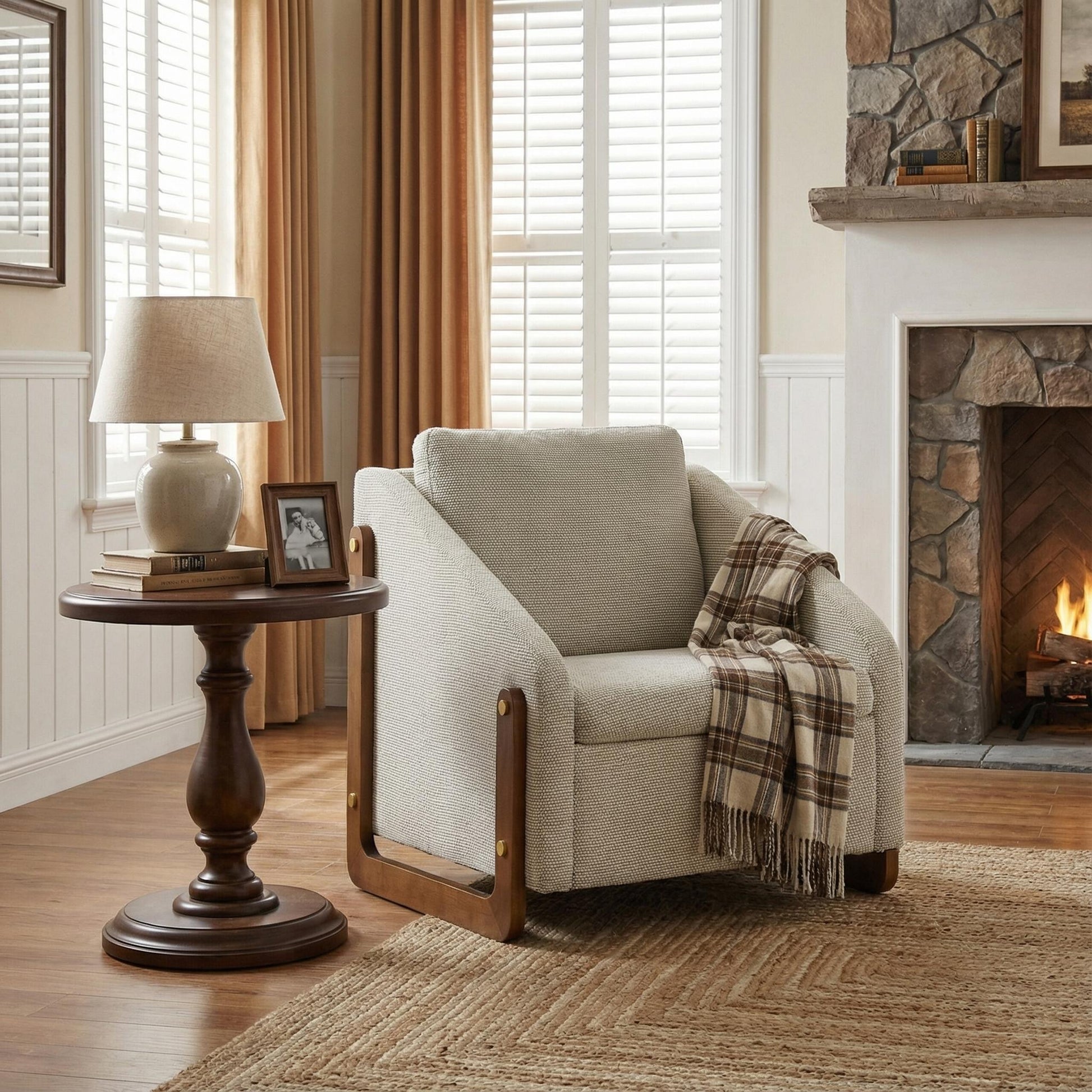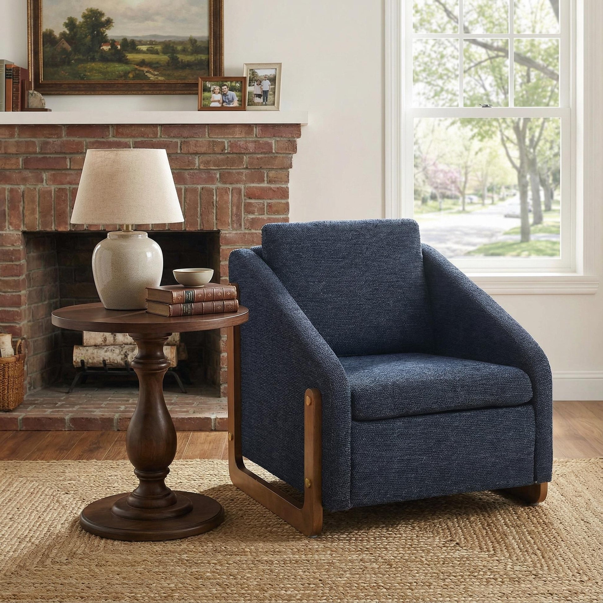 Wrapped in soft chenille and framed with warm wood accents, the Sedgwick armchair brings modern comfort and refined charm to your living room or bedroom.