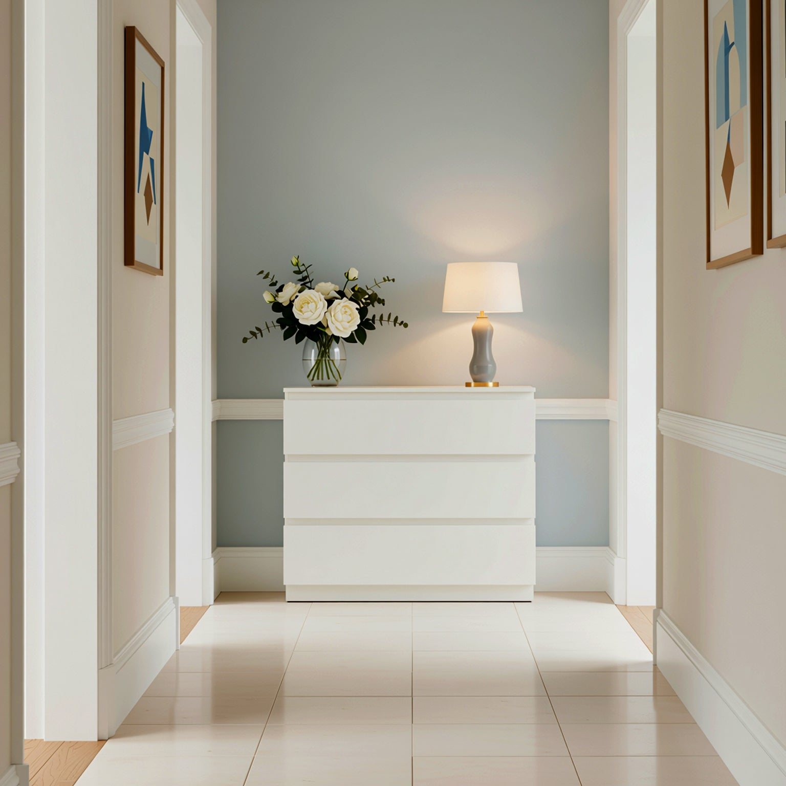 A sleek, glossy white 3-drawer side cabinet offering minimalist style and practical storage for modern interiors.