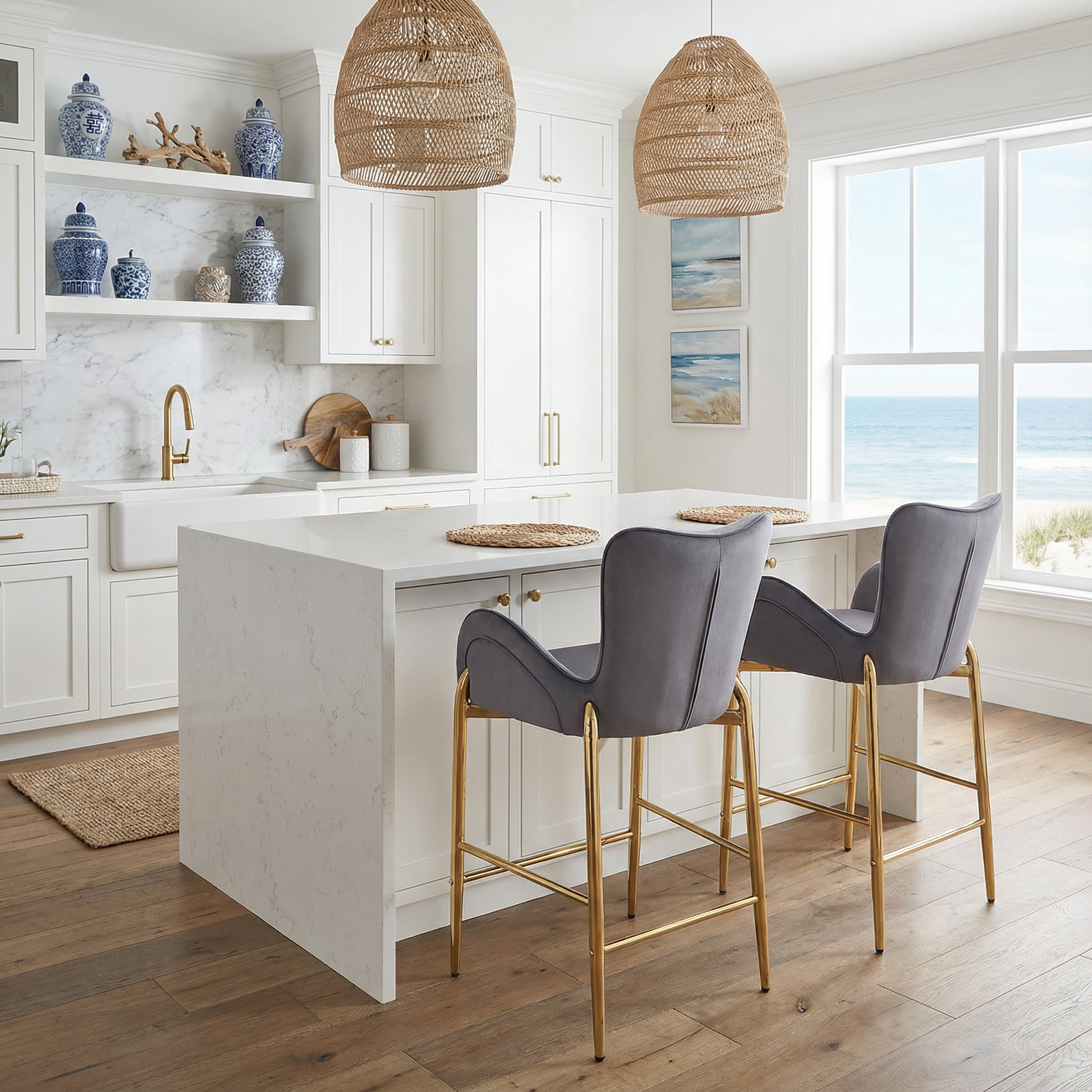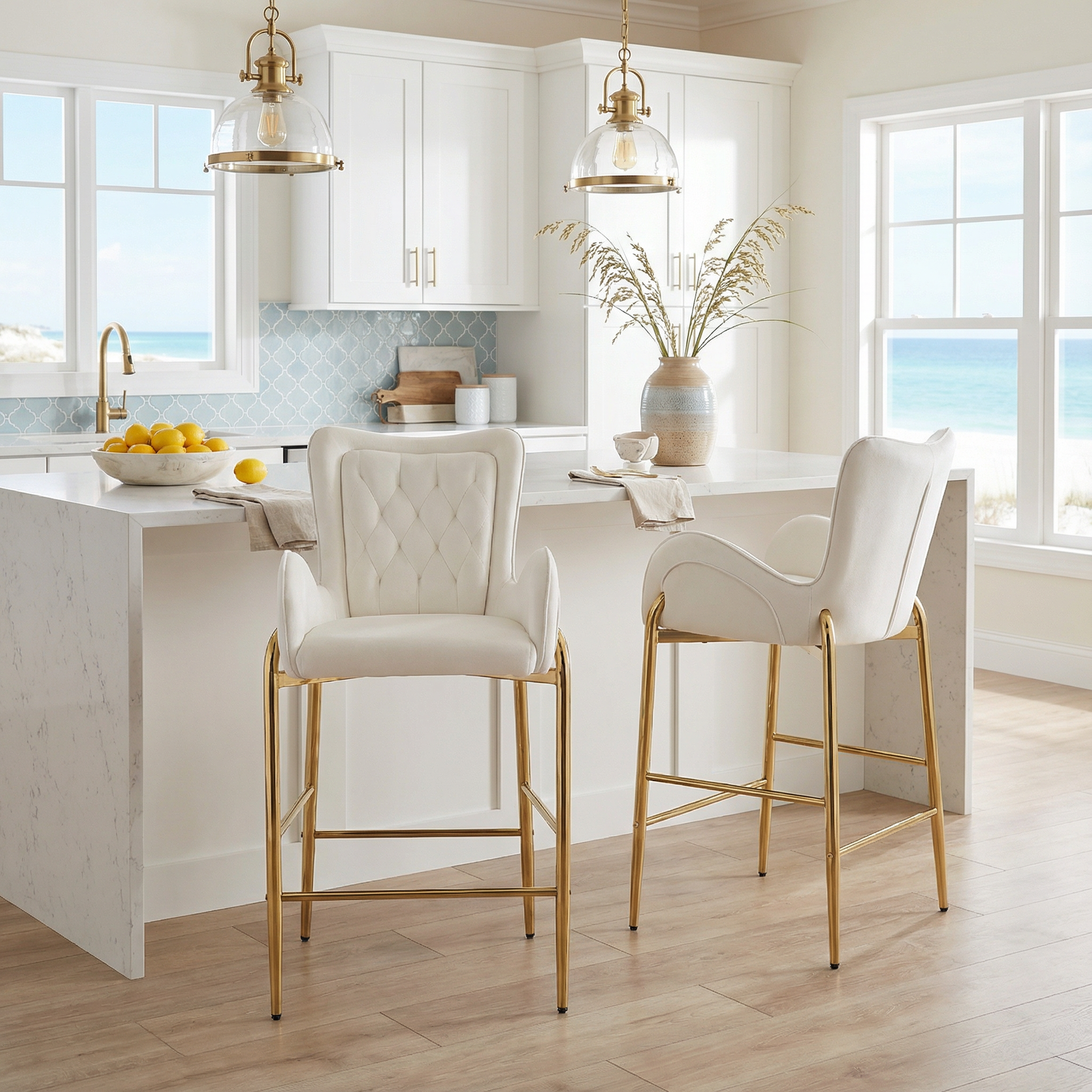 The Seren modern counter-height bar stools combine elegant comfort with timeless design. Wrapped in soft velvet and supported by gold metal legs with a footrest, this set of two brings a luxurious accent to kitchen islands or dining spaces. Available in Grey and White.