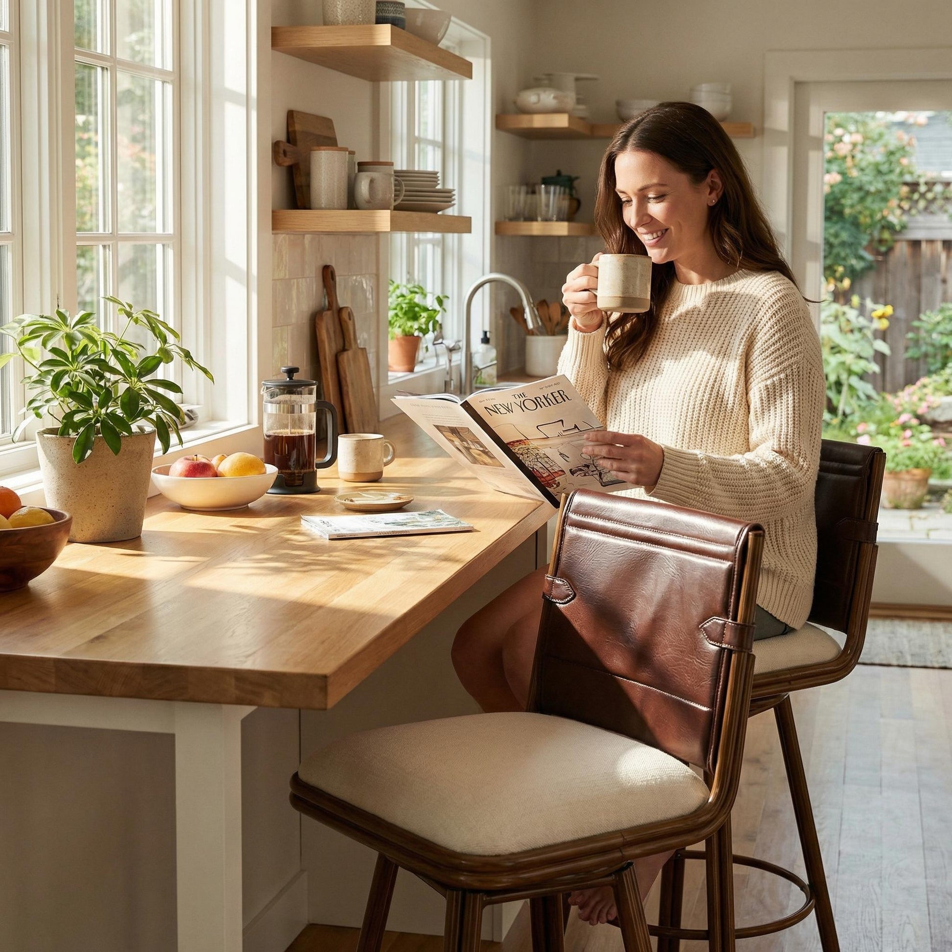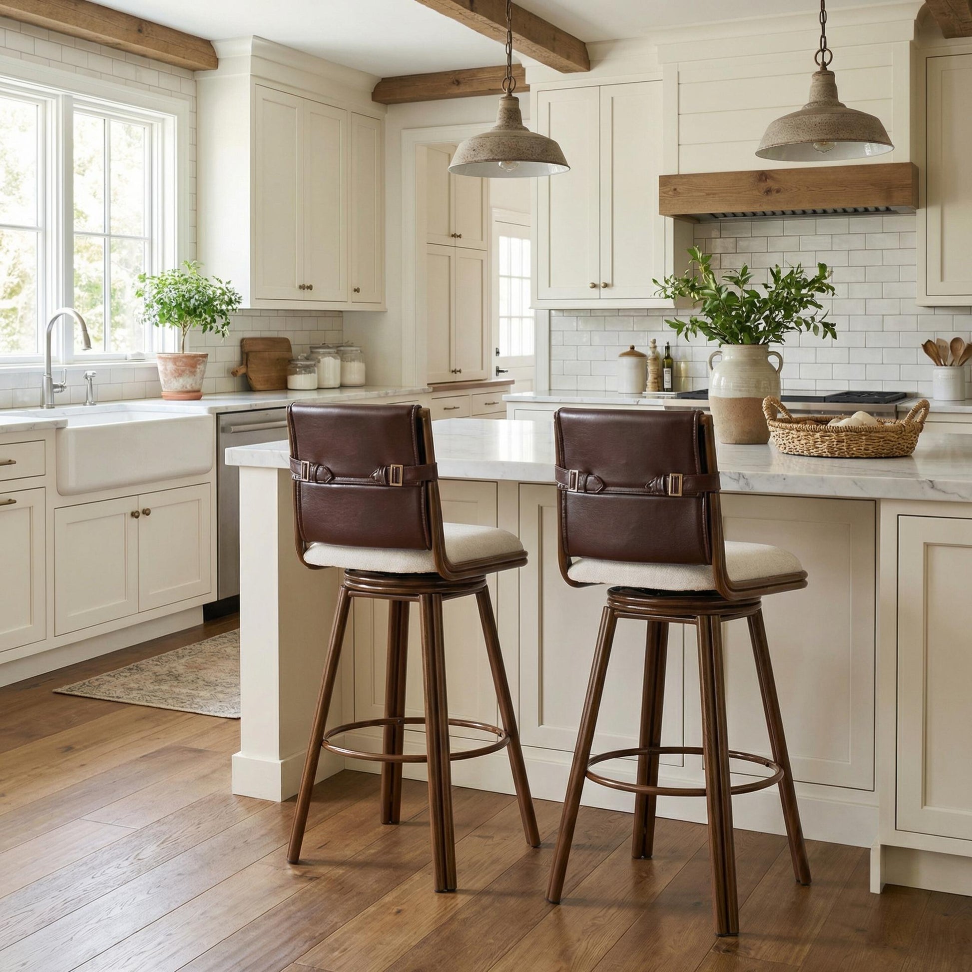 Set of 2 counter height bar stools with smooth 360° swivel, plush PU leather upholstery, and a sturdy walnut-finished metal frame. Perfect for kitchen islands or home bars, these stools offer comfort, style, and easy-care durability for everyday living.