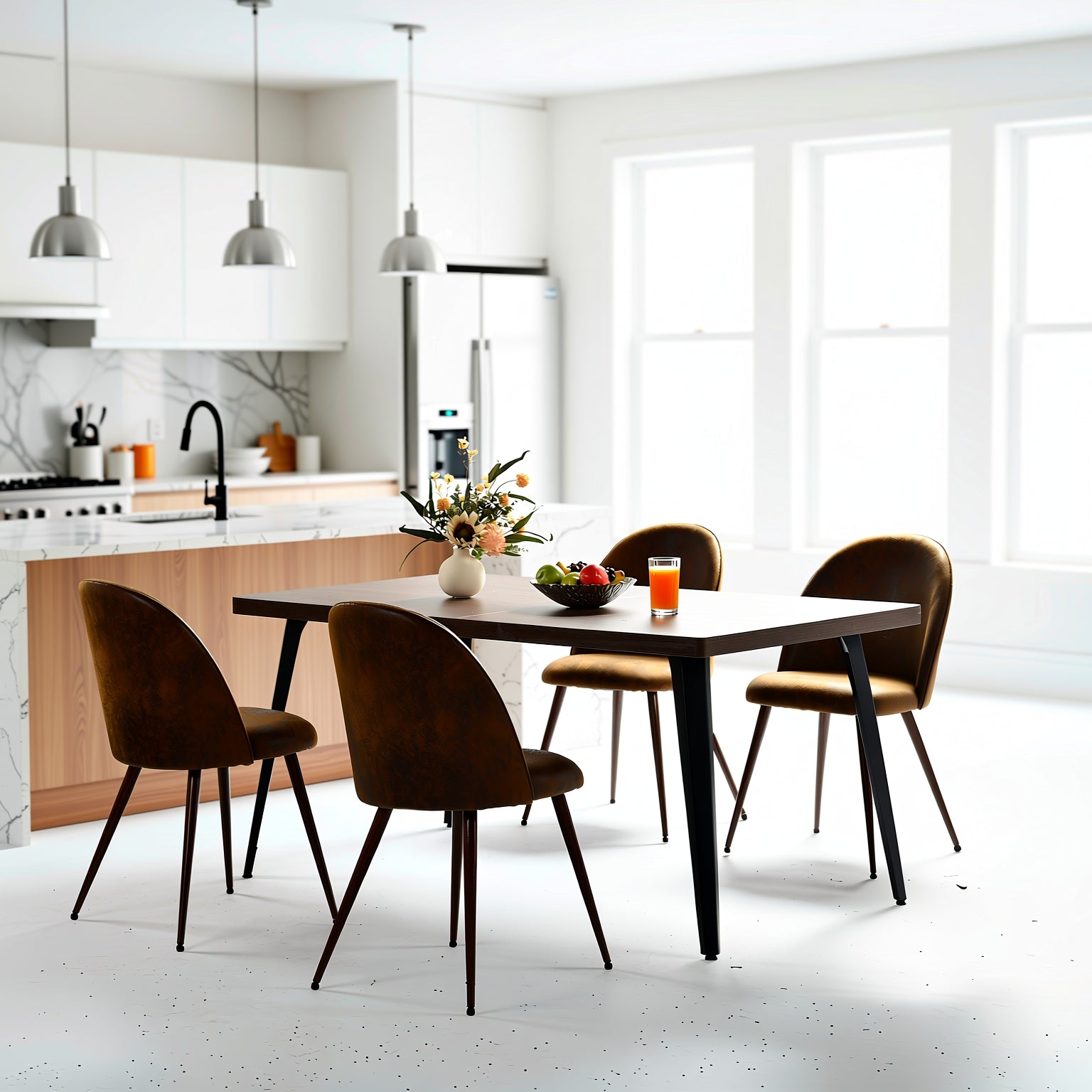 Modern walnut dining table paired with four high-back upholstered chairs in grey, beige, or brown. Ideal for compact dining areas with a clean, timeless style.