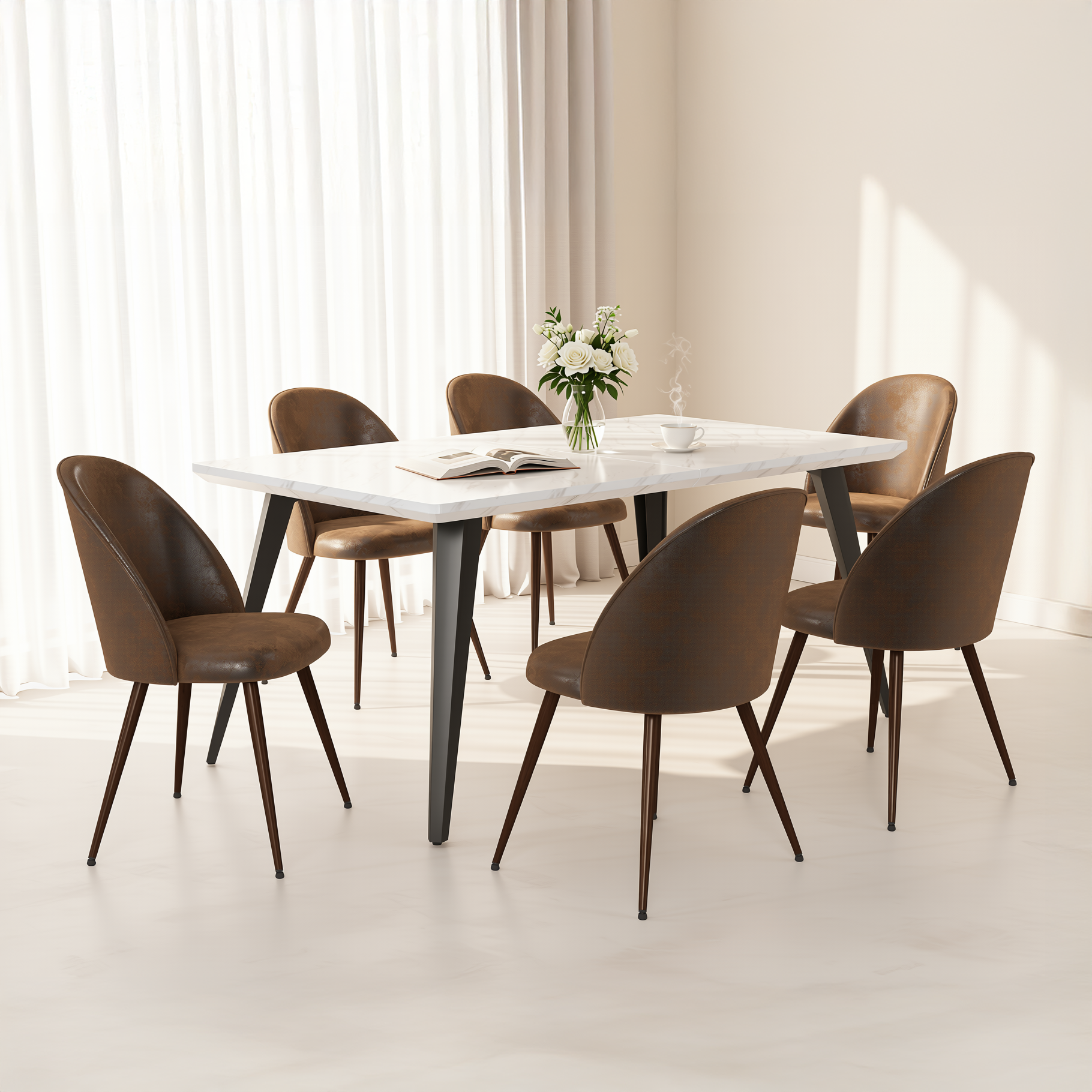 Modern white marble dining table paired with six high-back upholstered chairs in grey, beige, or brown. Perfect for family dining rooms, offering timeless style and comfortable seating for gatherings.