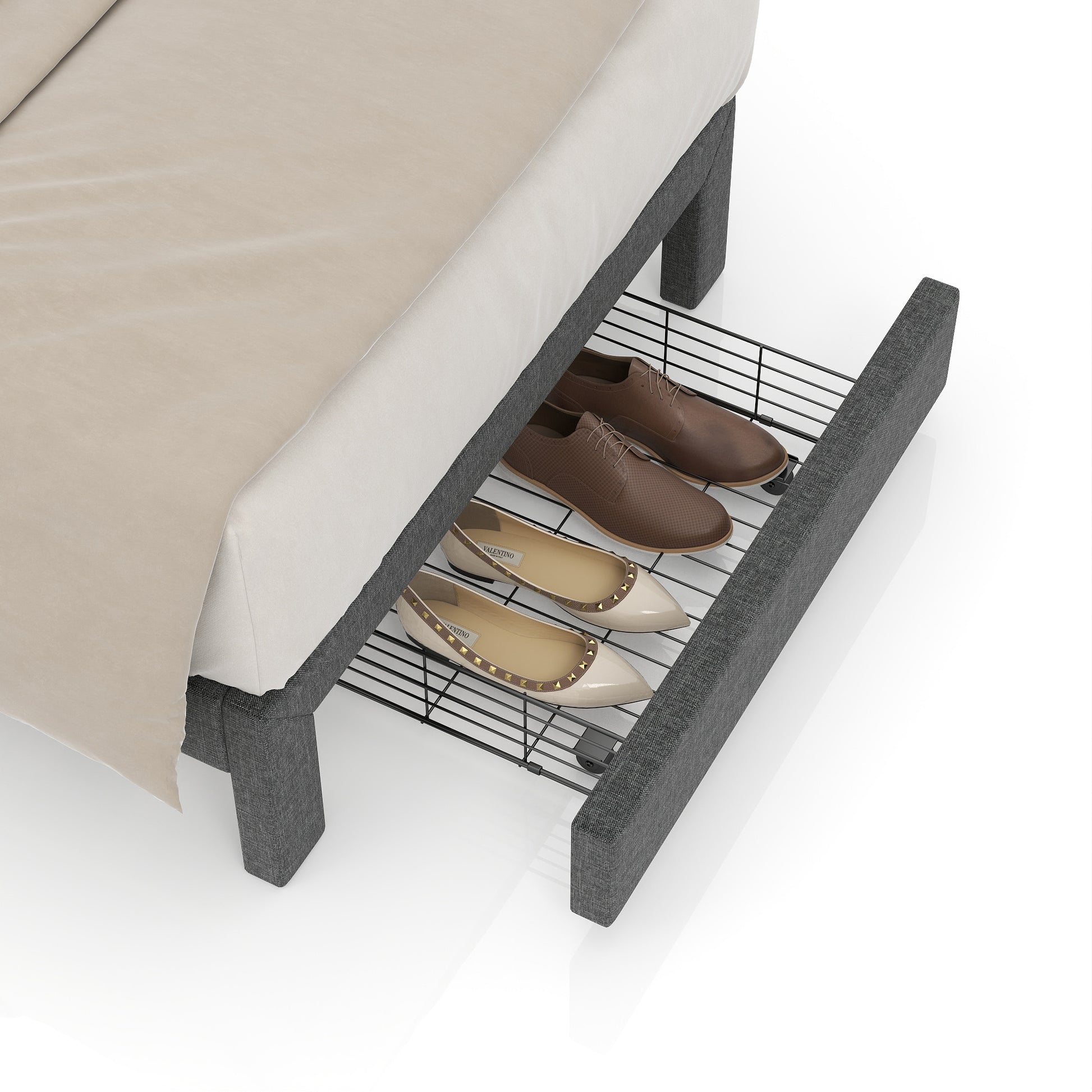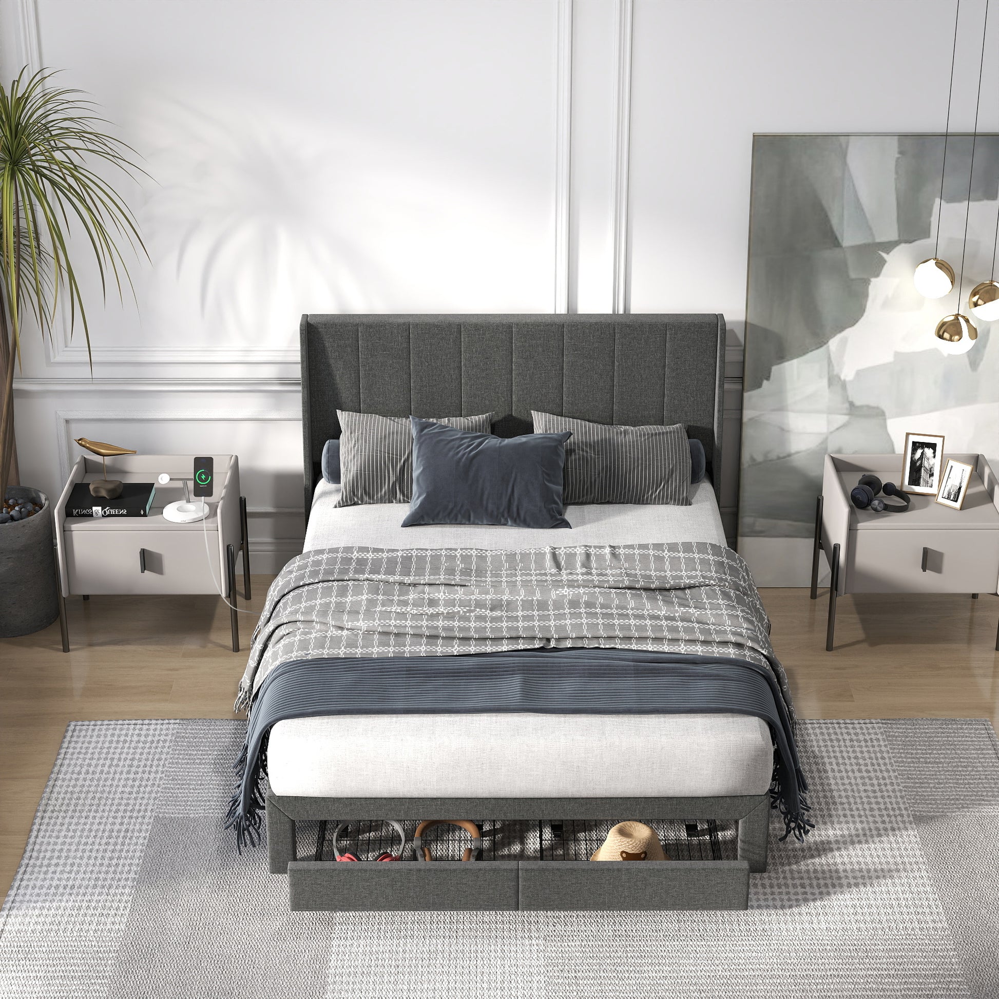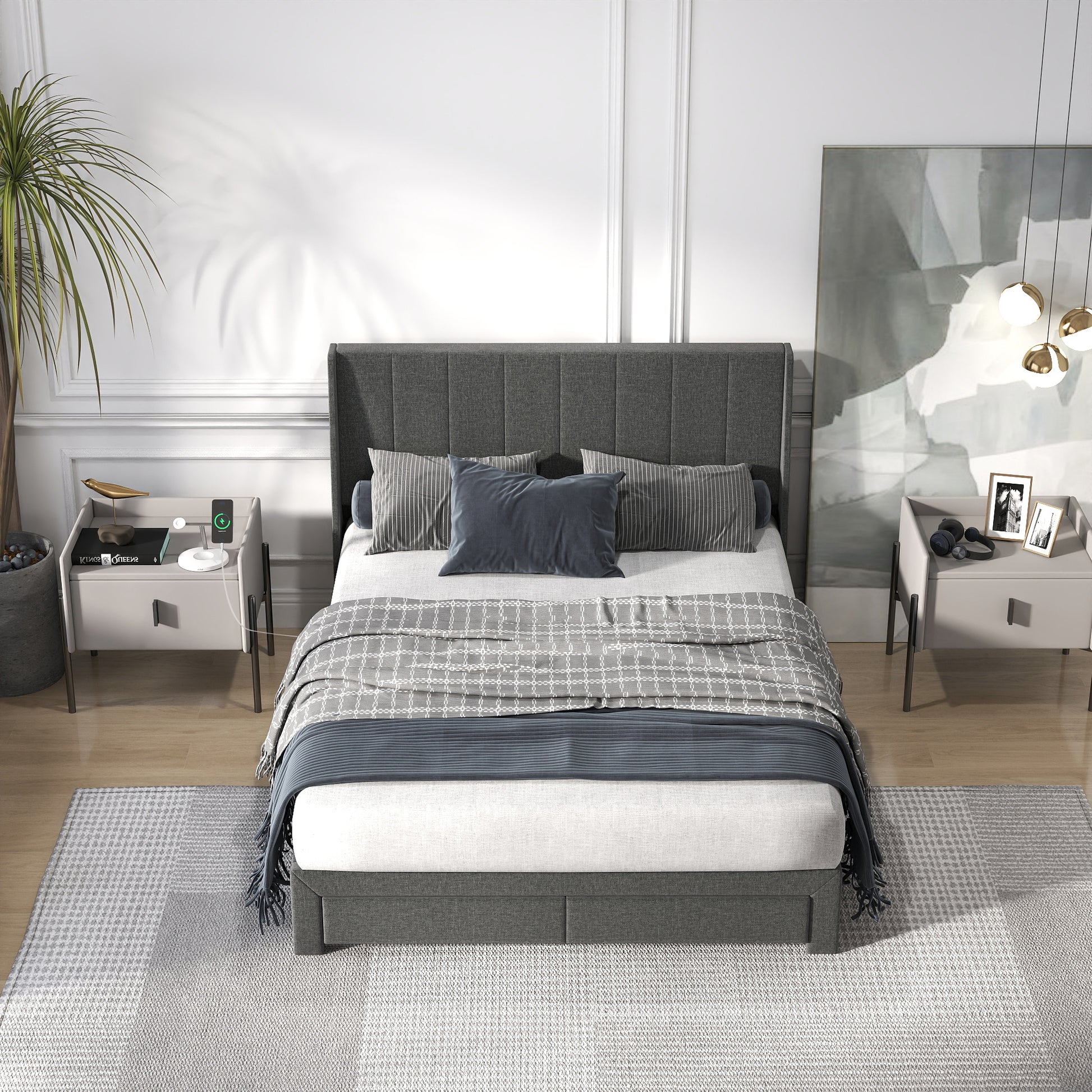 The SUMMIT platform bed features a beige upholstered finish, a tall wingback headboard, USB ports, and under-bed drawers. Combining comfort and elegance for modern bedrooms.