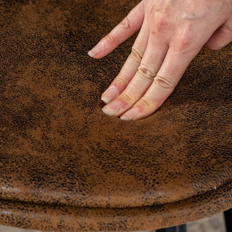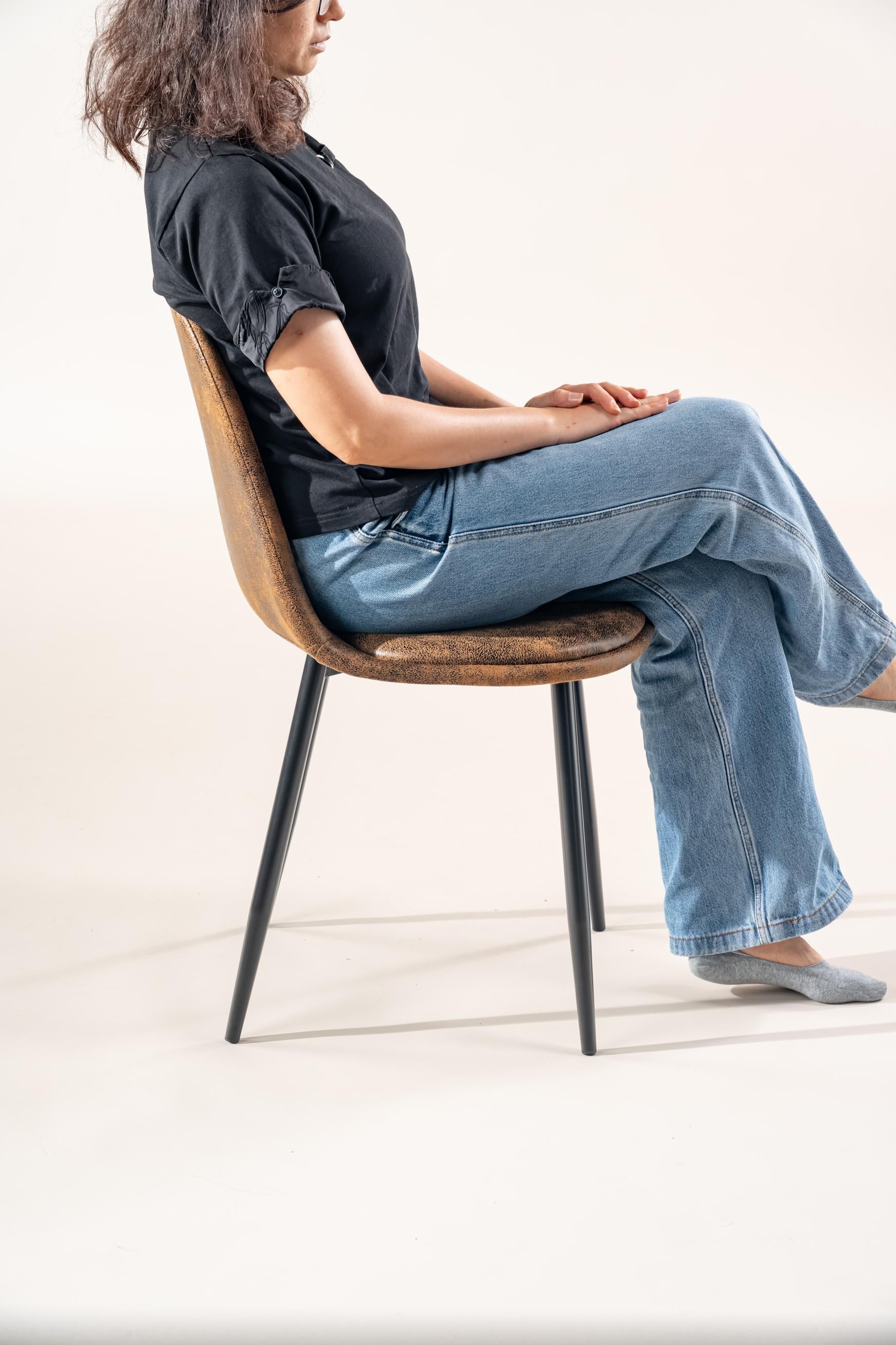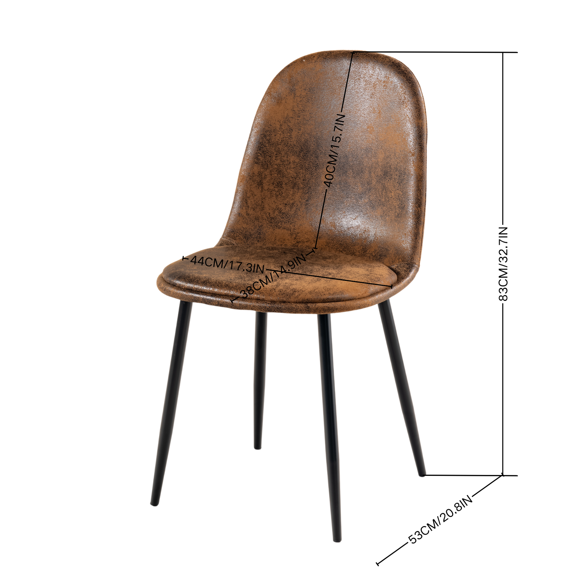 A set of four vintage-inspired dining chairs in brown faux suede, featuring contoured seats and sturdy black metal legs. Perfect for dining rooms, kitchens, or cafes, these chairs blend retro charm with modern comfort and support.