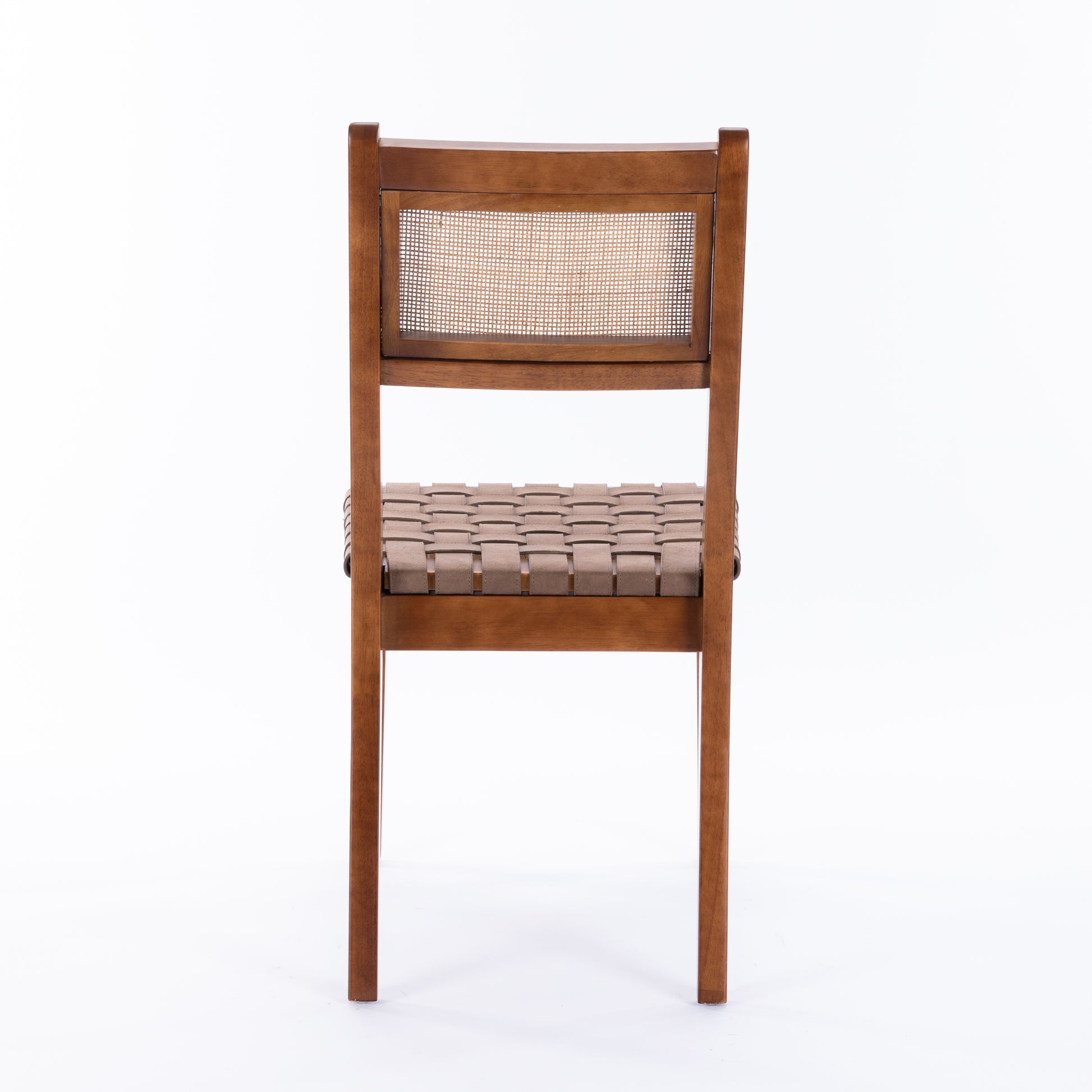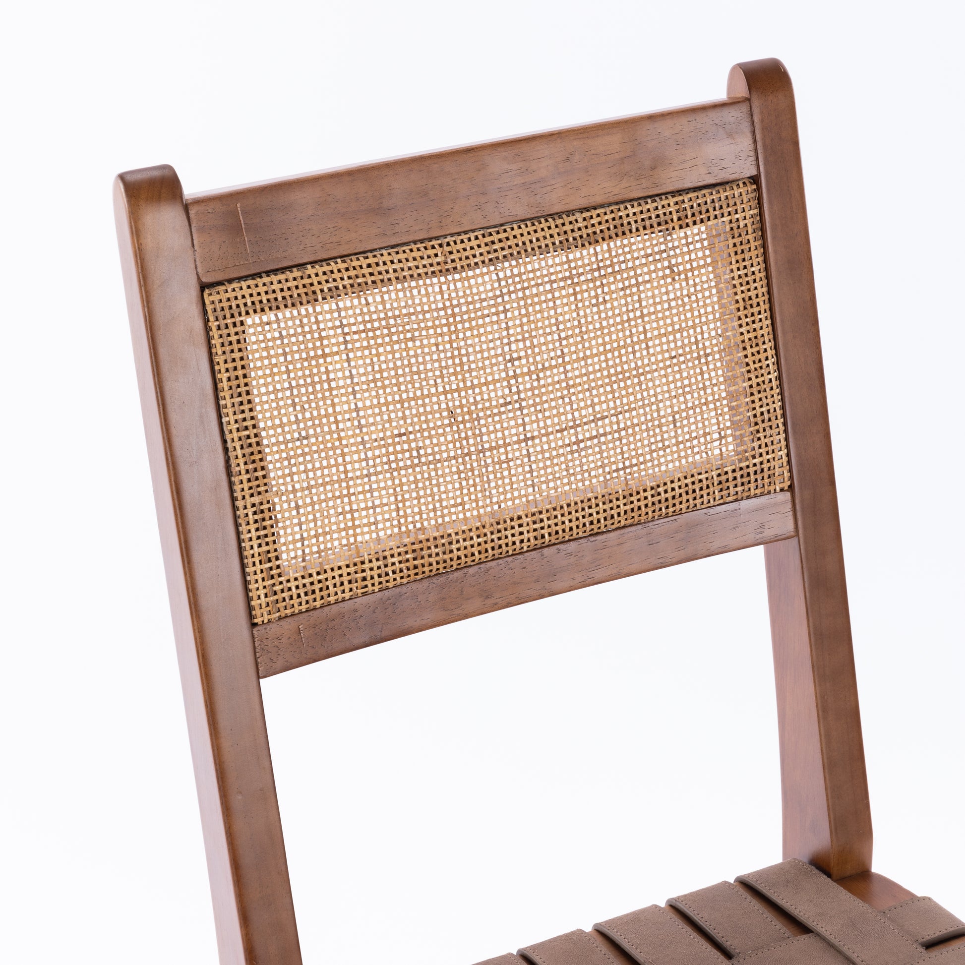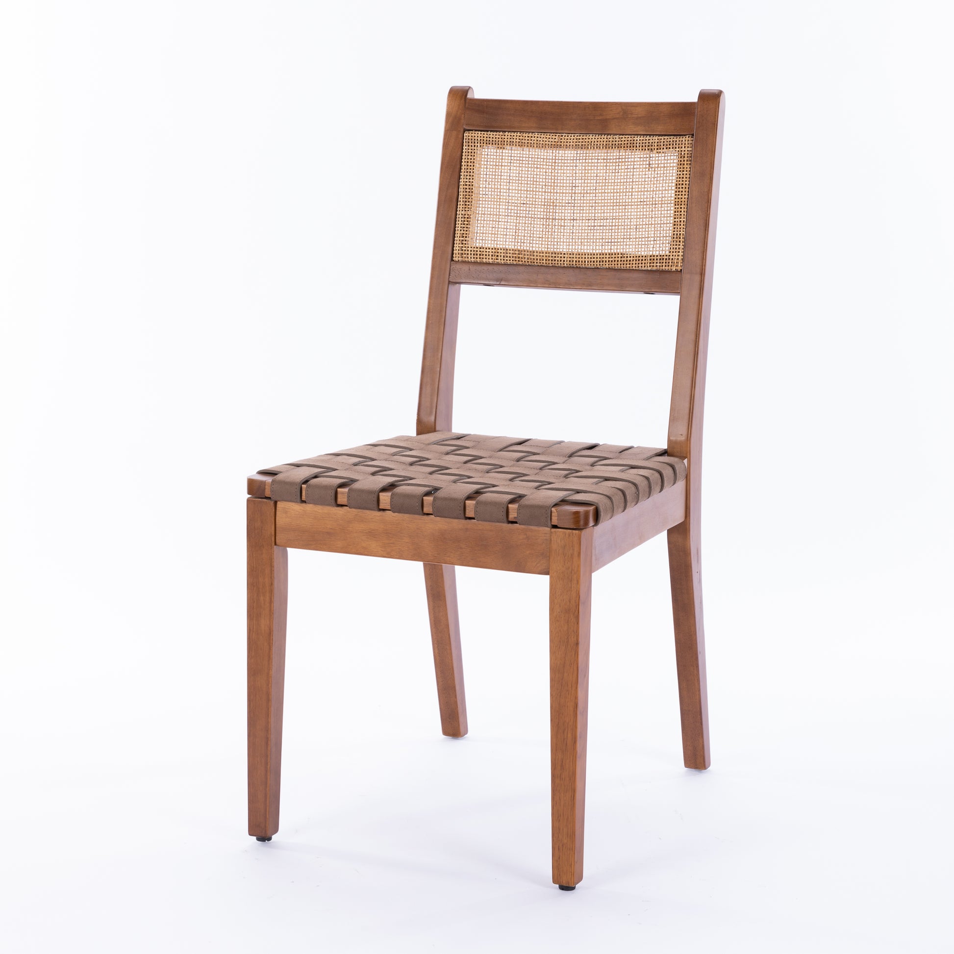 Set of 2 contemporary dining chairs featuring a woven faux leather seat, rattan backrest, and solid rubber wood frame. Perfect for adding natural texture and modern style to dining rooms or kitchens.