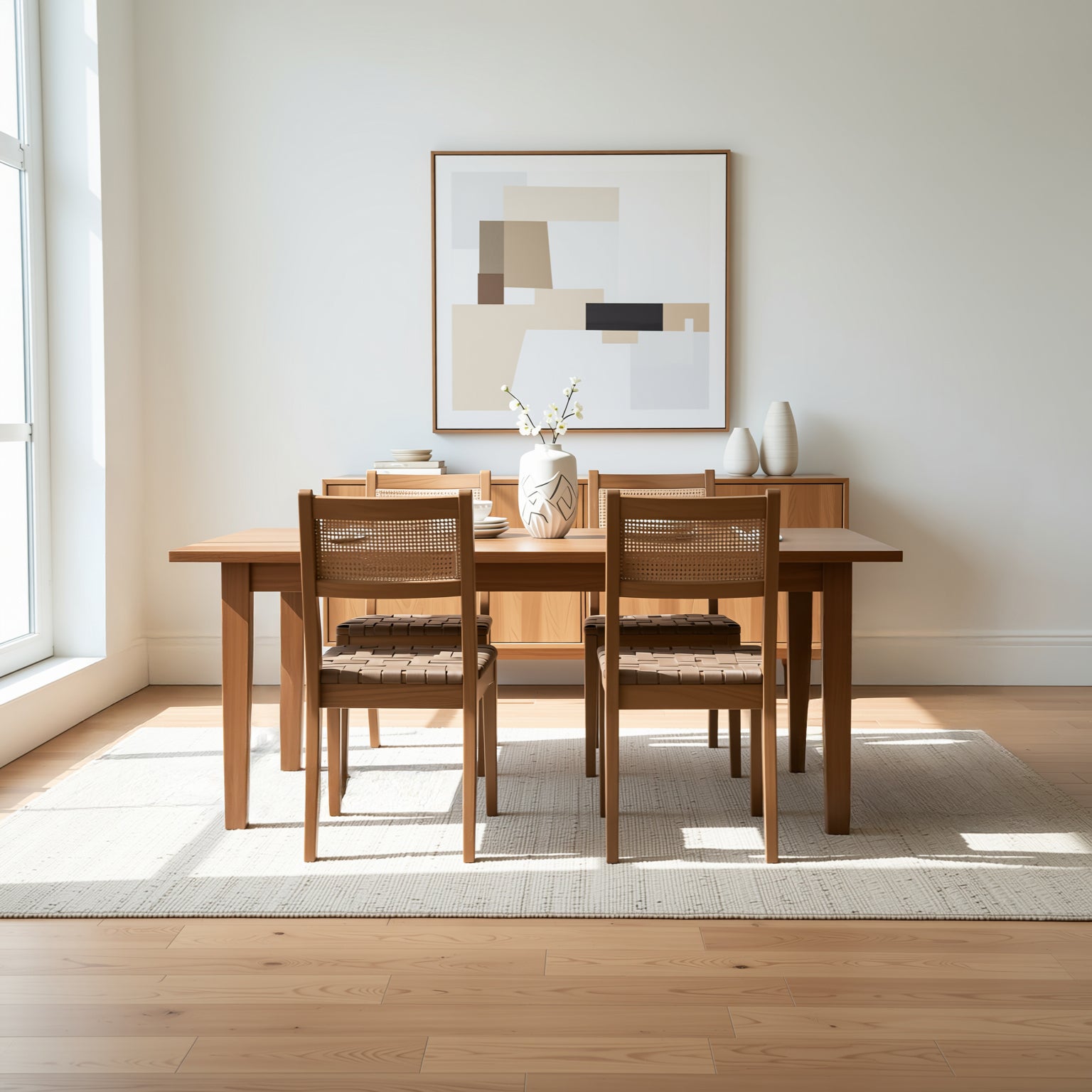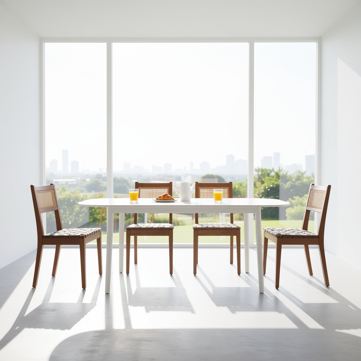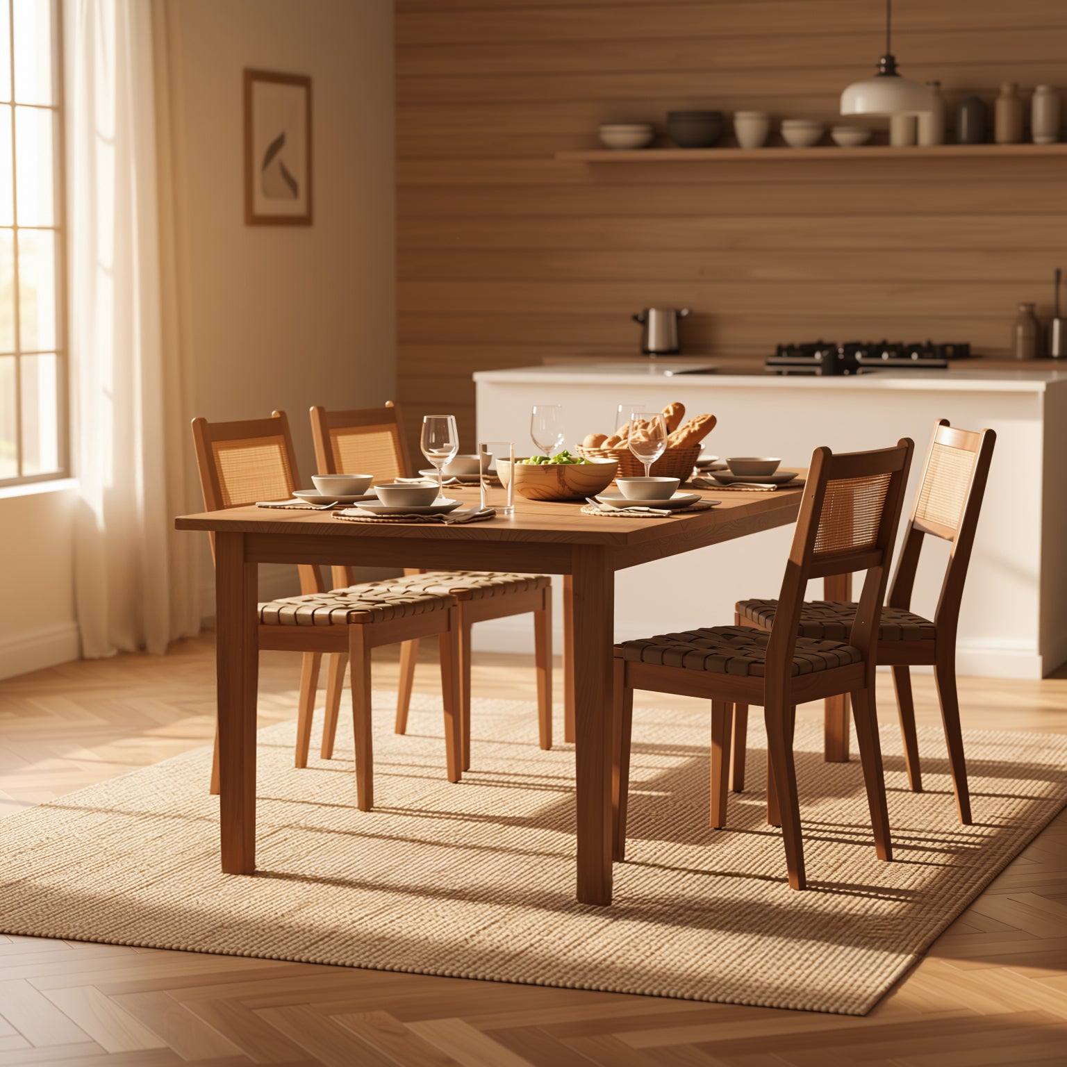 Set of 2 contemporary dining chairs featuring a woven faux leather seat, rattan backrest, and solid rubber wood frame. Perfect for adding natural texture and modern style to dining rooms or kitchens.