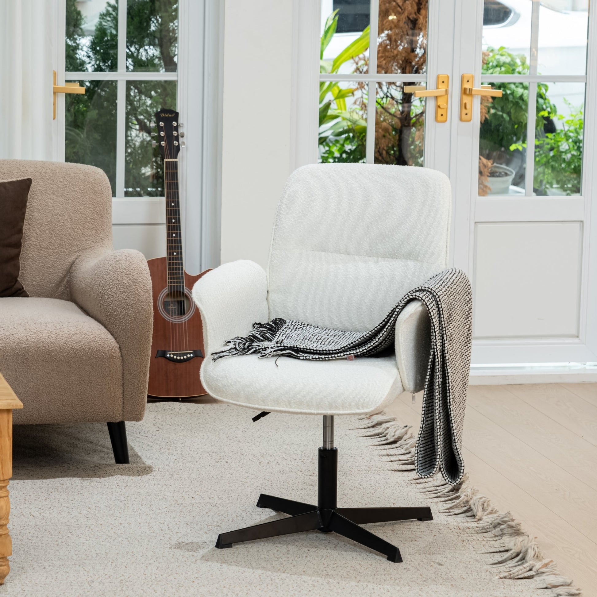The seat and backrest are generously padded and wrapped in a cozy boucle or vintage suede-style finish for timeless charm.