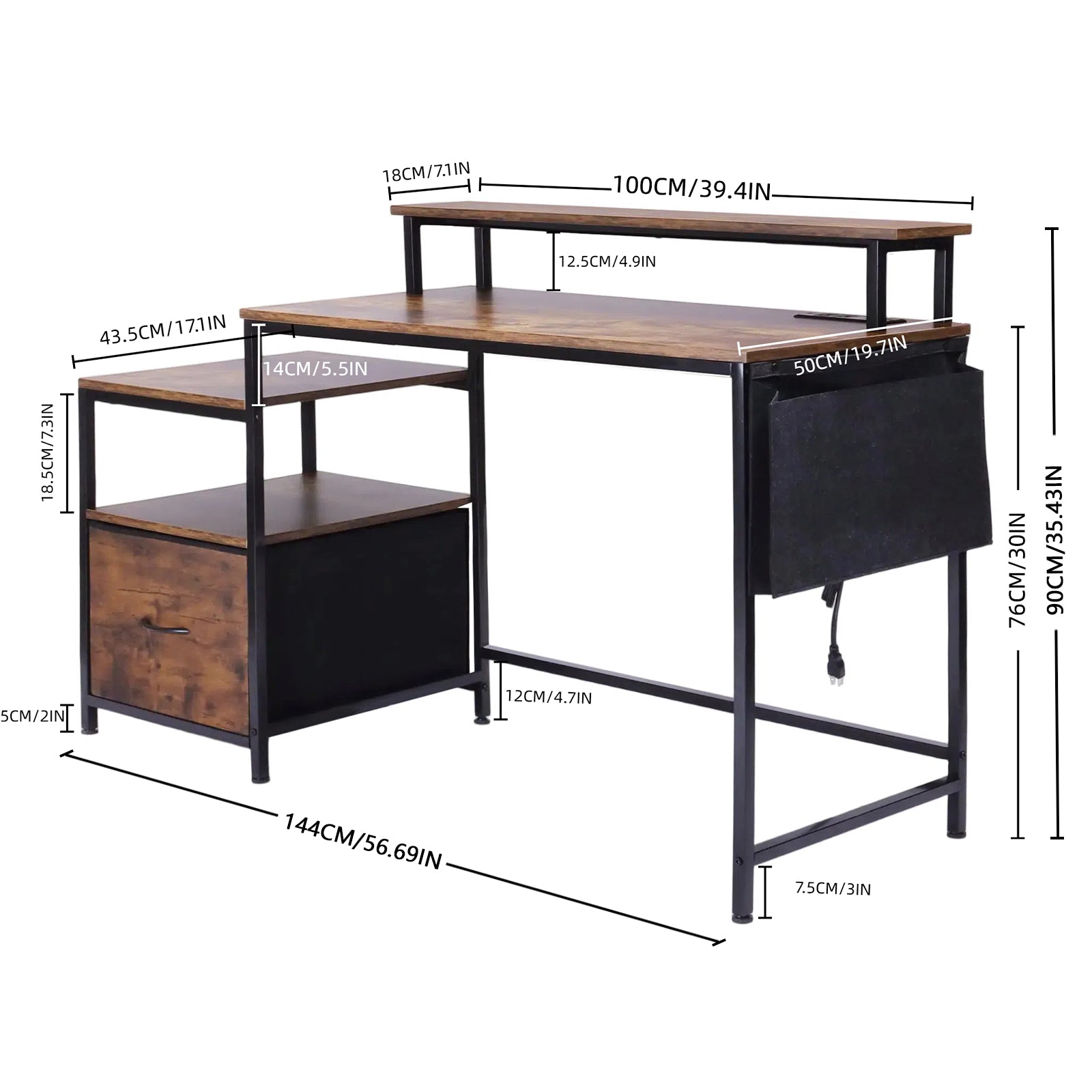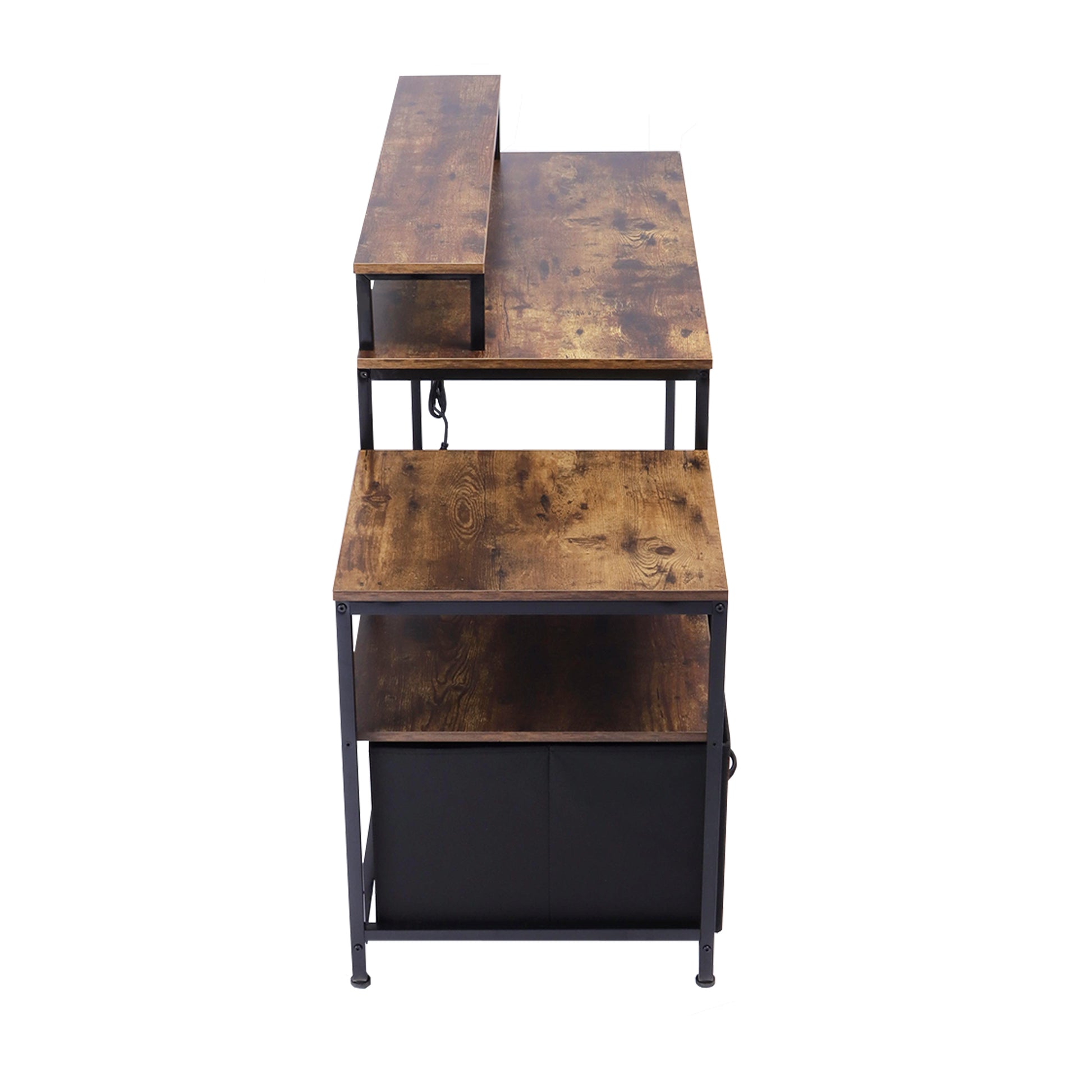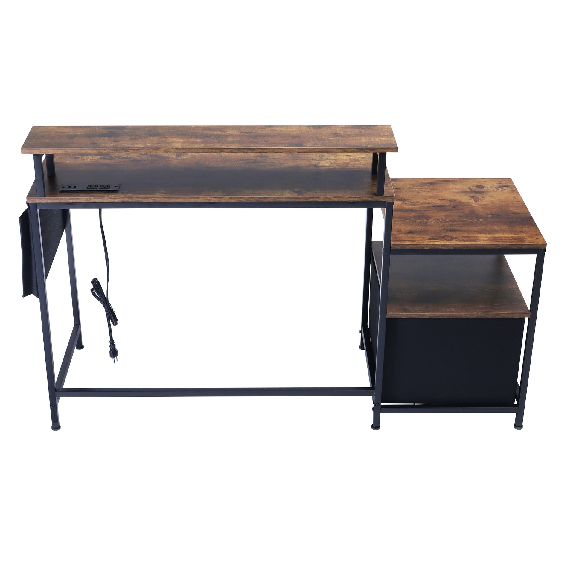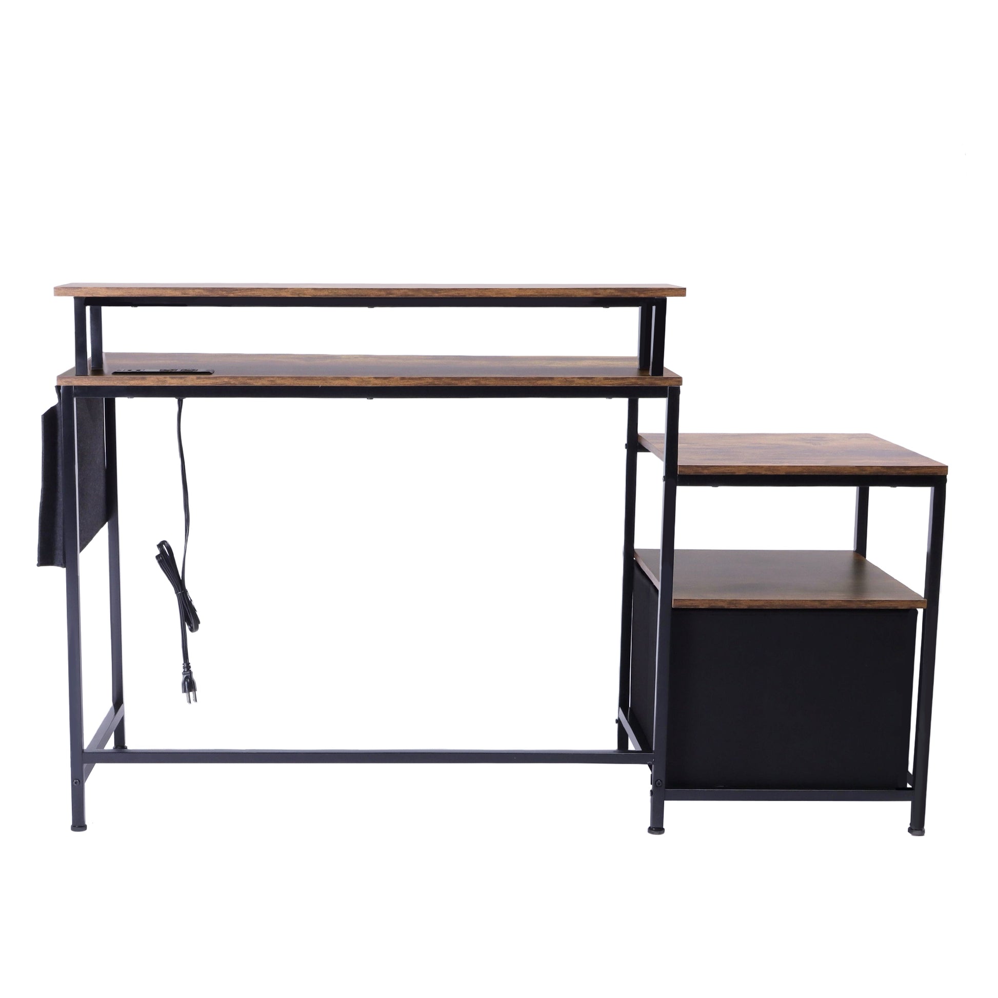 Compact workstation with a raised monitor shelf, built-in charging, side drawer and shelves, fabric file holder, and a sturdy steel frame in a rustic brown finish.