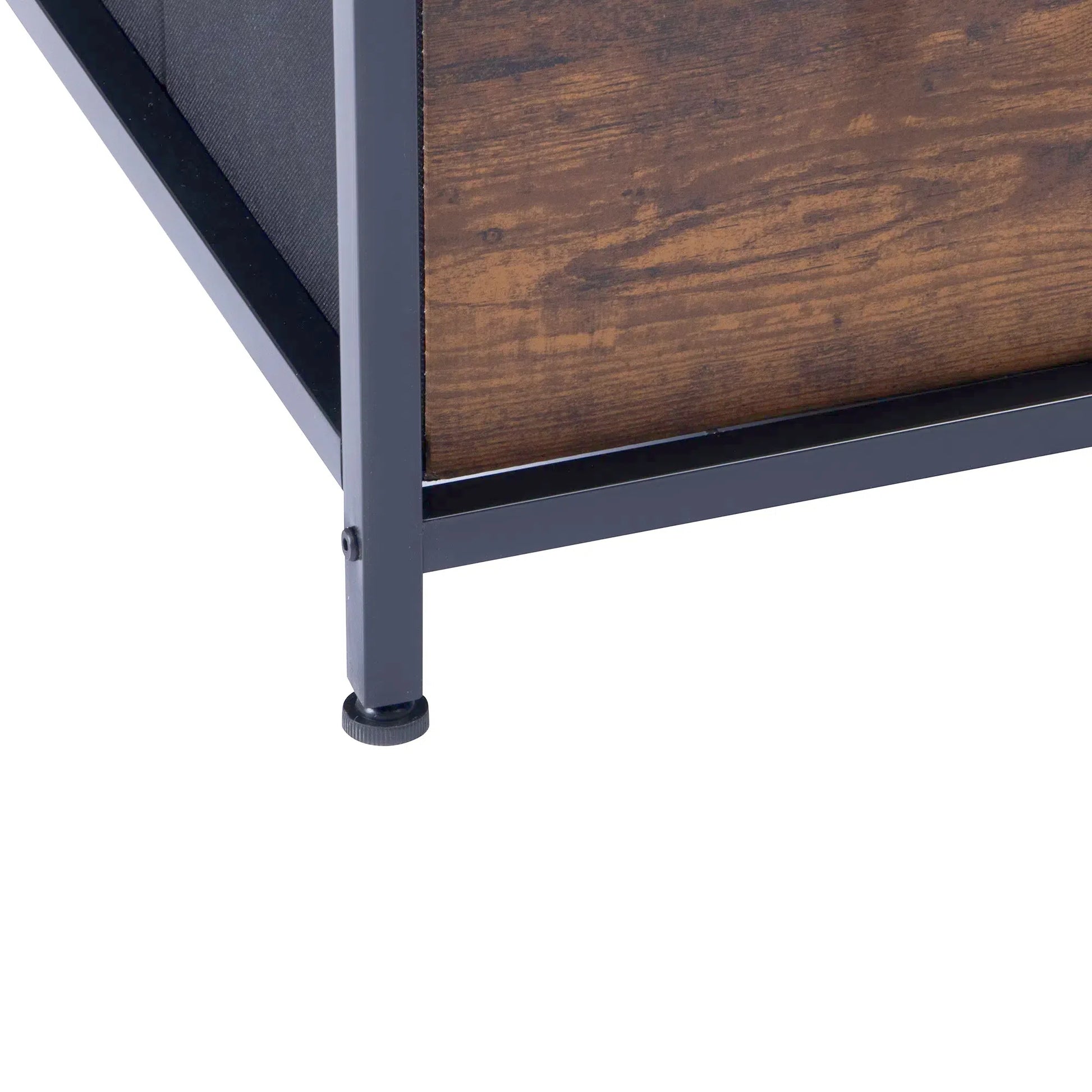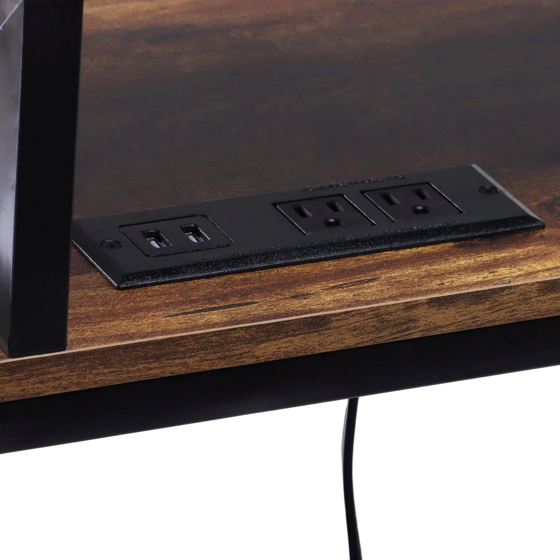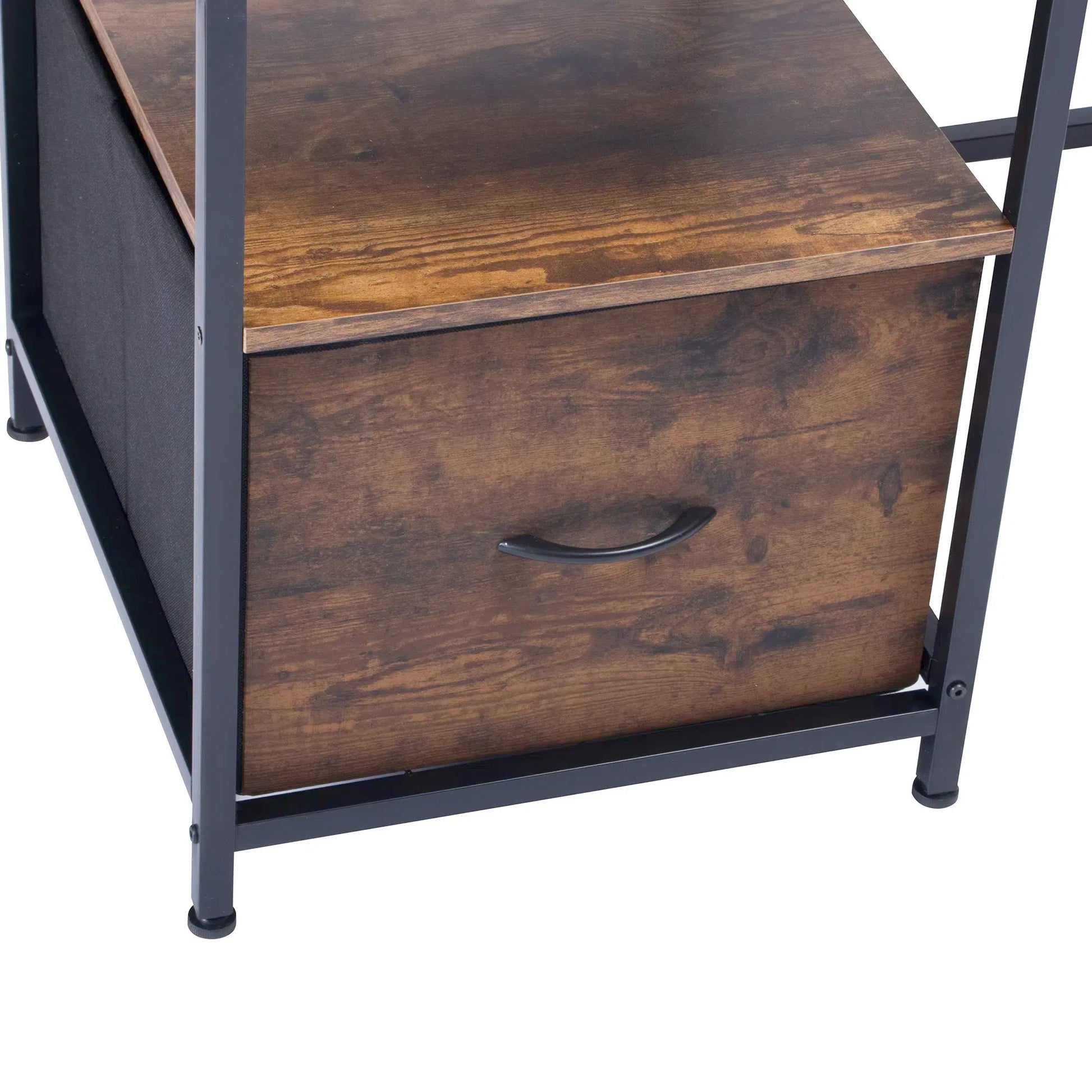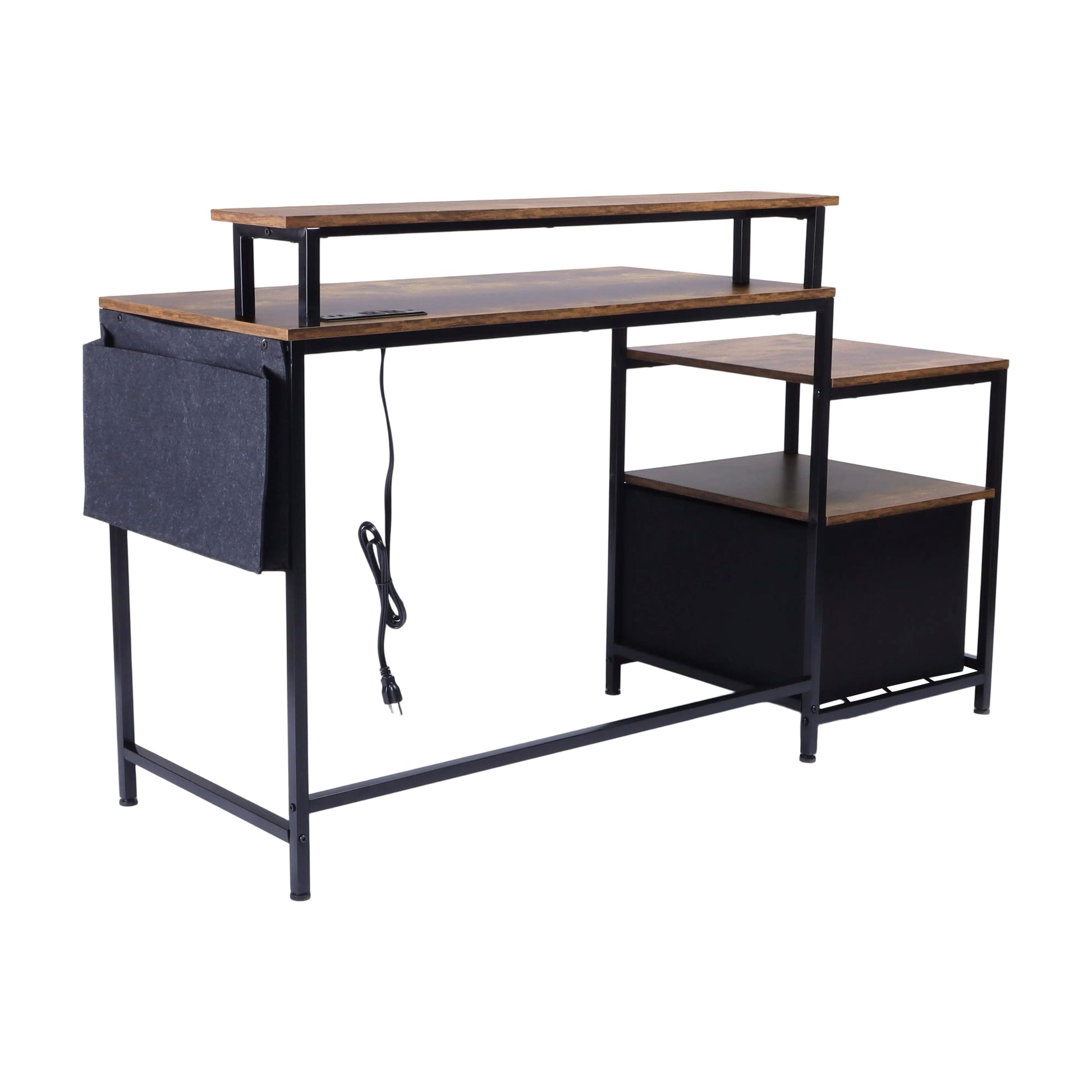 Compact workstation with a raised monitor shelf, built-in charging, side drawer and shelves, fabric file holder, and a sturdy steel frame in a rustic brown finish.