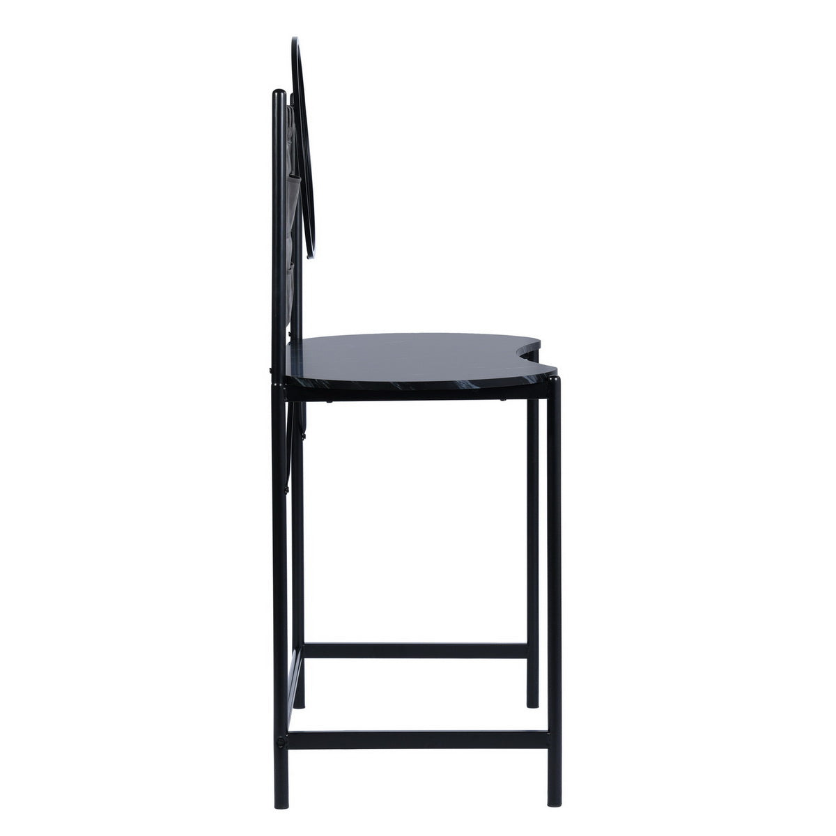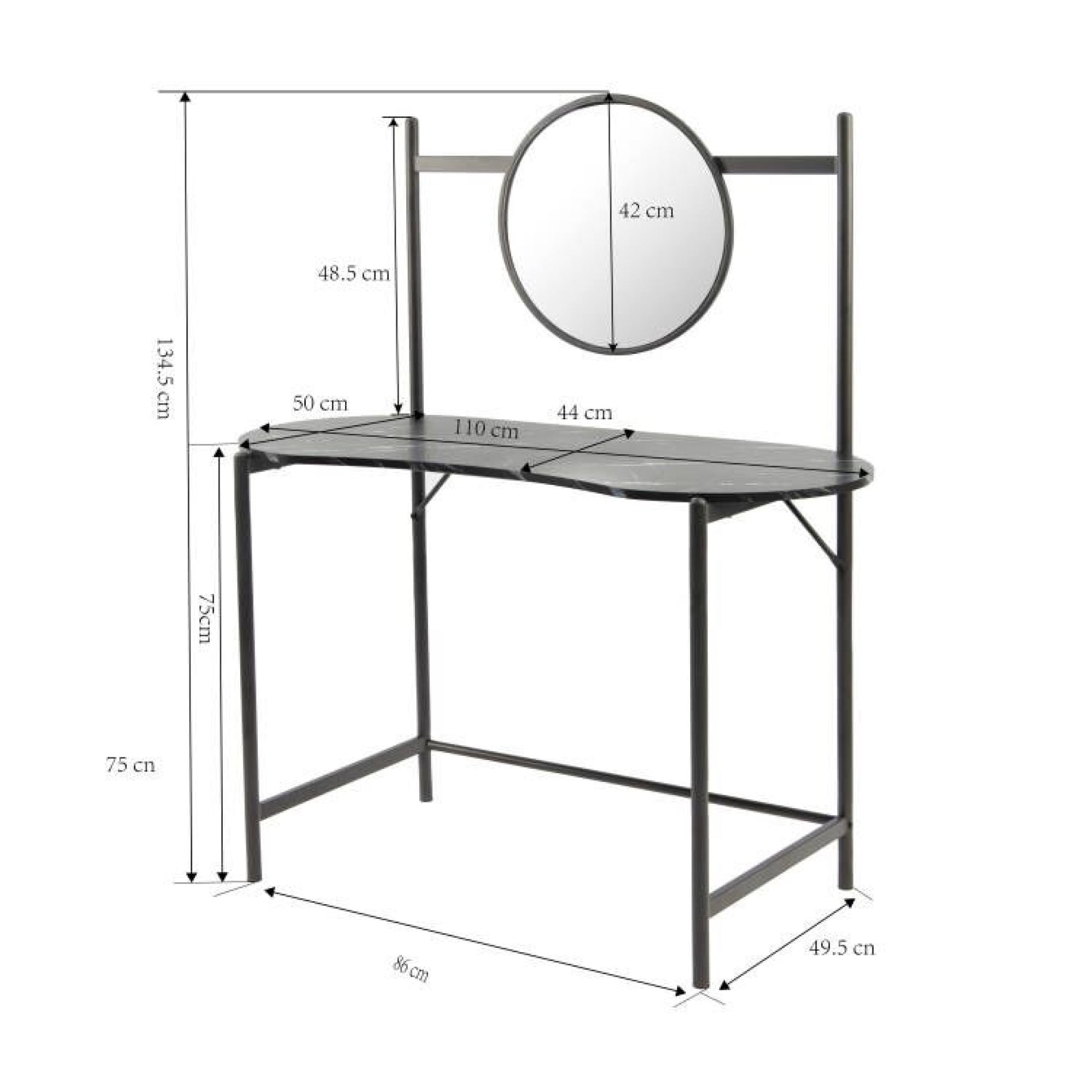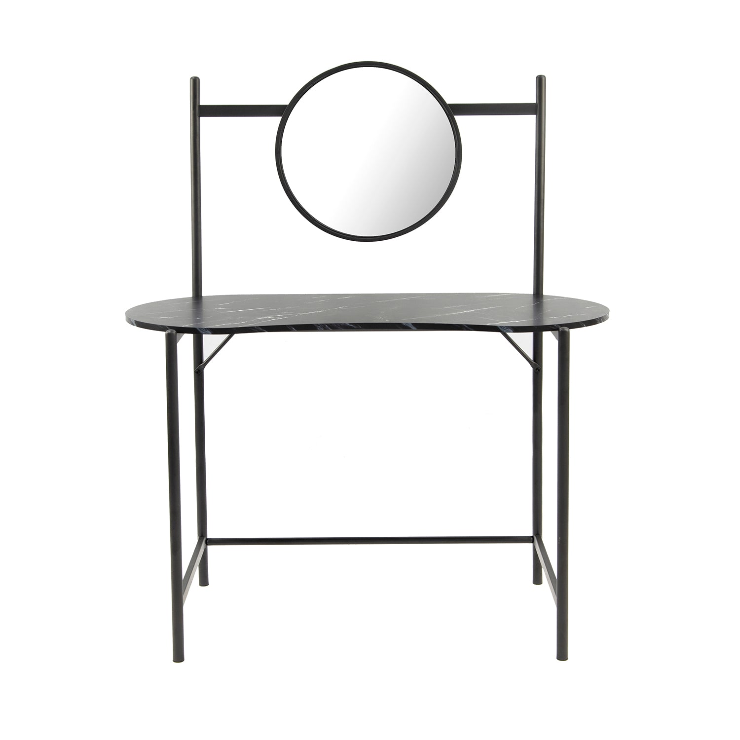 A modern vanity desk in warm grey with a matching round mirror and oval tabletop—perfect for compact bedrooms or dressing spaces.