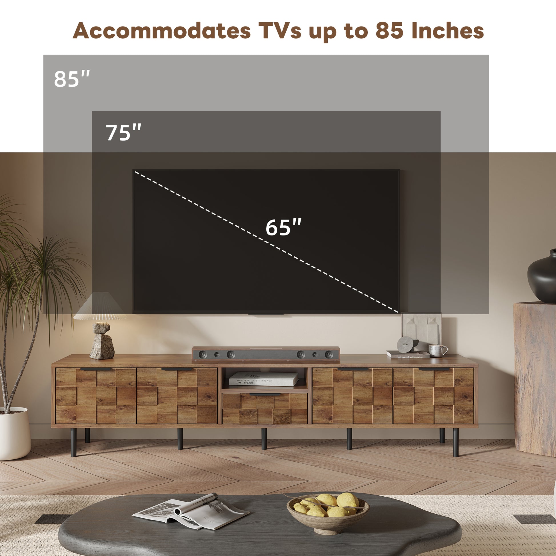 This 78" TV stand features a checkered wood design, L-shaped metal handles, and elevated legs, offering spacious storage with a warm natural look for modern living rooms.