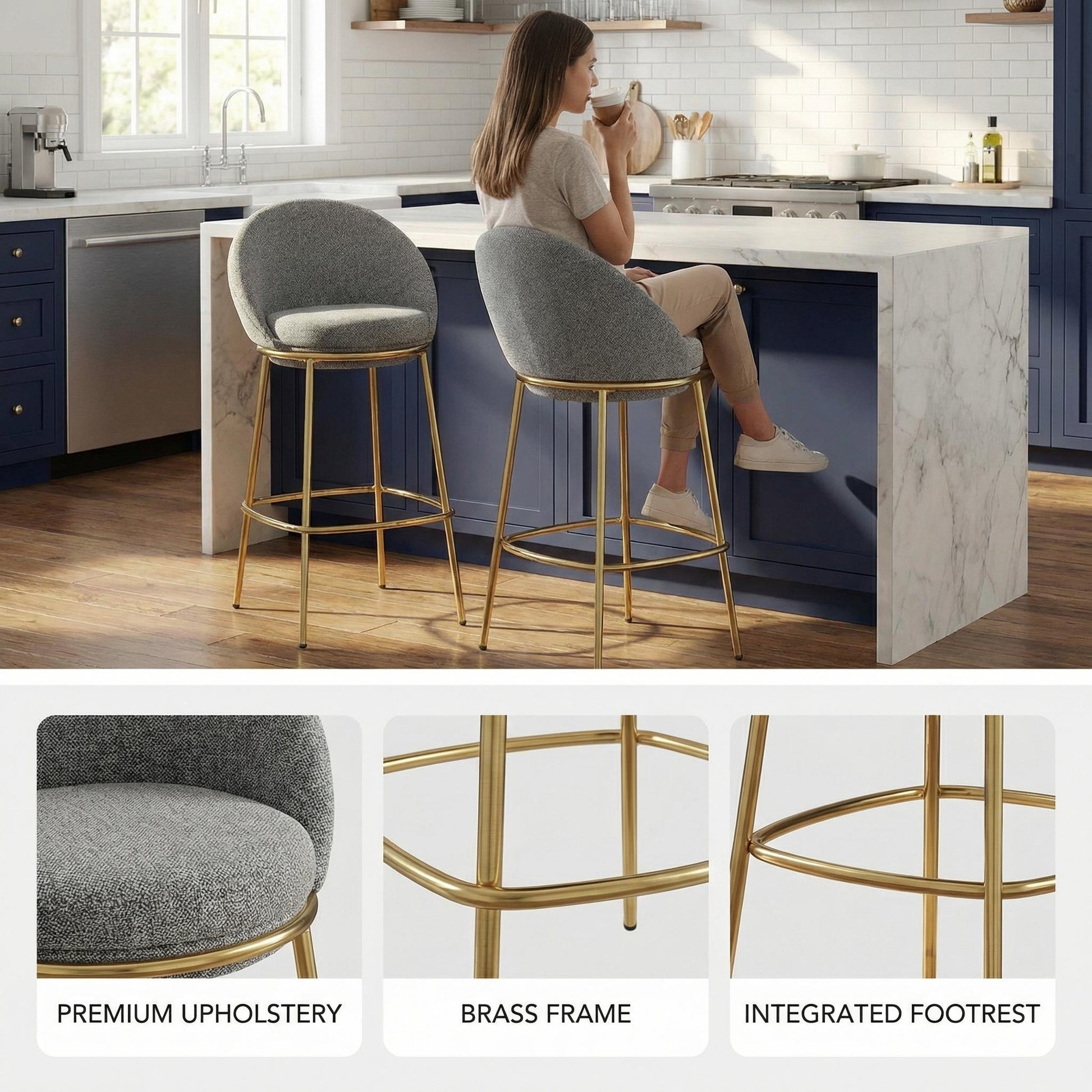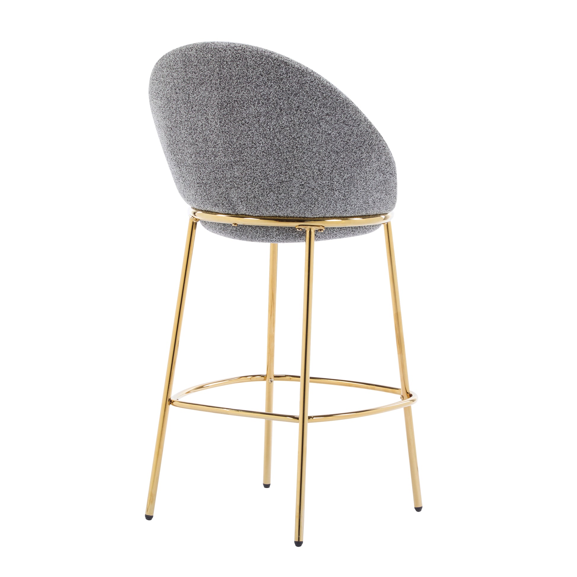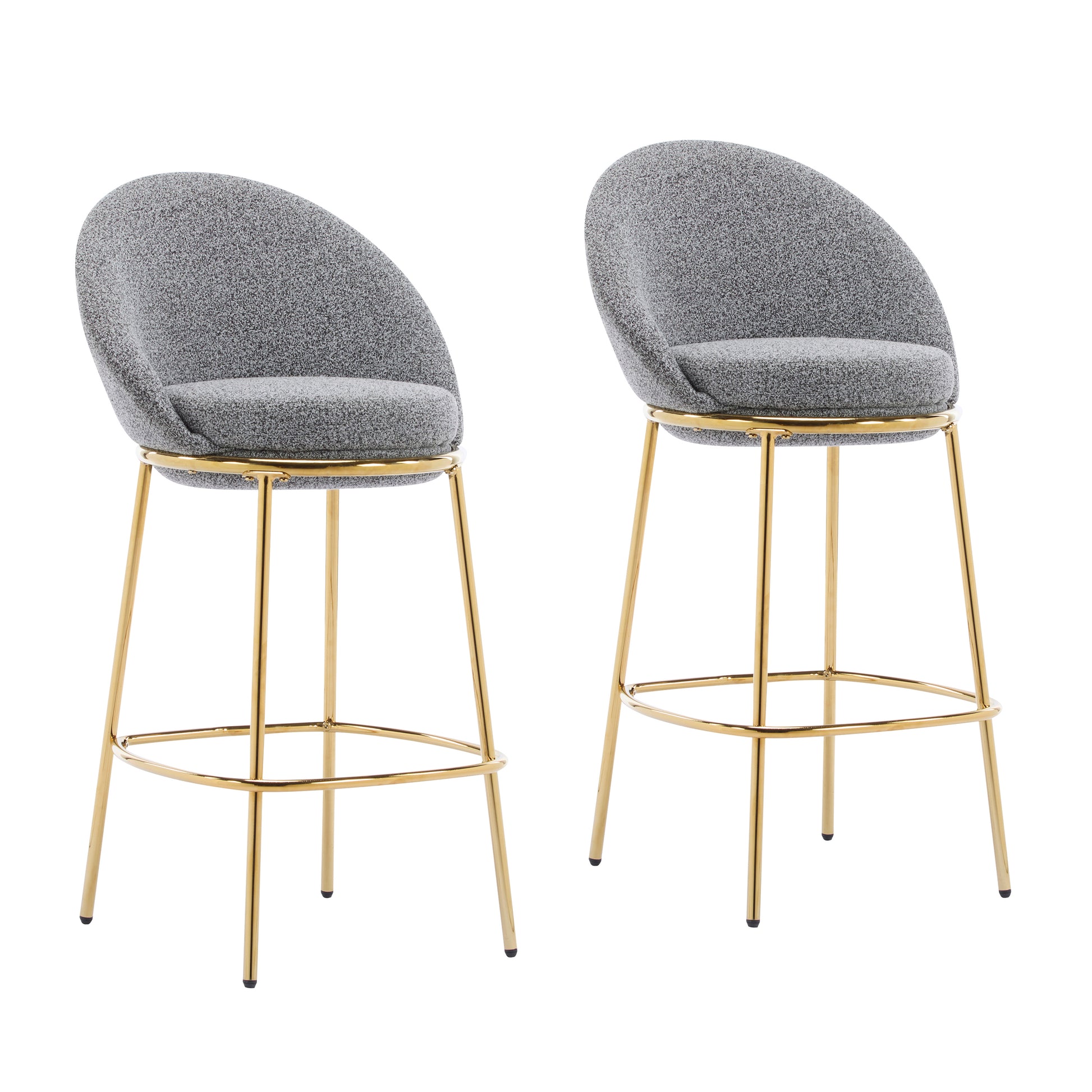Set of 2 bar height stools with plush upholstered seats, supportive low backs, and a sturdy gold-plated metal frame. Perfect for kitchen islands, home bars, or entertaining spaces, these stools offer comfort, style, and easy-care durability for modern living.