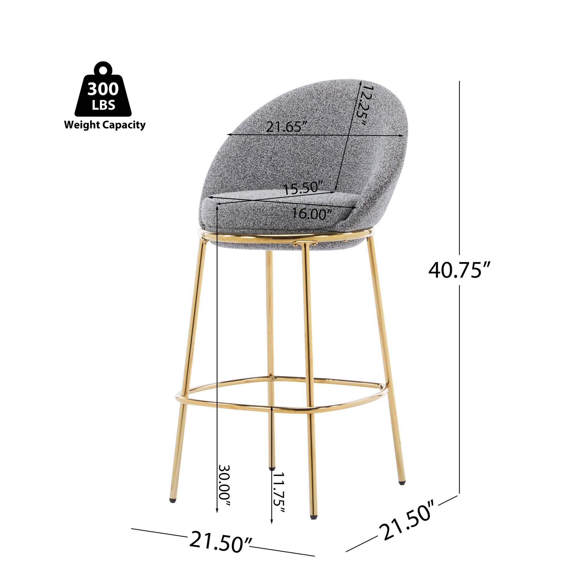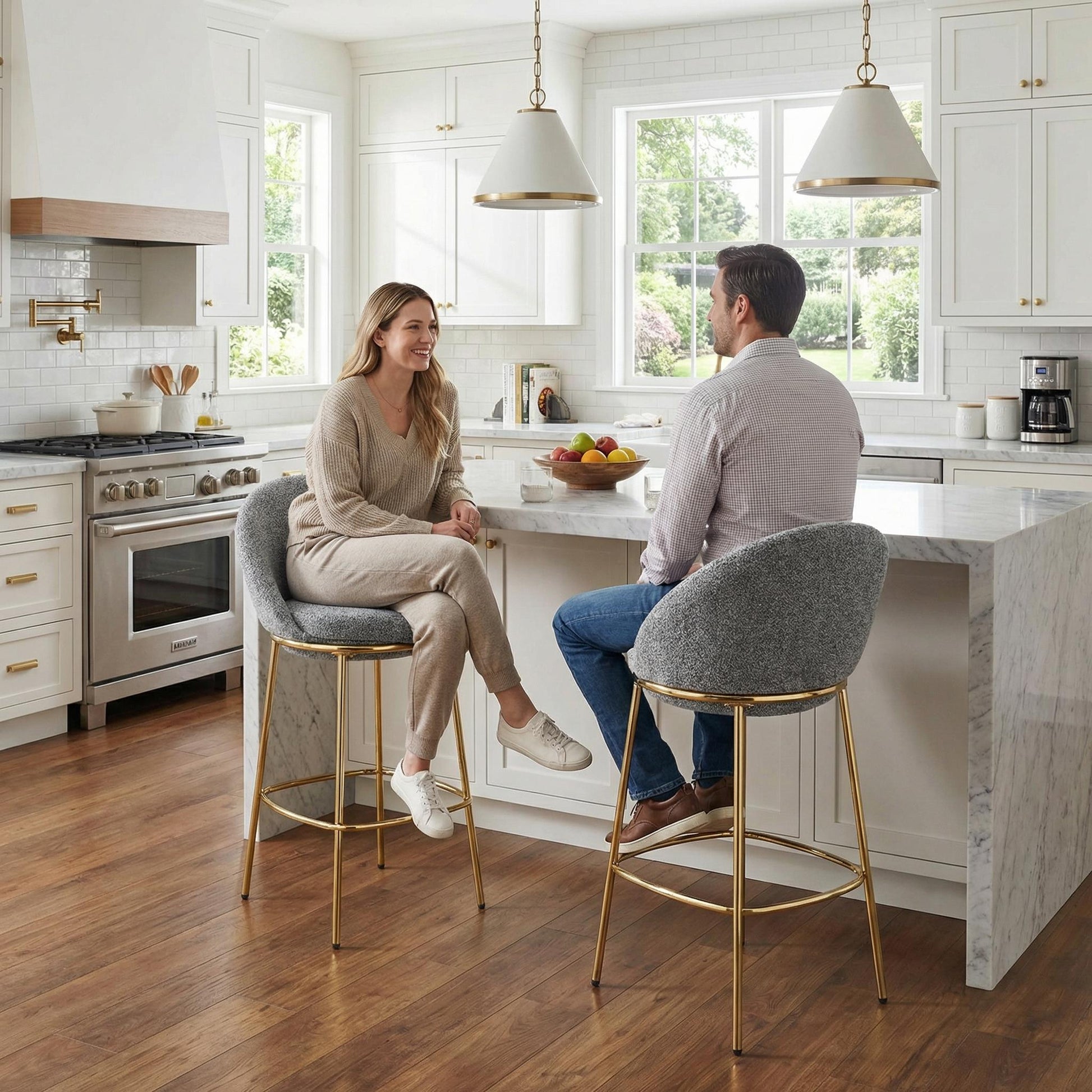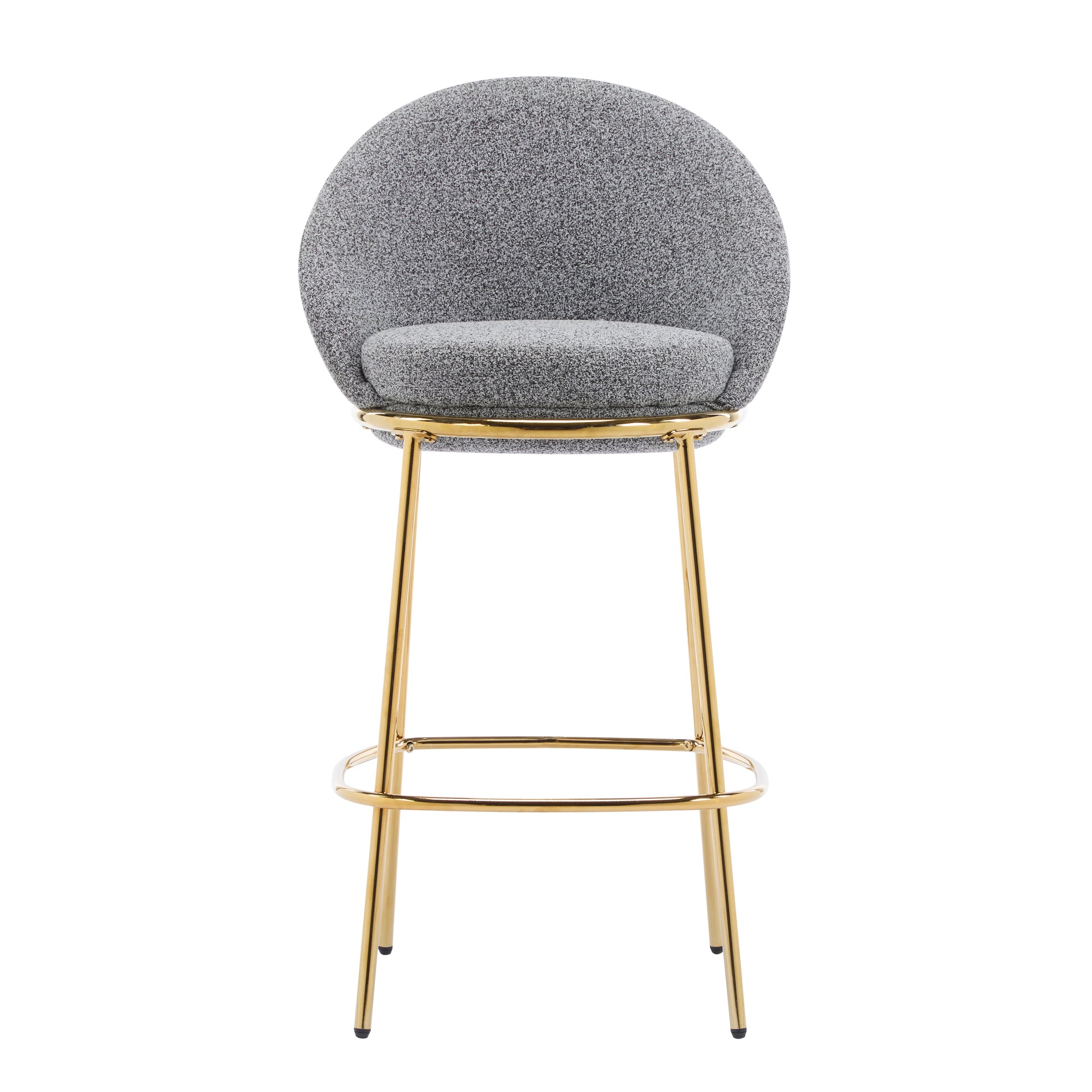 Set of 2 bar height stools with plush upholstered seats, supportive low backs, and a sturdy gold-plated metal frame. Perfect for kitchen islands, home bars, or entertaining spaces, these stools offer comfort, style, and easy-care durability for modern living.