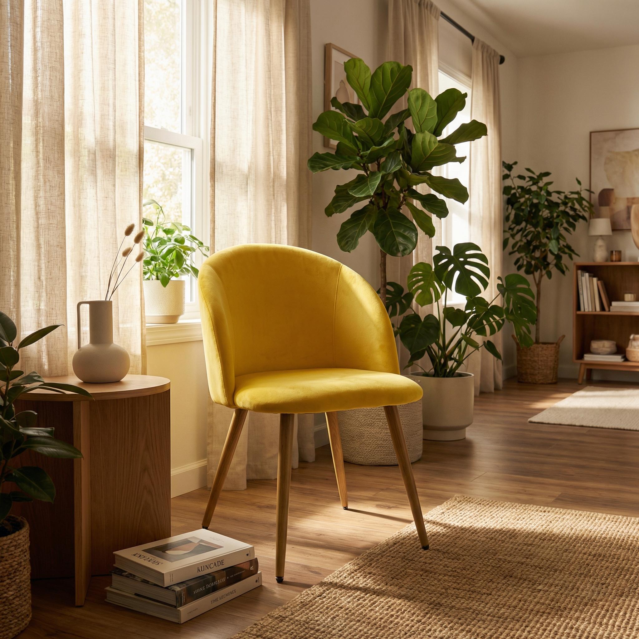 This modern velvet dining chair features a vibrant yellow finish, plush upholstery, and sturdy wood-grain metal legs. Perfect for adding a pop of color and comfort to dining rooms, kitchens, or workspaces.